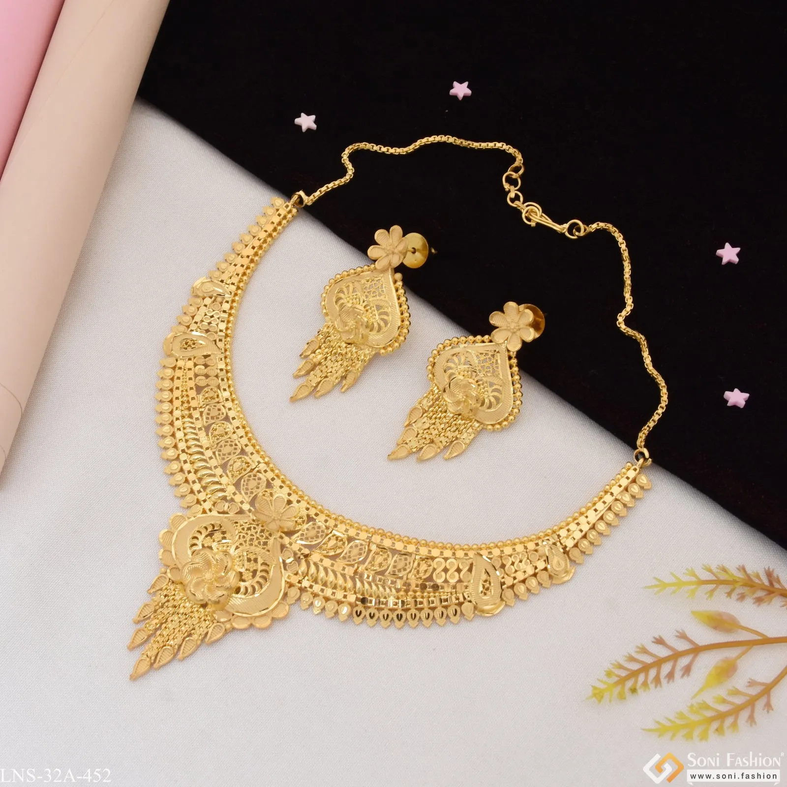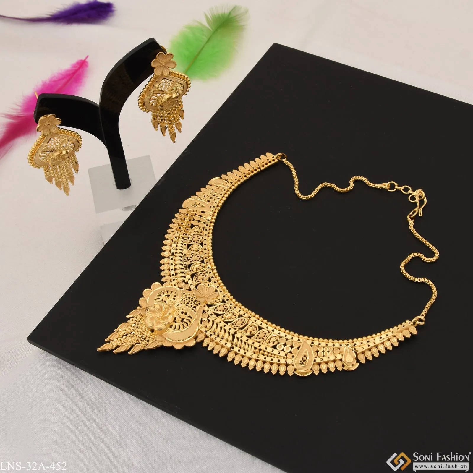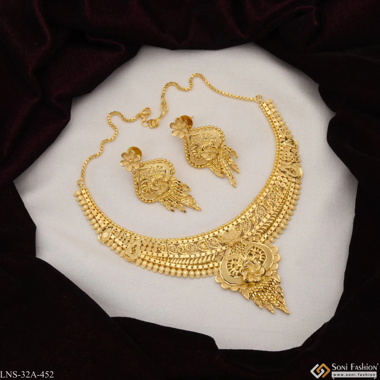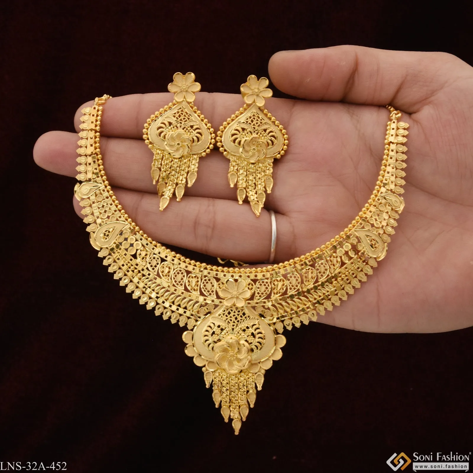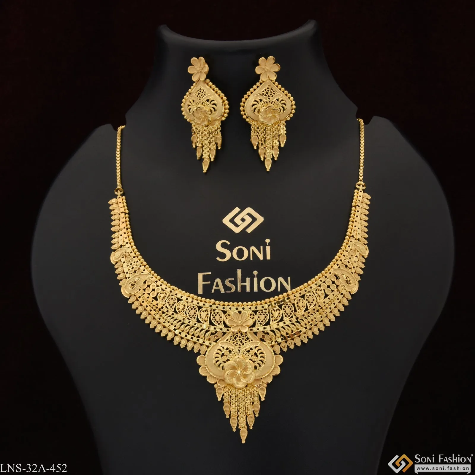 This stunning necklace set is made with high-quality brass and plated with 1 gram of gold for a luxurious look. The textured design adds a unique touch to the shining finish, making it the perfect addition to any outfit. Handmade with precision, this set follows the latest trend in jewelry. Style meets quality with this golden necklace set.