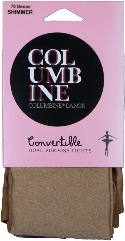 Columbine's shiny shimmer dual-purpose convertible tights come with a hole on the foot bottom so the tights can be rolled up, and the foot can be uncovered if required. They are 70 denier for extra durability, plus no leg line, no gusset, and a reinforced toe.