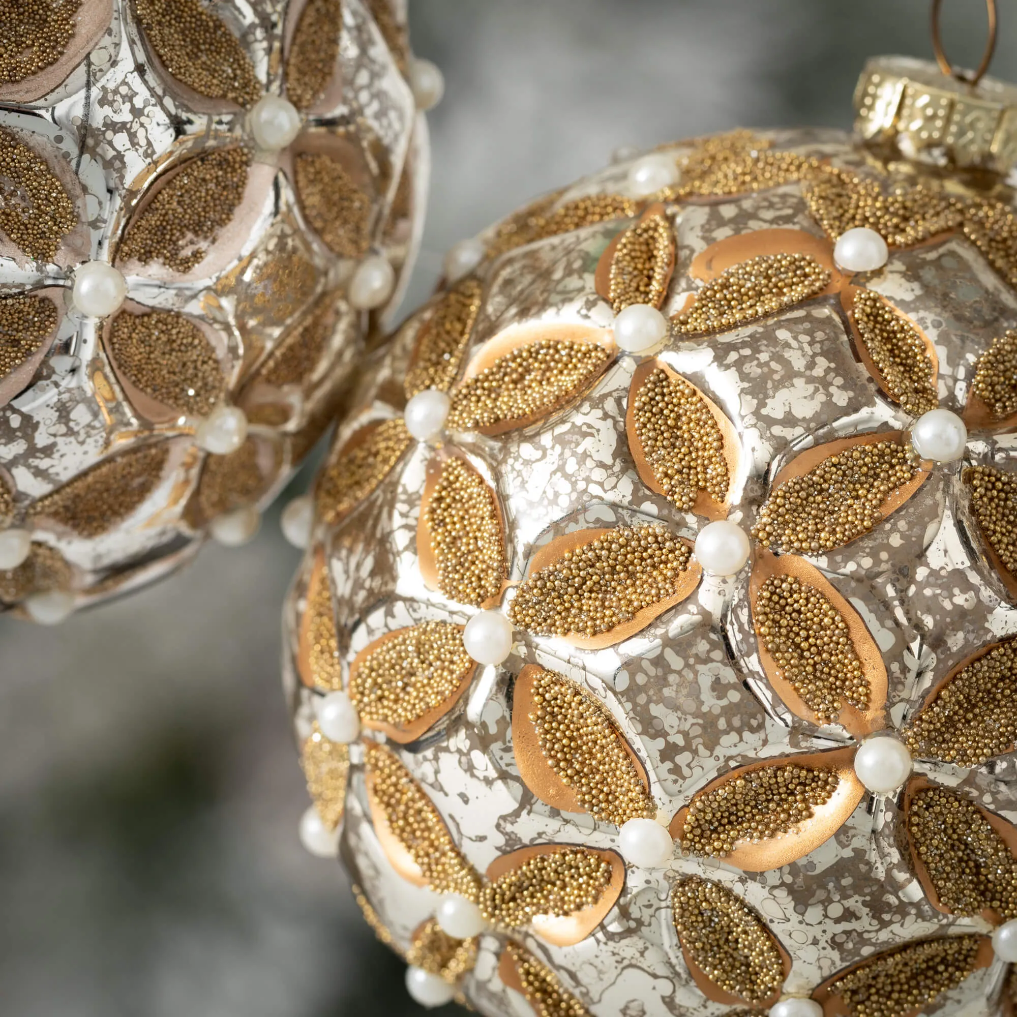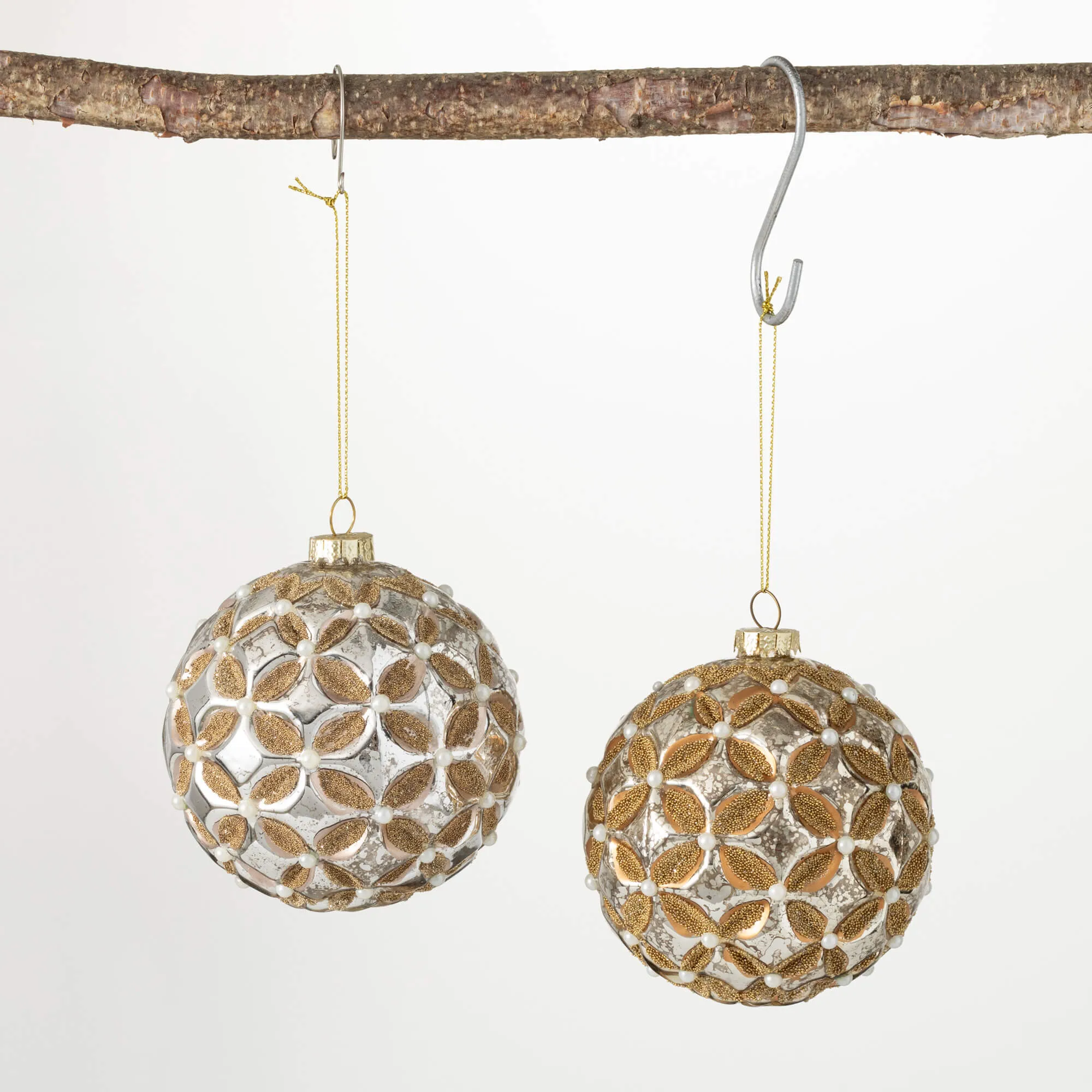 Add a touch of class to your holiday decor this Christmas season with this set of floral patterned beaded glass ornaments. Simply exquisite, these hand-blown and hand-made ornaments feature a floral geometric pattern and pearlescent beadwork for a vintage look. Great for gift giving and creating memories with family and friends.