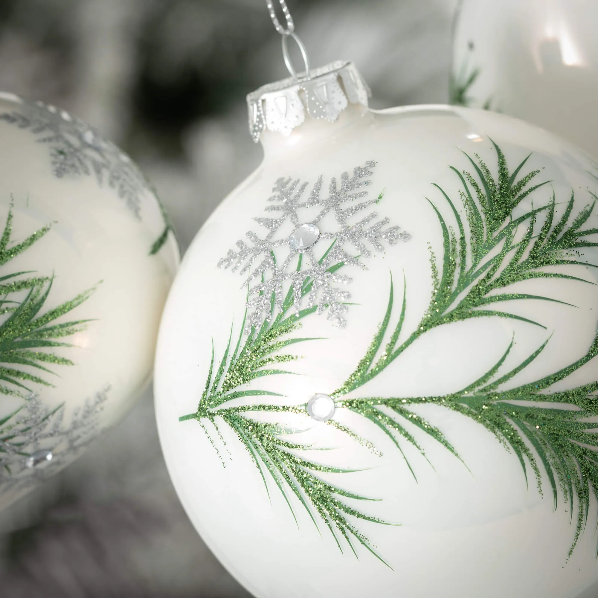 Add a touch of class to your holiday decor this Christmas season with this set of botanical inspired drop ornaments. Elegantly exquisite, these ornaments feature an intricate green botanical design over a white background for a vibrant organic look. Great for gift giving and creating memories with family and friends.