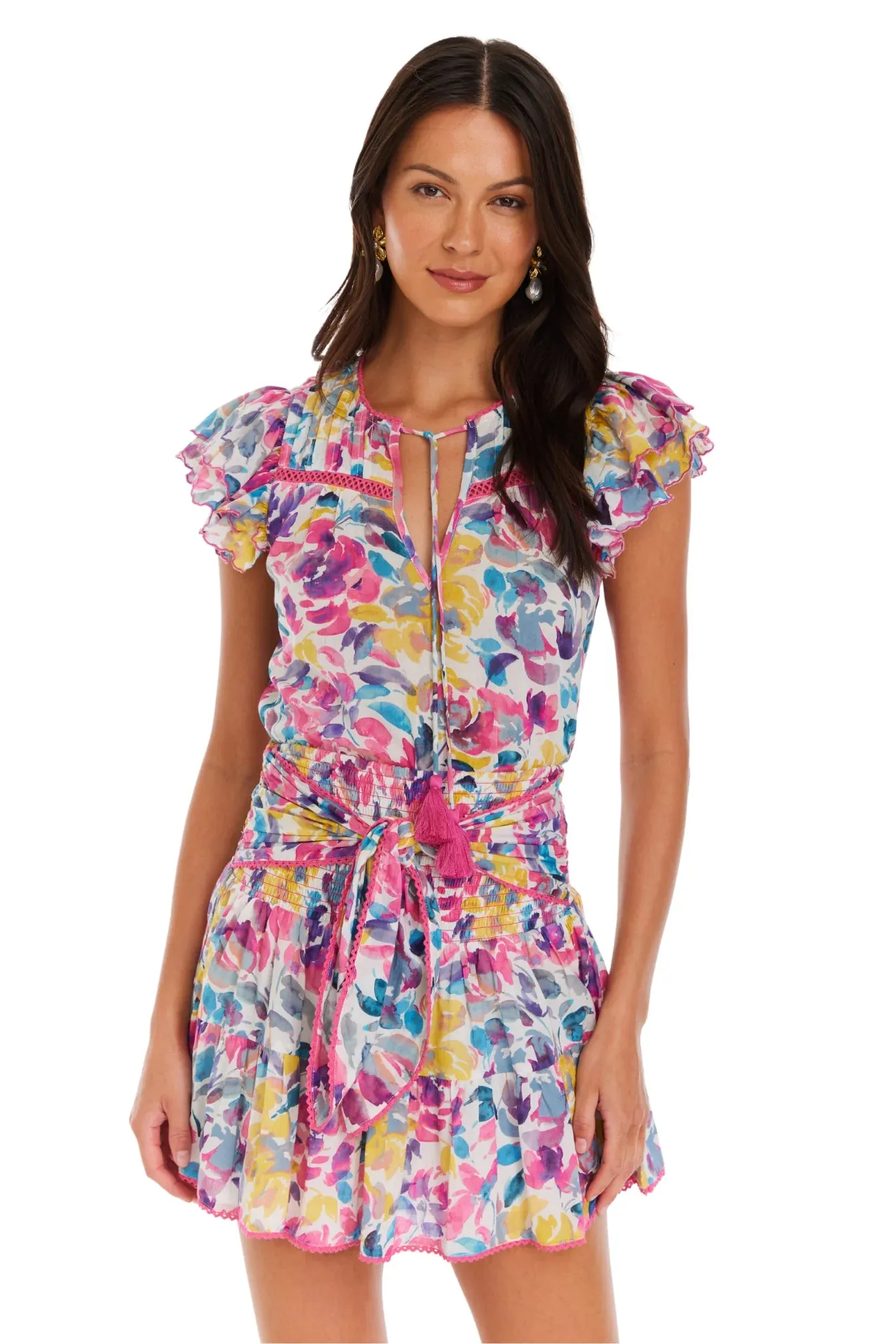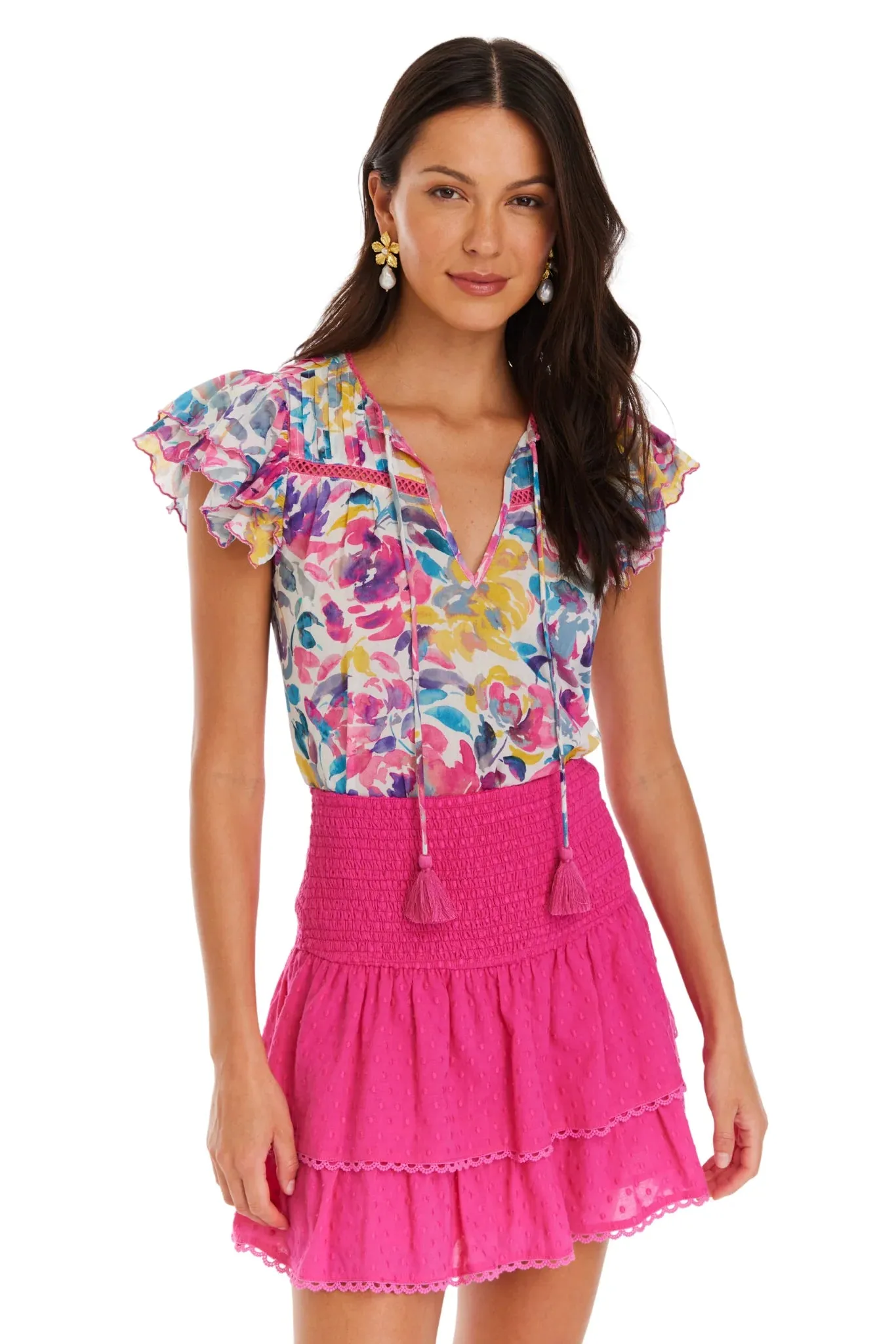 The Alicia Top is an instant classic. Cut in an our funky floral print on a soft cotton fabrication and adorned with lace trim details throughout. The yoke features intricate pintucking and leads to a loose fit body. The split V neck ends in tassel ties with a double ruffle at the shoulder. Make it a matching set with the Chase Mini Skirt. Unlined.