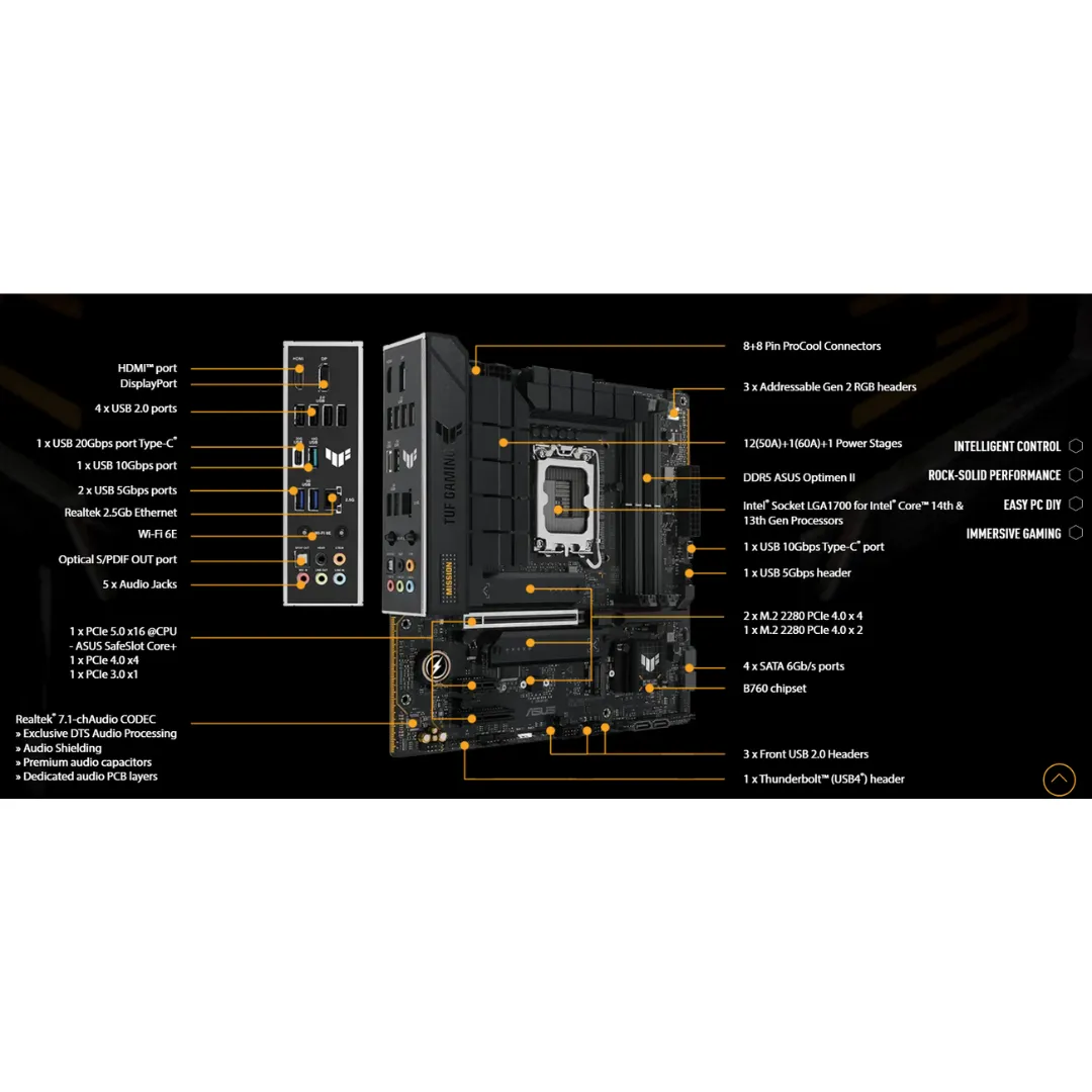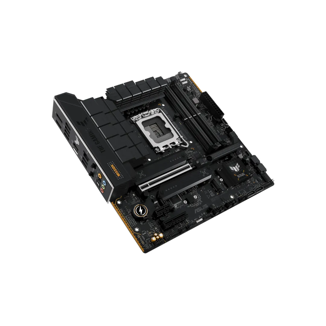 TUF GAMING B760M-PLUS WIFI II takes all the essential elements of the latest Intel® processors and combines them with game-ready features and proven durability. Engineered with military-grade components, an upgraded power solution and a comprehensive cooling system, this motherboard goes beyond expectations with rock-solid performance for marathon gaming. TUF GAMING motherboards also undergo rigorous endurance testing to ensure that they can handle conditions where others may fail. Aesthetically, this model incorporates an embossed nameplate and geometric design elements to reflect the dependability and stability that defines the TUF GAMING series. This platform delivers the power and connectivity that advanced AI PC applications demand.