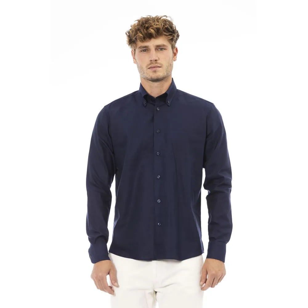 Baldinini Trend delivers timeless elegance with this impeccably tailored blue shirt. Perfectly balancing classic style with a touch of modernity, this piece is crafted from a luxurious blend of cotton and elastane to ensure both comfort and a flattering fit. The shirt features a sophisticated button-down neck, neatly fastening with buttons along the front, complemented by button closures on the cuffs for a refined finish. This shirt seamlessly transitions from business to casual wear, making it an essential addition to your wardrobe.