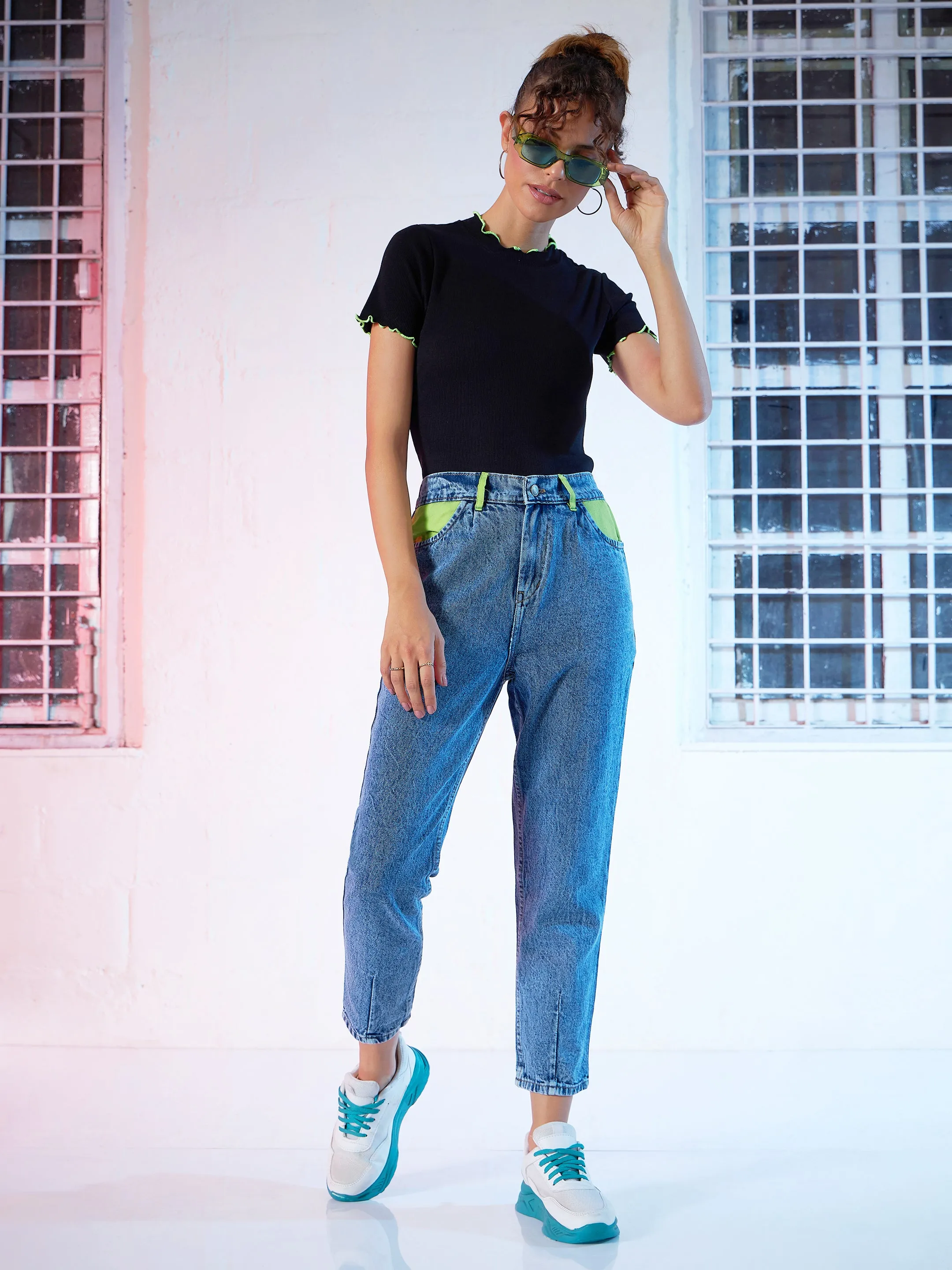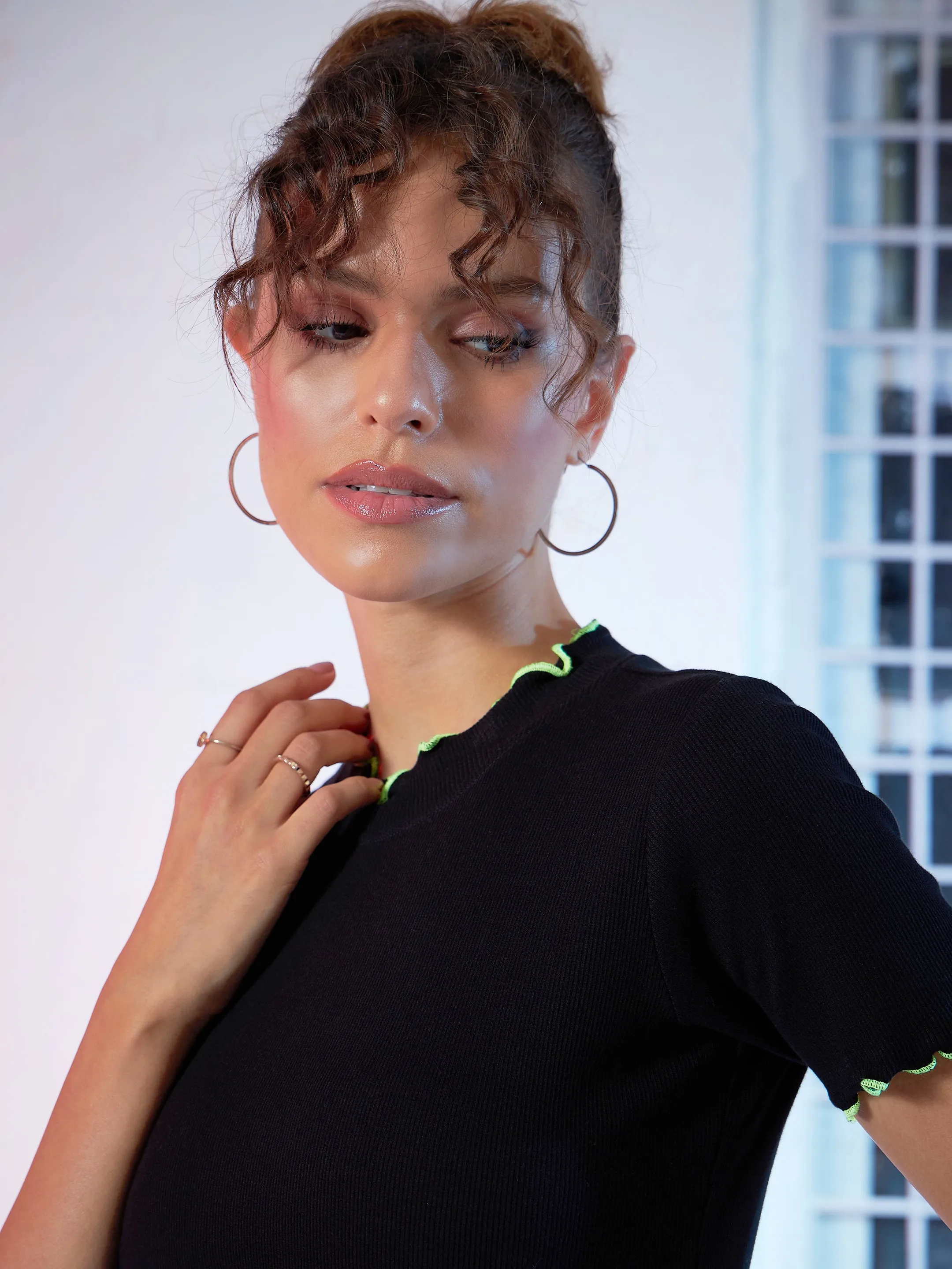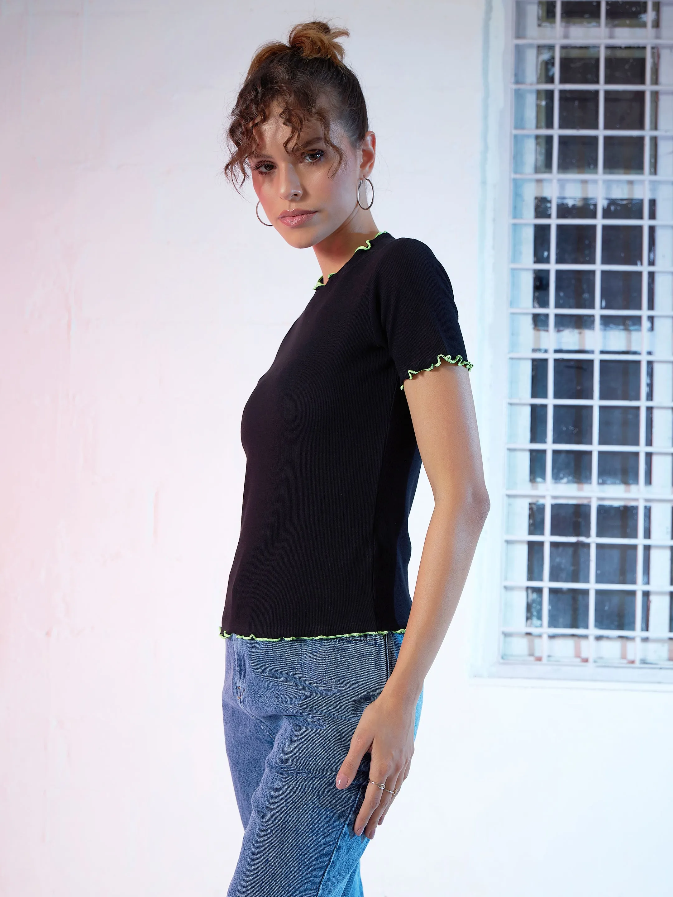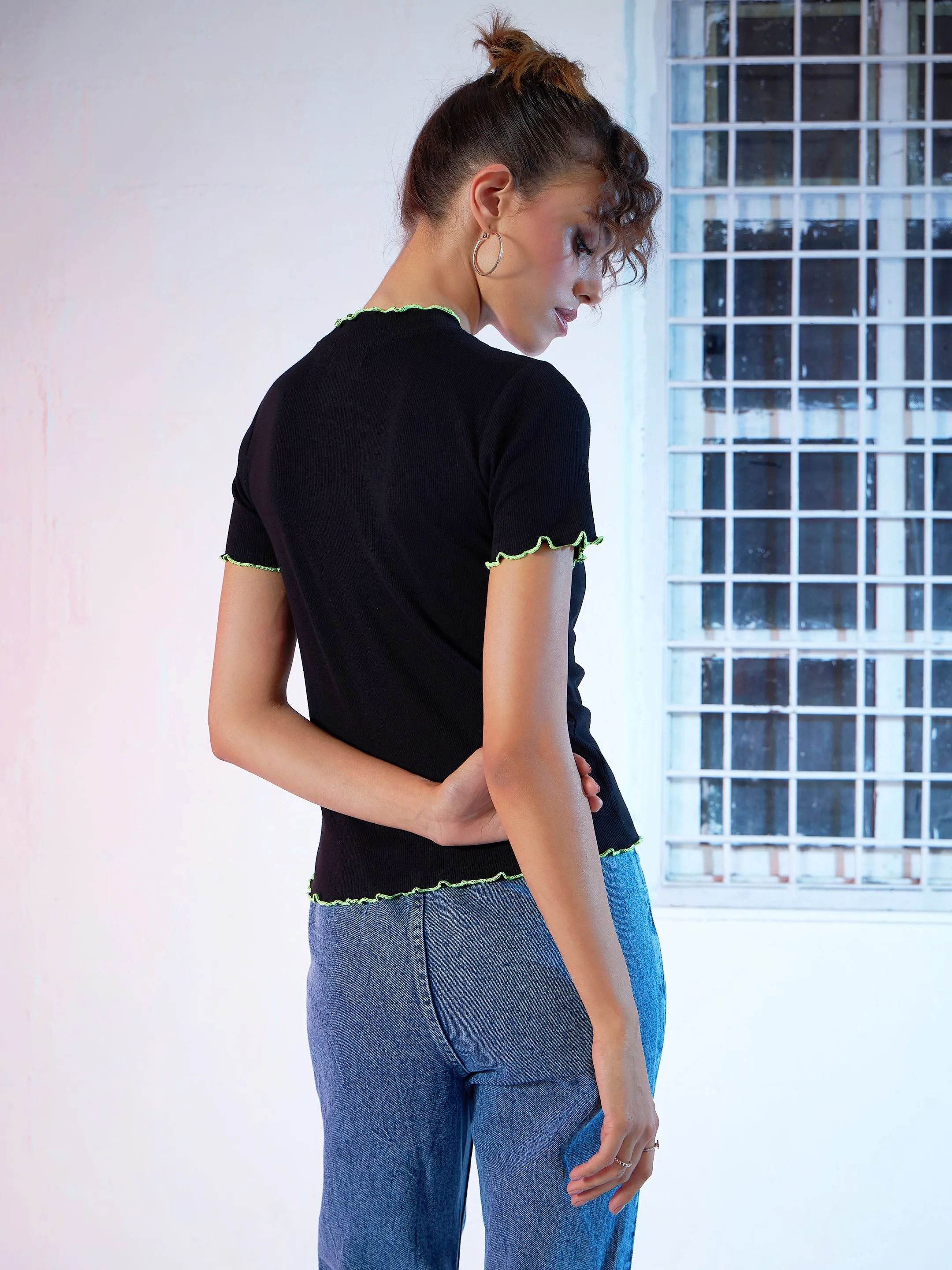 Black Rib Contrast Stitch High Neck Top, in Cotton Rib fabric, Unlined, Regular Length, Comfort Fit, No Closure, Straight Hemline and features Neon Contrast Thread Detail