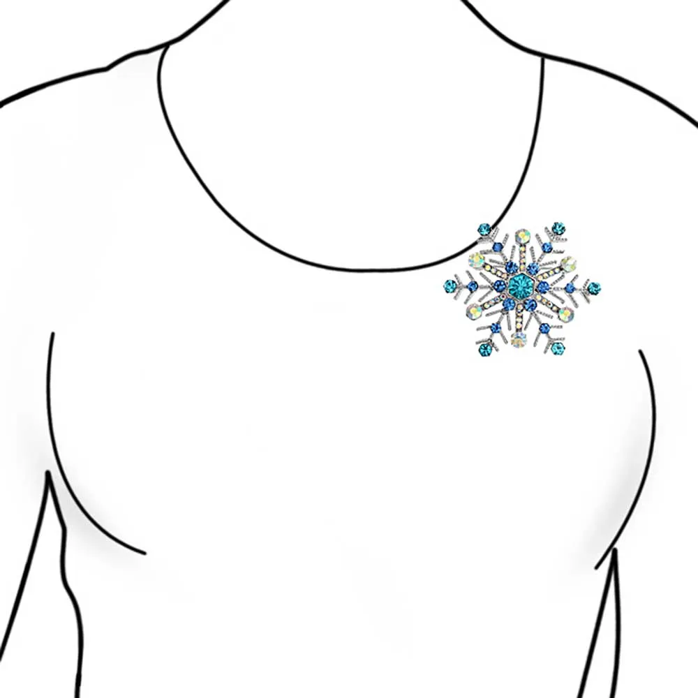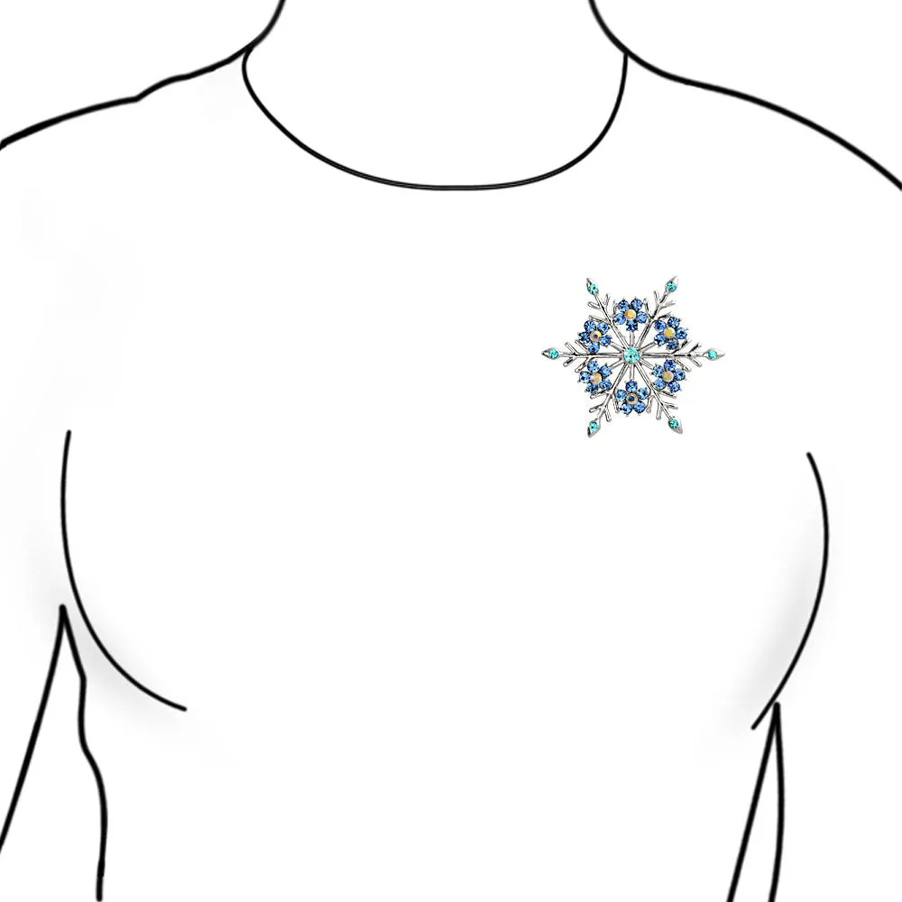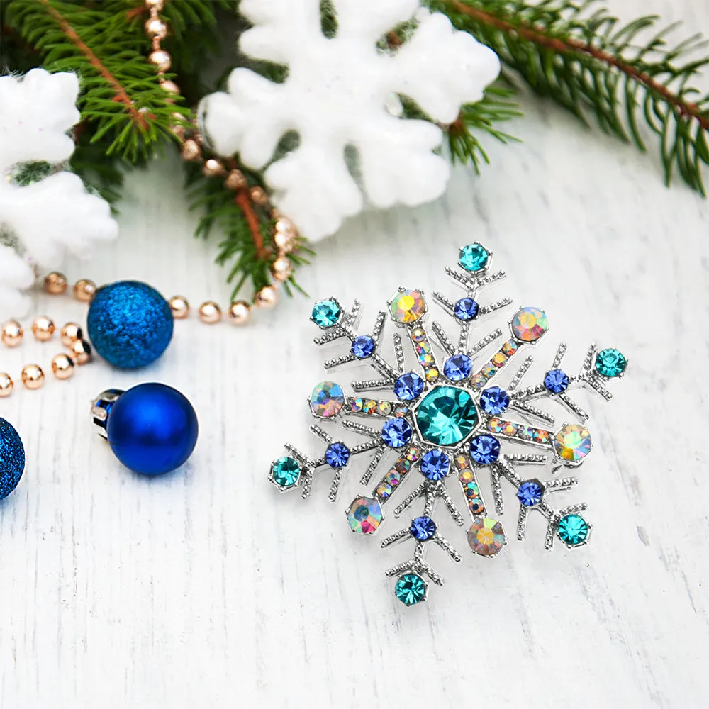 Elevate your holiday look with our exquisite blue crystal snowflake brooch. This stunning snowflake jewelry is perfect for women of all ages. Vibrant blue crystals add elegance and sparkle to any outfit. Ideal as a Hanukkah pin or for blue jewelry lovers. Versatile brooch can be used as a scarf, purse, or hat pin. Features six flower clusters with simulated blue topaz and aurora borealis crystals. A must-have addition to any flower pin collection. Perfect holiday pin for fashion-forward ladies. Don't miss this cherished piece for your jewelry box.
