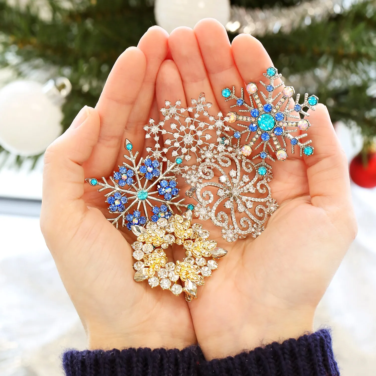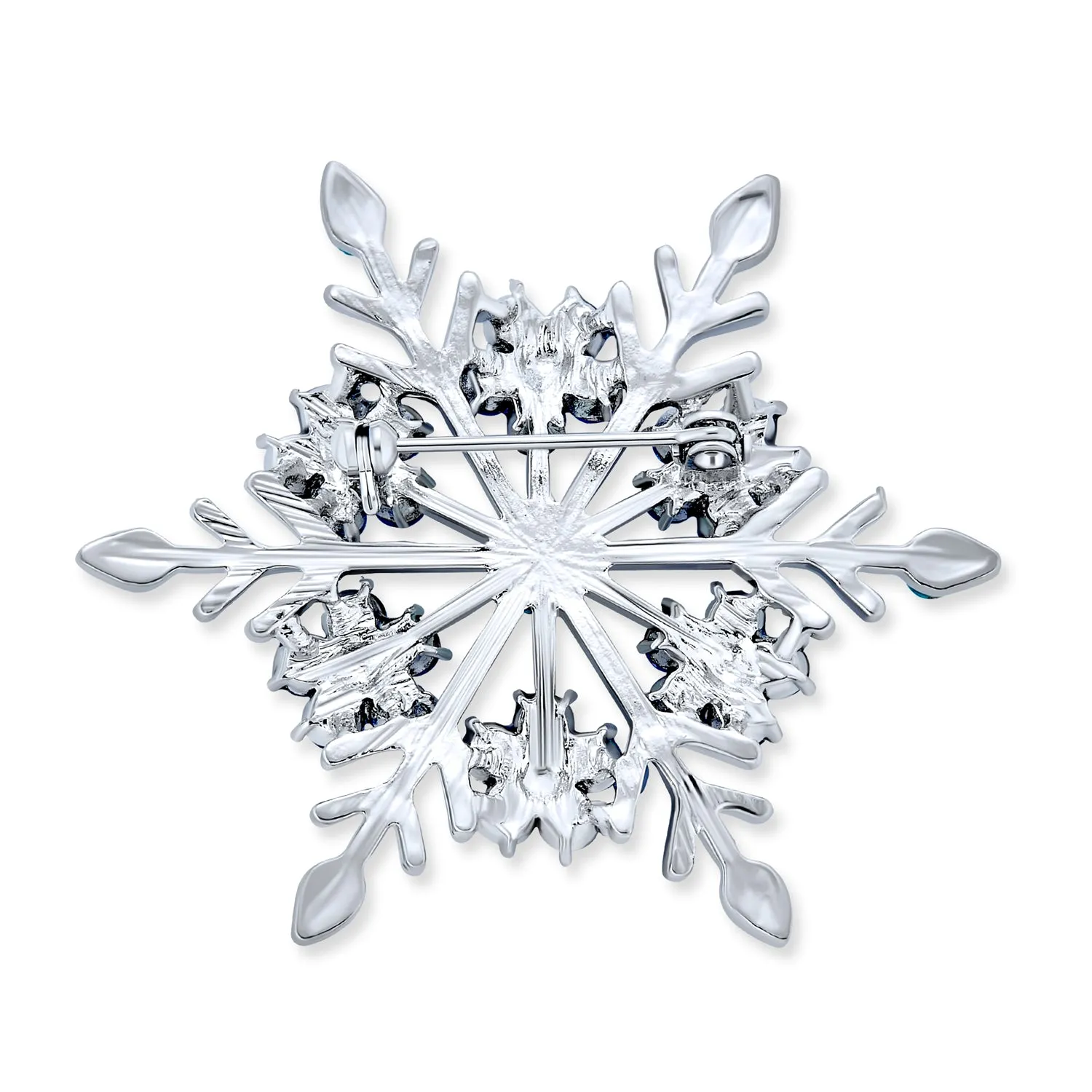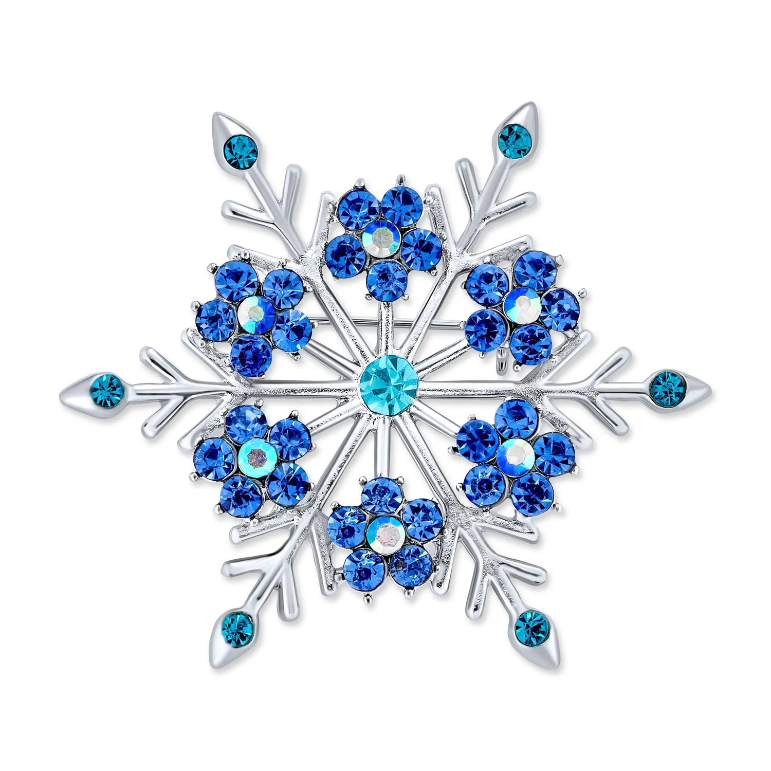 Elevate your holiday look with our exquisite blue crystal snowflake brooch. This stunning snowflake jewelry is perfect for women of all ages. Vibrant blue crystals add elegance and sparkle to any outfit. Ideal as a Hanukkah pin or for blue jewelry lovers. Versatile brooch can be used as a scarf, purse, or hat pin. Features six flower clusters with simulated blue topaz and aurora borealis crystals. A must-have addition to any flower pin collection. Perfect holiday pin for fashion-forward ladies. Don't miss this cherished piece for your jewelry box.