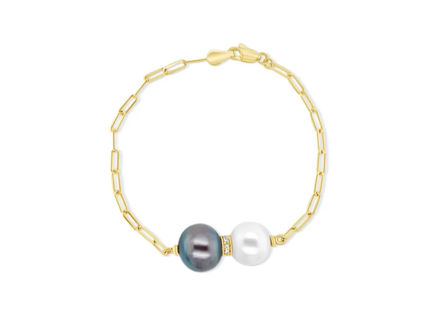 Delicately crafted in 18kt yellow gold, this bracelet features exquisite White South Sea pearl (10.34mm), Black South Sea pearl (11.48mm) and 6 round Diamonds 0.06 cts. A harmonious blend of elegance and sophistication, perfect for those who cherish timeless beauty with a modern twist.