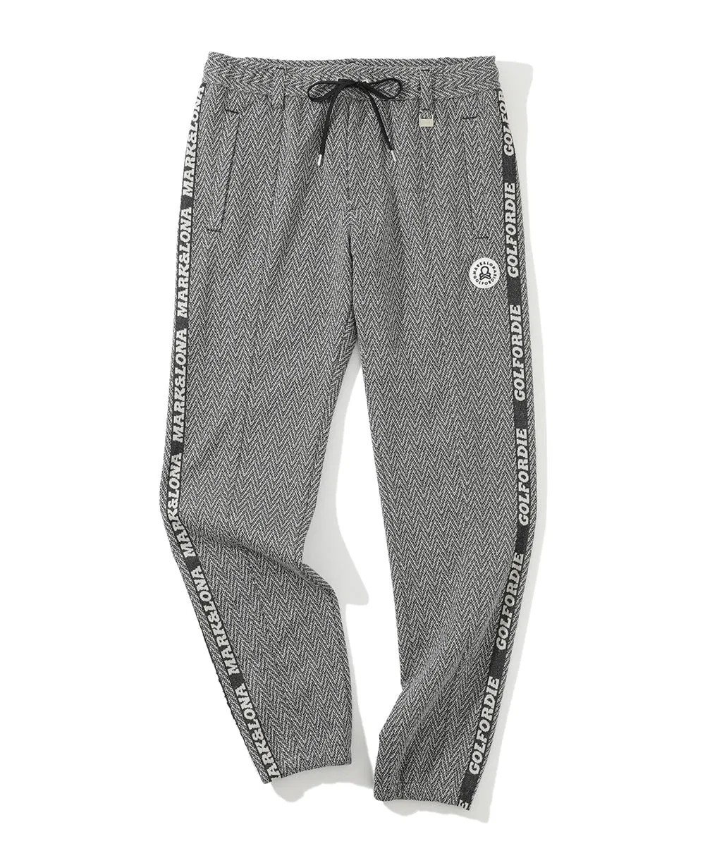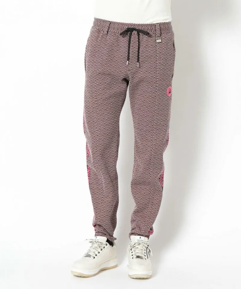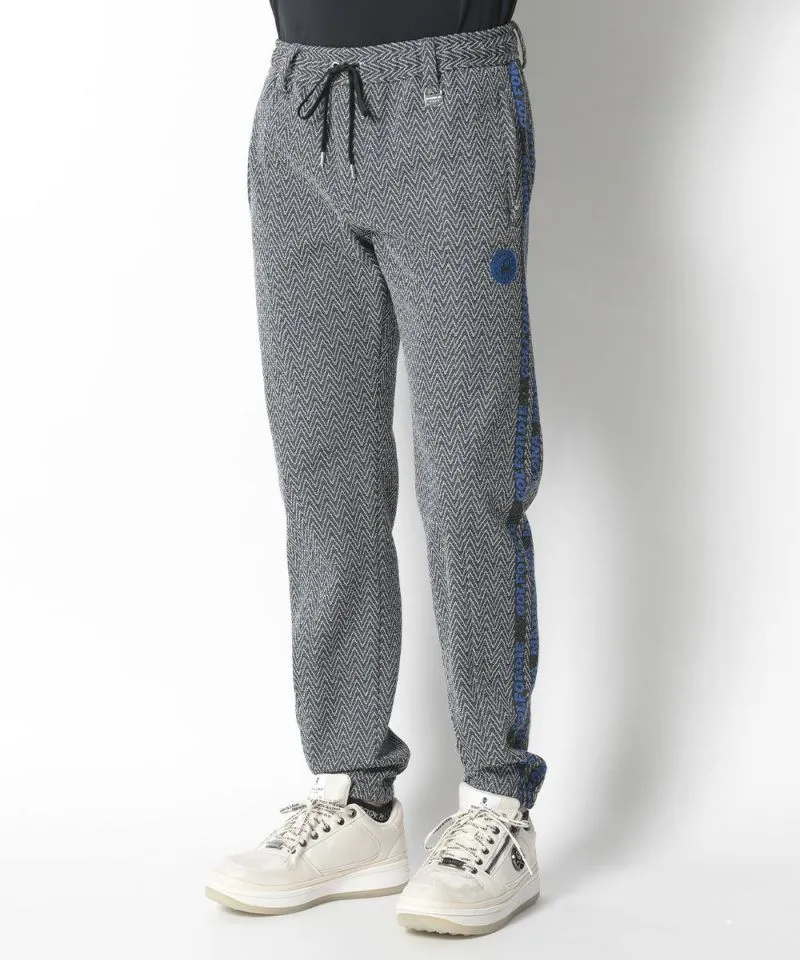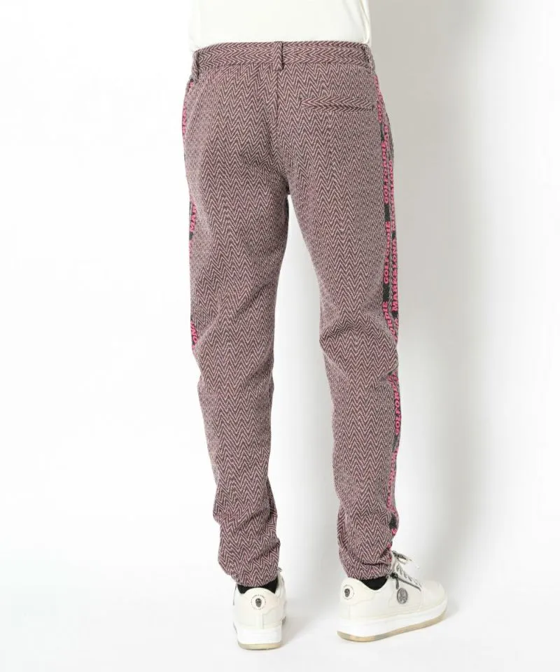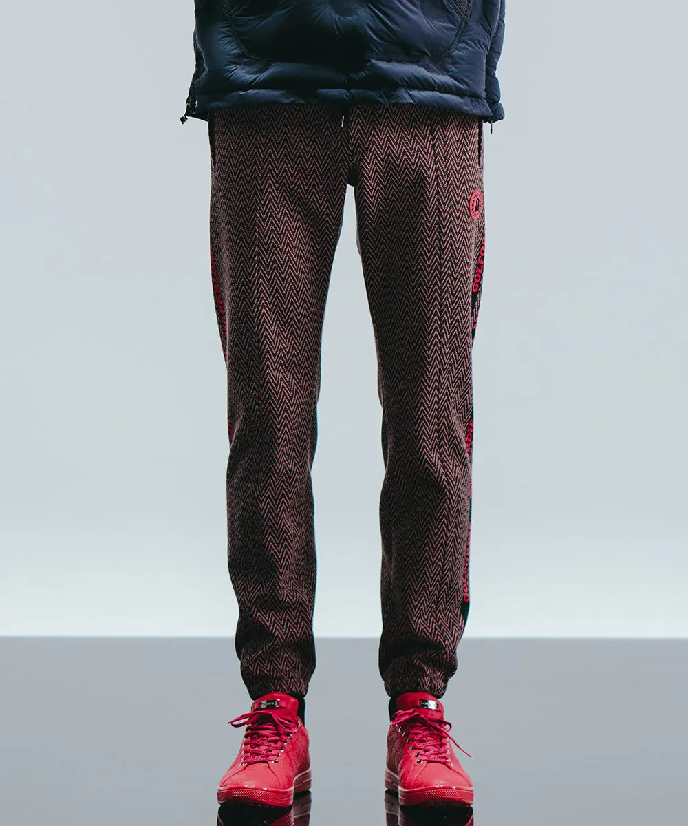 Easy pants with a classic original herringbone pattern. Mini charm with engraved logo on left loop and blank skull circle patch on left thigh. Neon-colored logos on both sides in the shape of side emblems add a sporty accent. The relaxed fit silhouette is roomy around the hips and well cinched toward the hem.