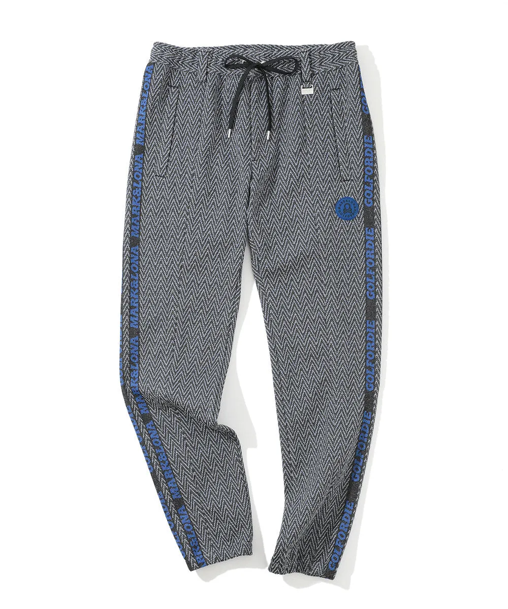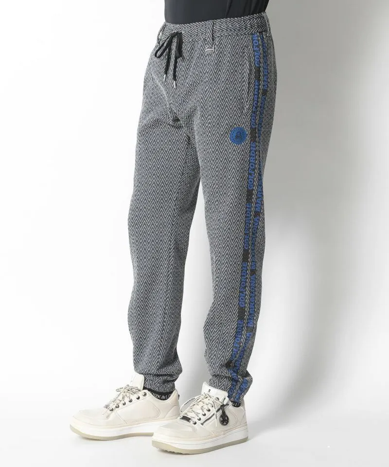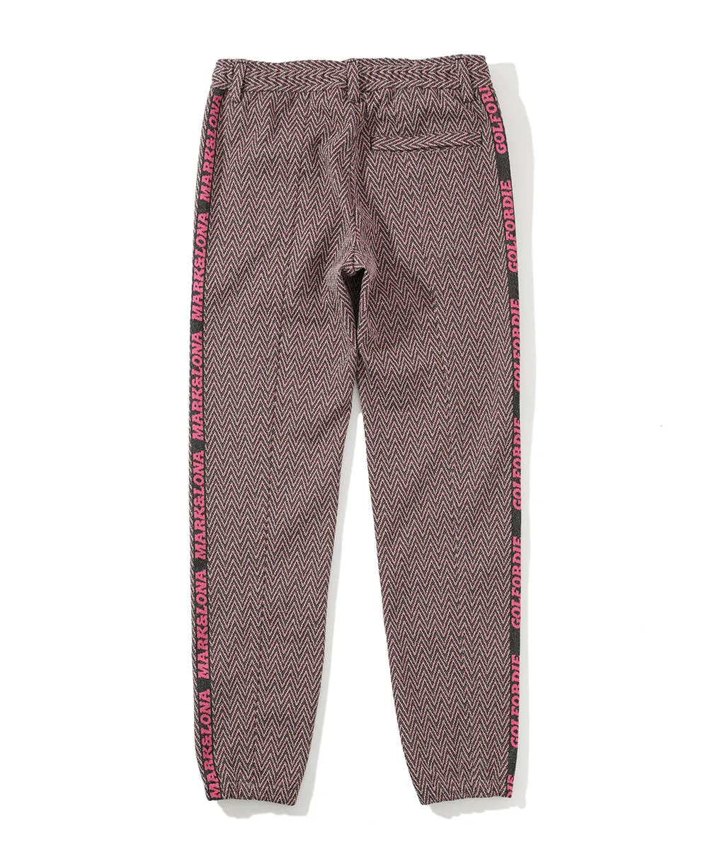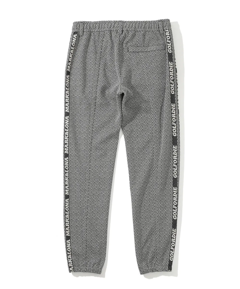 Easy pants with a classic original herringbone pattern. Mini charm with engraved logo on left loop and blank skull circle patch on left thigh. Neon-colored logos on both sides in the shape of side emblems add a sporty accent. The relaxed fit silhouette is roomy around the hips and well cinched toward the hem.