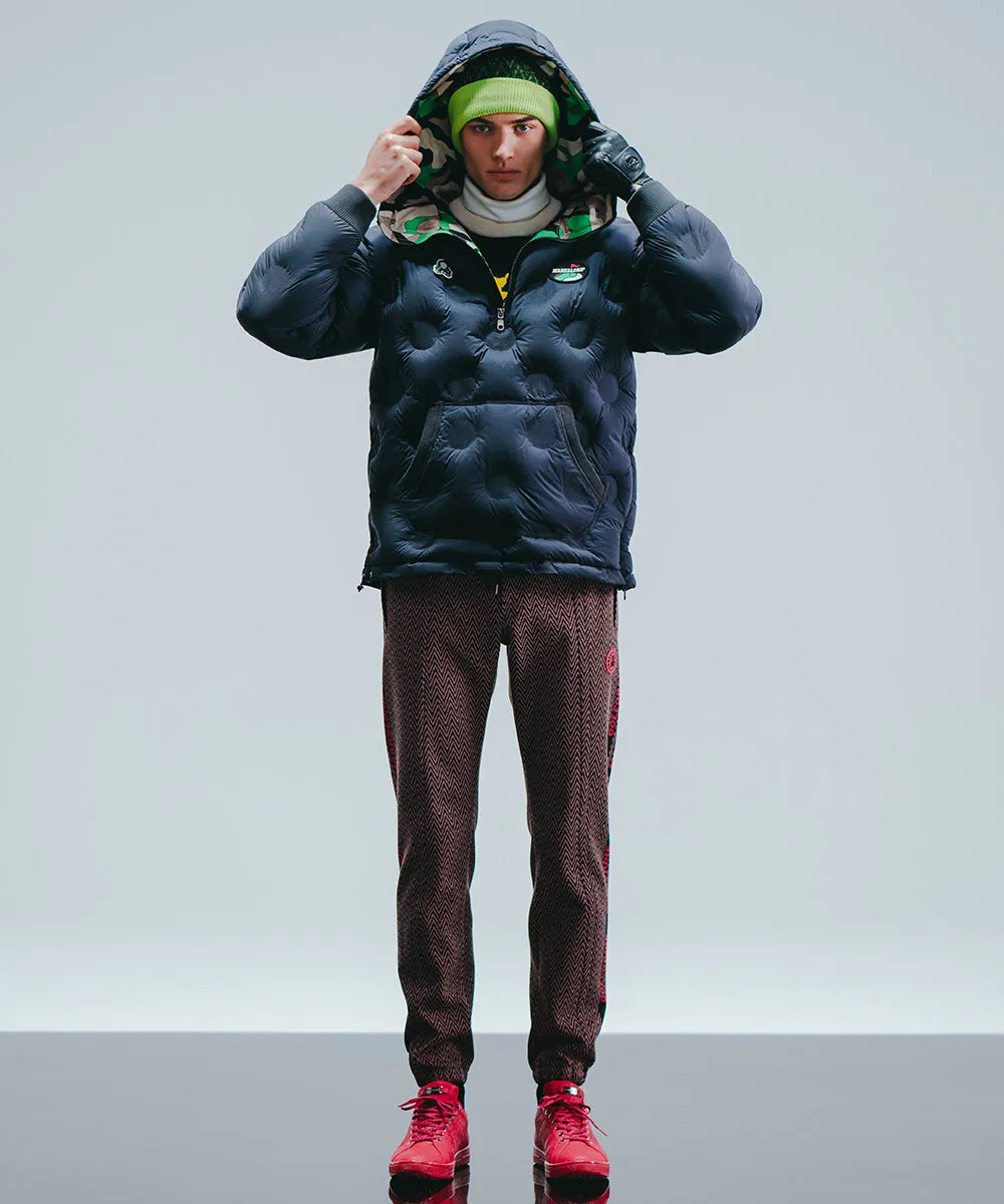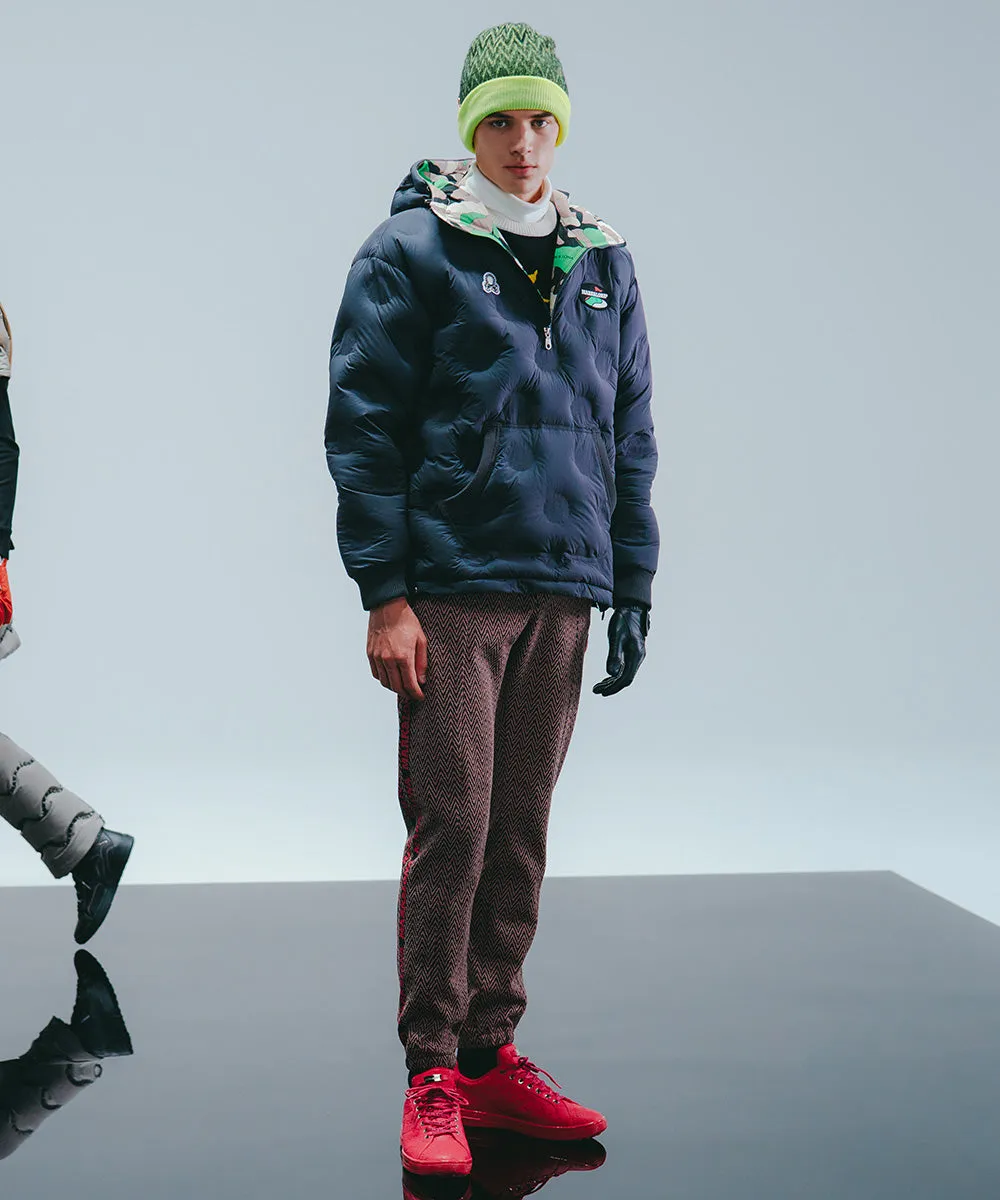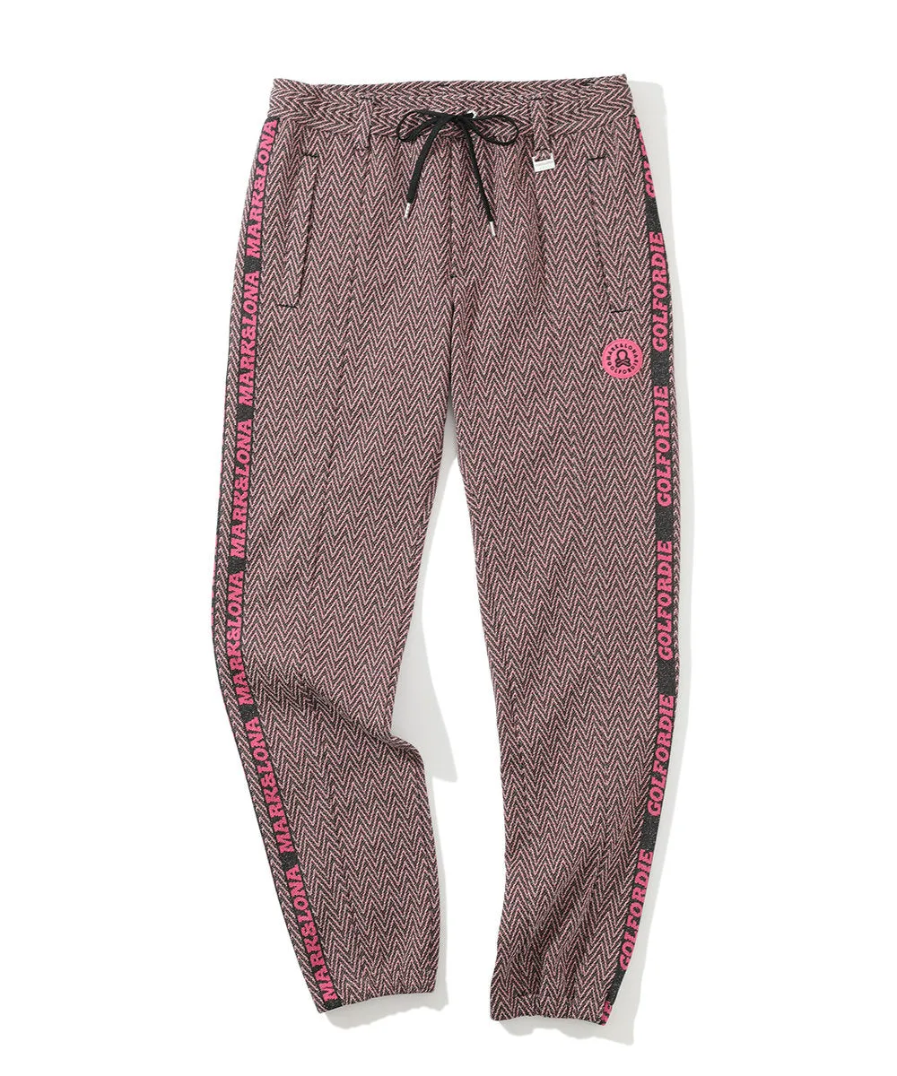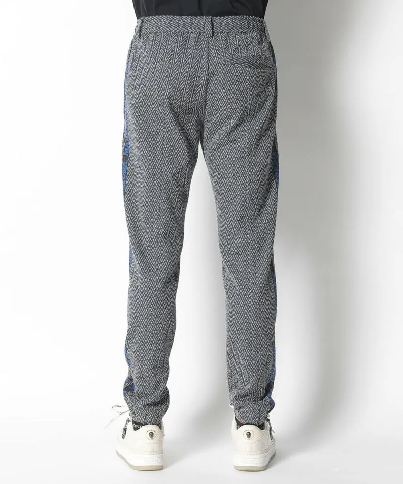 Easy pants with a classic original herringbone pattern. Mini charm with engraved logo on left loop and blank skull circle patch on left thigh. Neon-colored logos on both sides in the shape of side emblems add a sporty accent. The relaxed fit silhouette is roomy around the hips and well cinched toward the hem.
