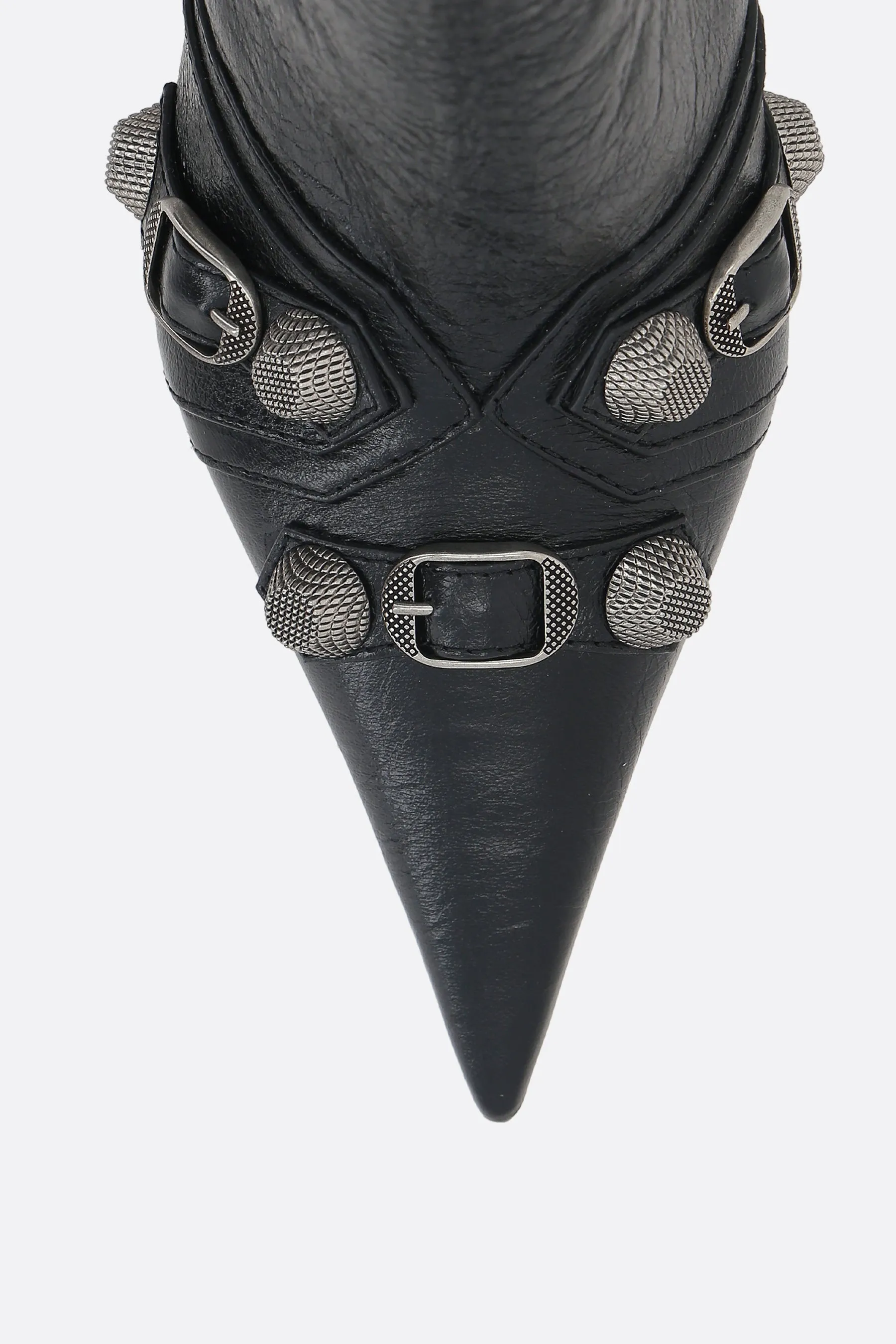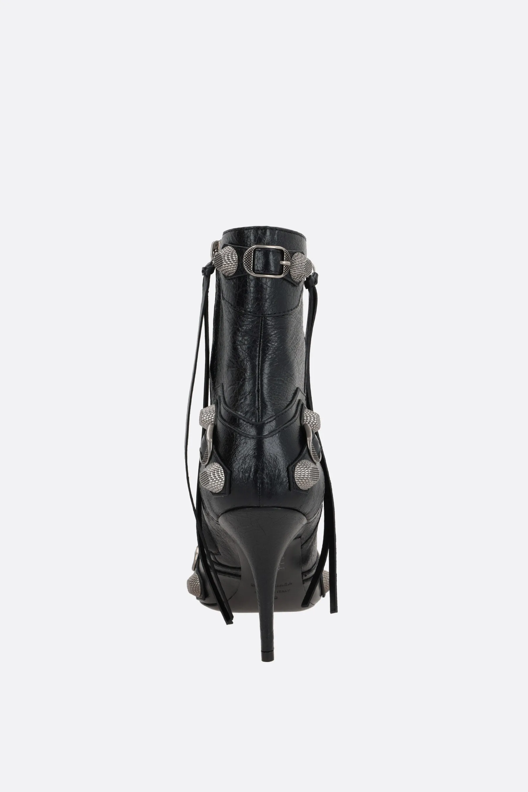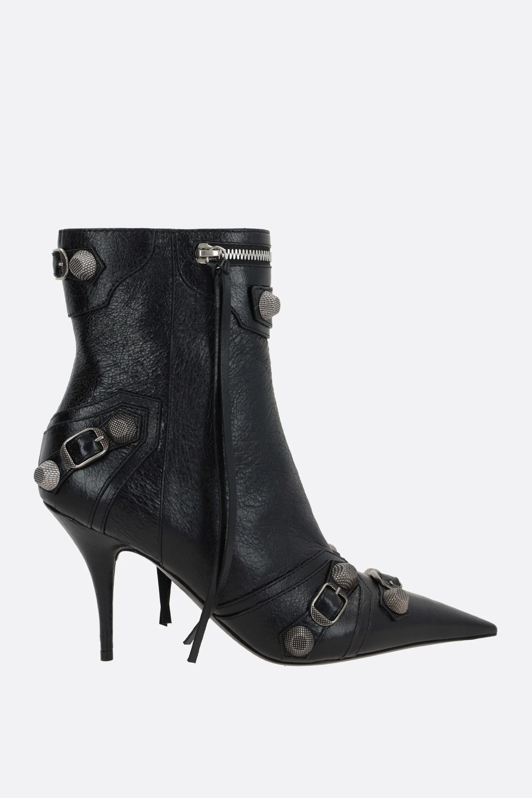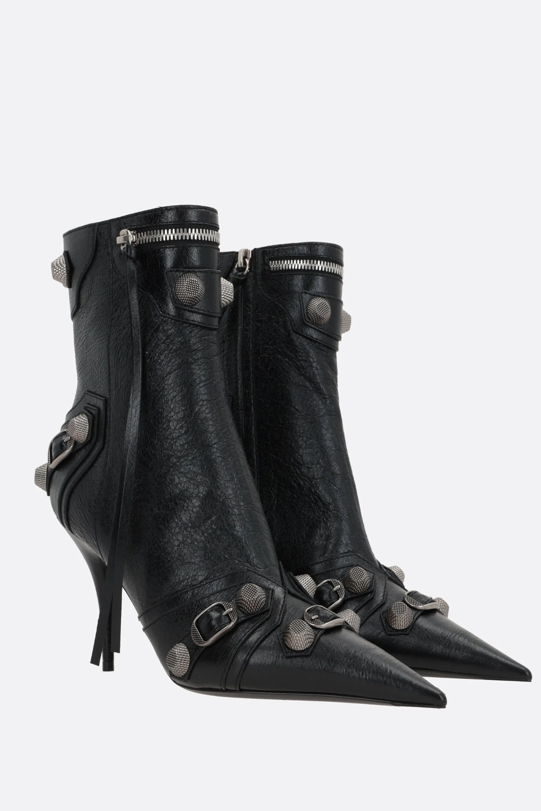 Balenciaga's ankle boots crafted in black Arena leather embellished by antique silver-tone metal studs and buckles. Featuring a point-toe silhouette, side zip fastening, leather lining and leather sole. The design is completed by a leather-covered stiletto heel.
