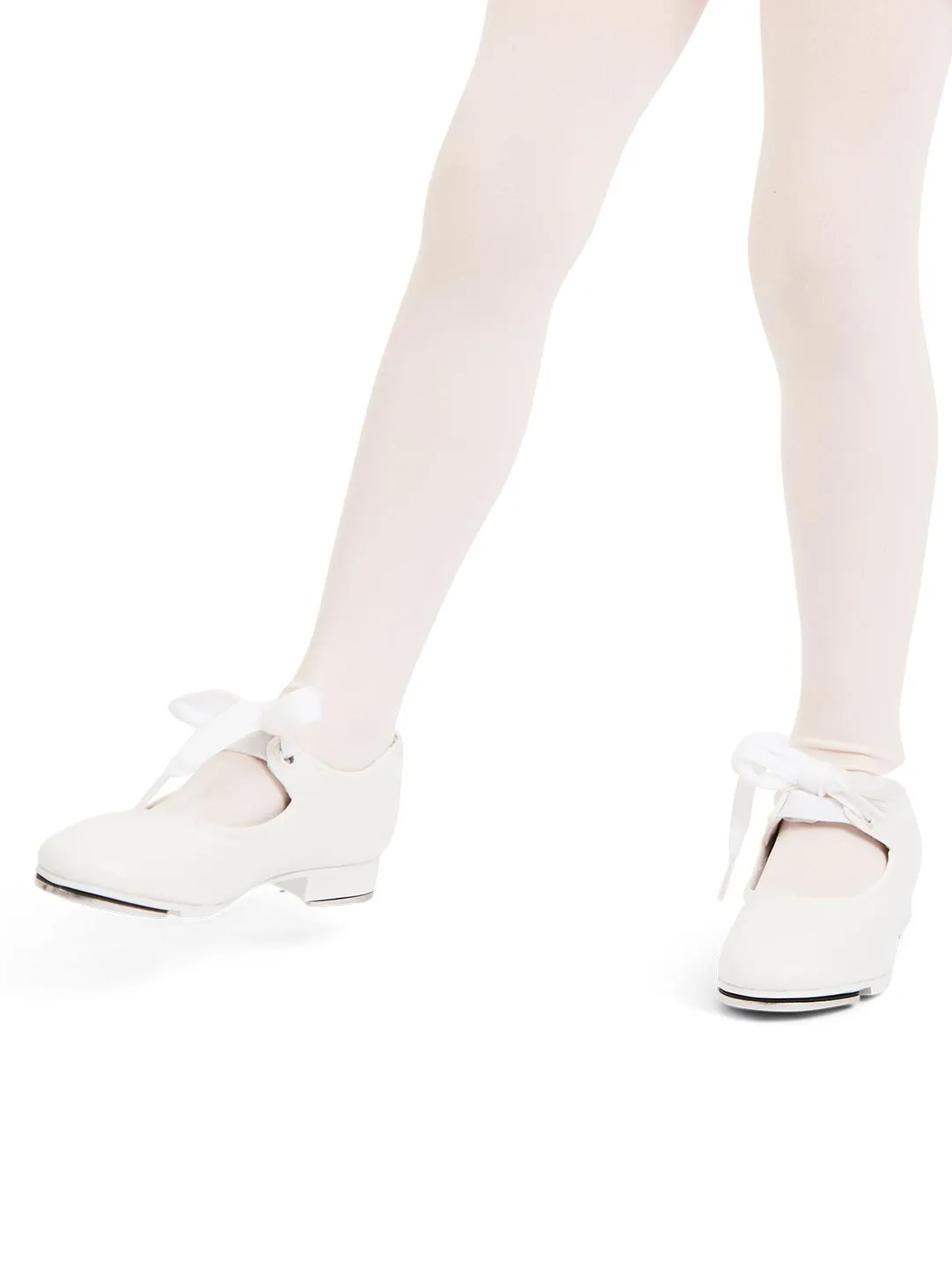 Meet our newest tap shoe for beginners! The Shuffle Tap comes in shiny black patent leather, caramel leather or white leather. Adorable ribbon tie and double snap, fastening elastic will ensure the most secure fit. Features signature, Capezio Tele-Tone® toe and heel taps mounted on fiberboard for flawless sound. Introductory tappers will take their first steps with confidence in the Shuffle Tap.