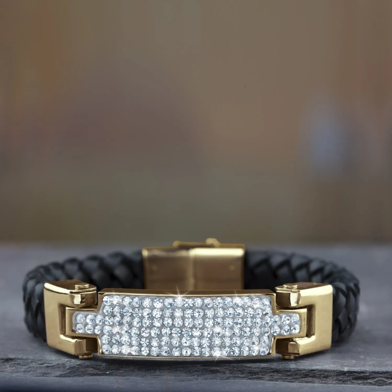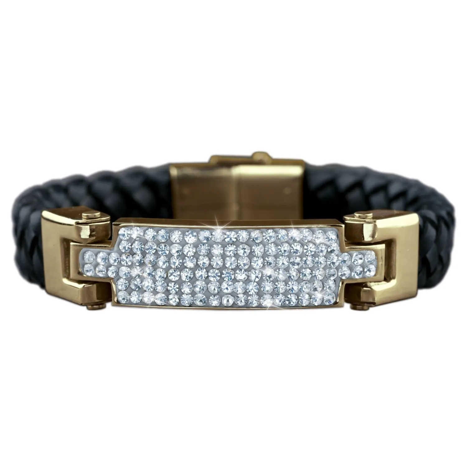 Bold and rugged, this handsome bracelet will be just his style. Fashioned from plaited black leather, this design features a gold plated stainless steel ID bar, encrusted with over 100 glistening crystals A look that can carry you through from the gym to the boardroom. Our Repertoire: Using the finest materials finished to the highest standards, Timepieces International has developed a vast range of watches and accessories that provide a purposeful, visual statement. These beautiful products are available at astonishingly low prices, often costing less than a quarter of the recommended price. You may ask how we can offer such quality at such low prices? The answer is beautifully simple: we cut out the middleman. This means there are no retail overheads to pay and not the usual mark up to make which can be enormous on luxury watches and jewelry.