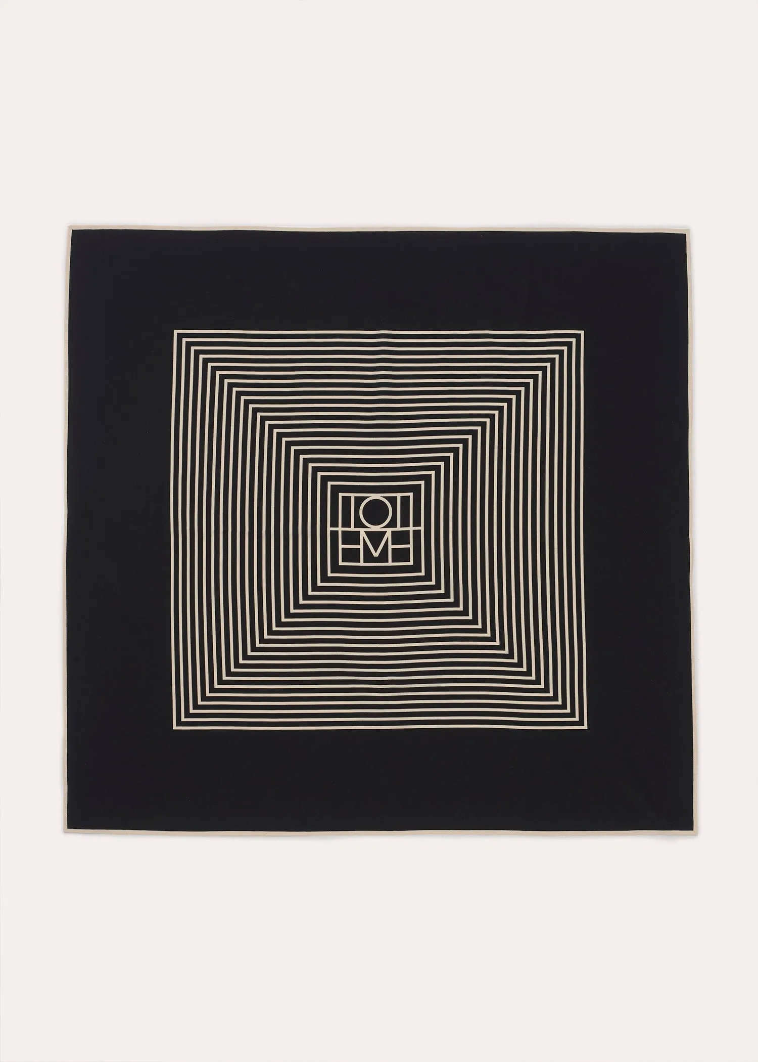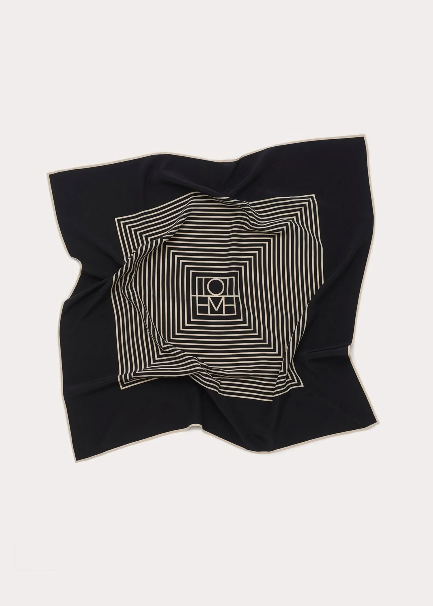 Classic TOTEME silk scarf cut to a square shape measuring 80x80cm and printed with a centered, striped monogram in black and crème. Drape it over your shoulders or fold it neatly around your neck.