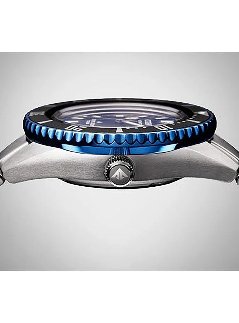 The watch's dial and uni-directional bezel feature a marine blue color, with the display making use of embossed hands and a classic green luminous for a vintage feel. The professional-grade timepiece is powered by an advanced automatic movement that boasts enhanced magnetic resistance to protect against interference from everyday devices, as well as a 42-hour power reserve. This high-performance watch comes in an exclusive blue collector’s dive tank box, is ISO compliant and water resistant to 200 meters. Caliber number 9051.