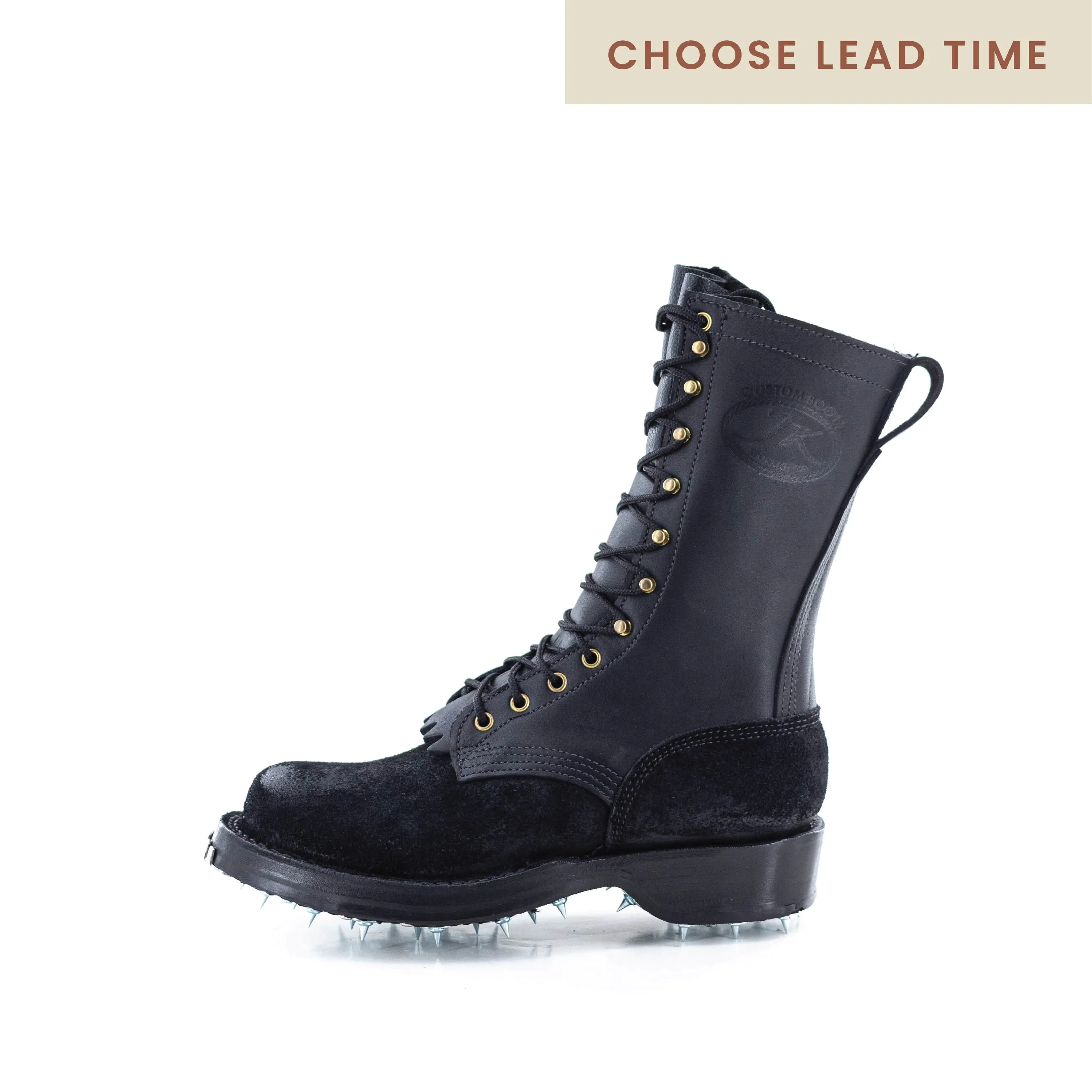 The great terrain equalizer, or Caulk Logger boot, is known for its fierce spikes (caulks) that provide traction in the most treacherous conditions. The tall logger heel provides balance and support while the 8-9oz leather holds your foot and ankle in place.