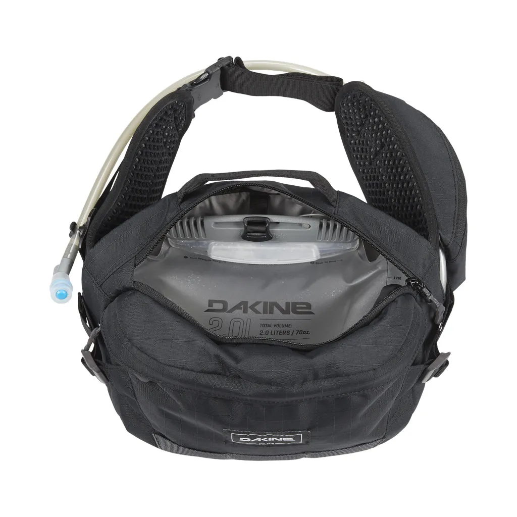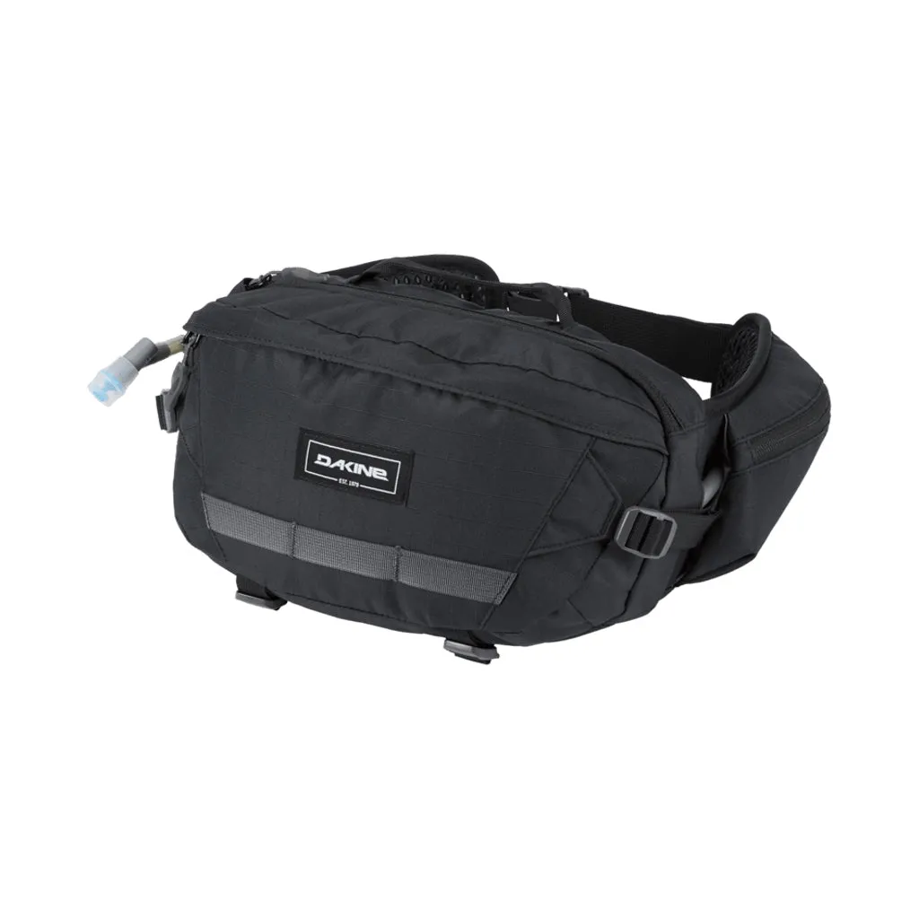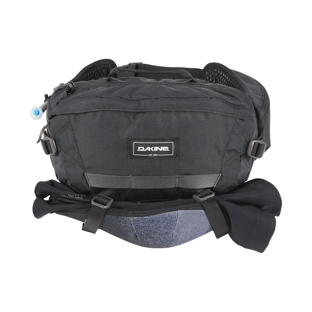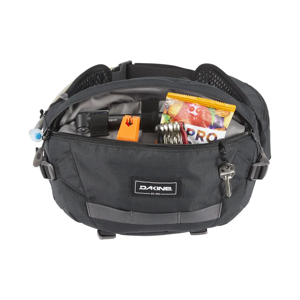 Hot Laps 5L is a capable hip pack with storage capacity similar to small backpack-style choices. It comes with a two-liter Hydrapak® 3D lumbar reservoir and additional room to stow a variety of goods on your rides. With its recent redesign, you can now easily store a phone or pair of sunglasses in the fleece-lined pocket on the cushioned hip belt. Tool, food, and a light shell are organized in the main compartment, while bottom straps extend to accommodate pads. The weight is kept close by side compression straps while the water reservoir is emptied, and sweat is reduced and hotspots are eliminated by the breathable AirFlow back panel.