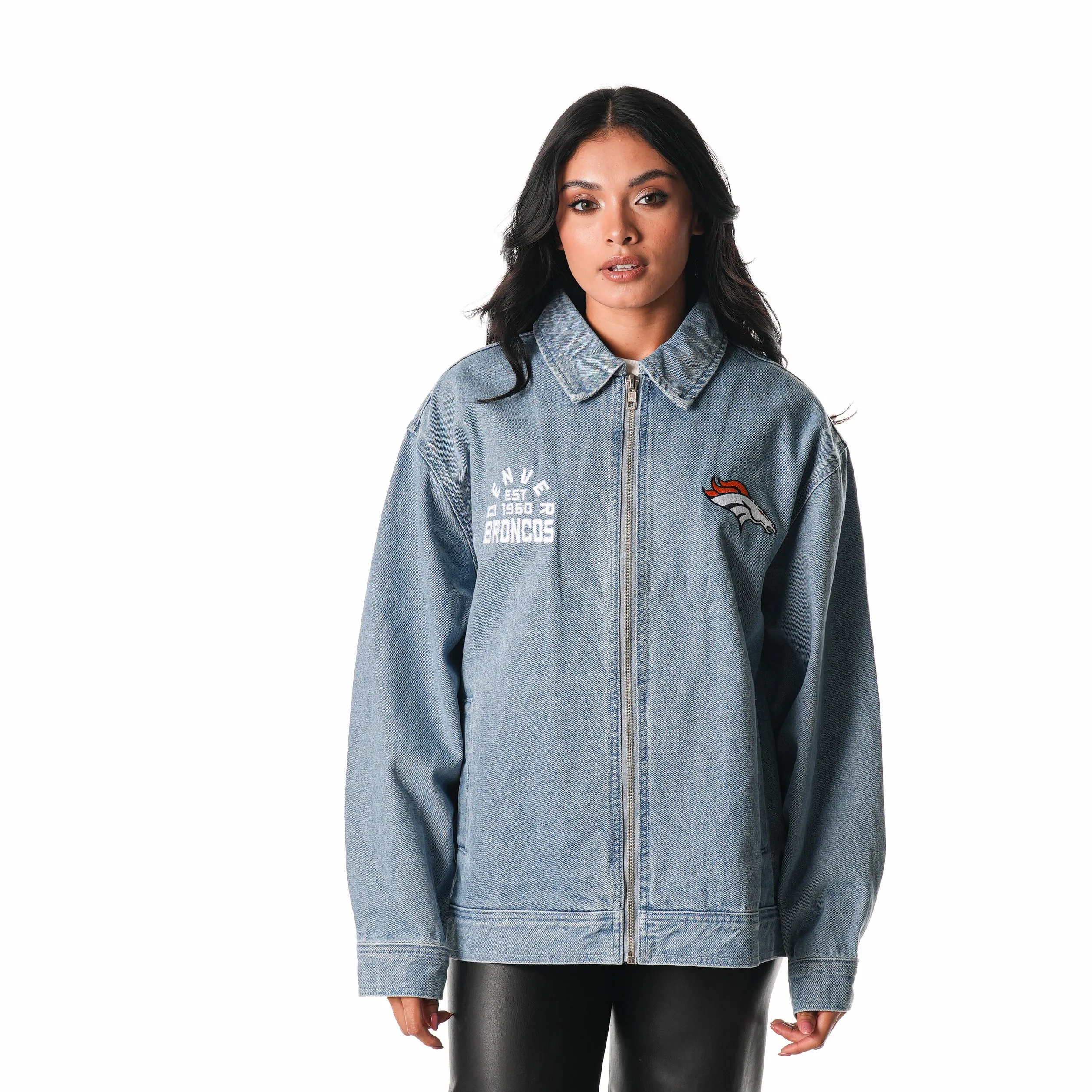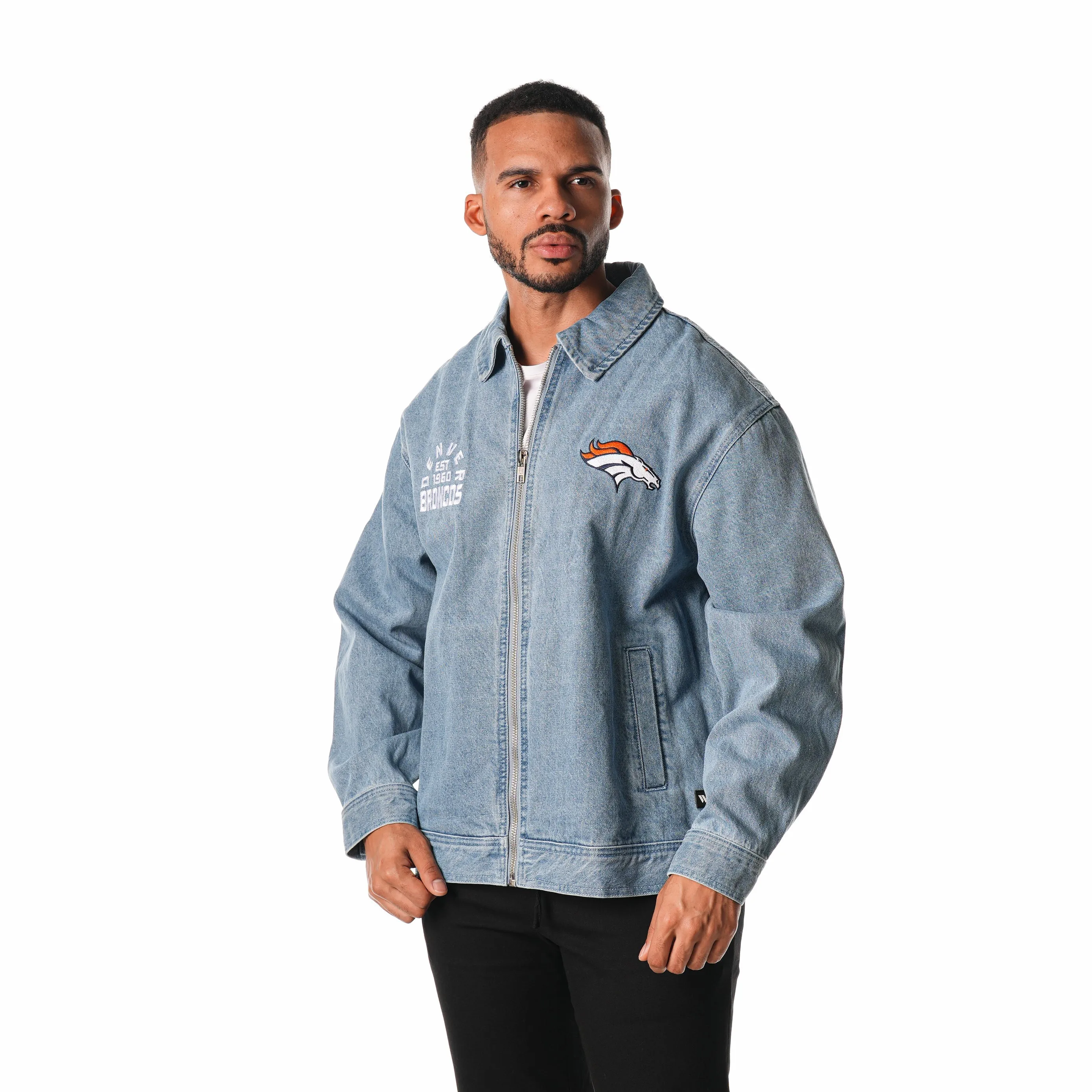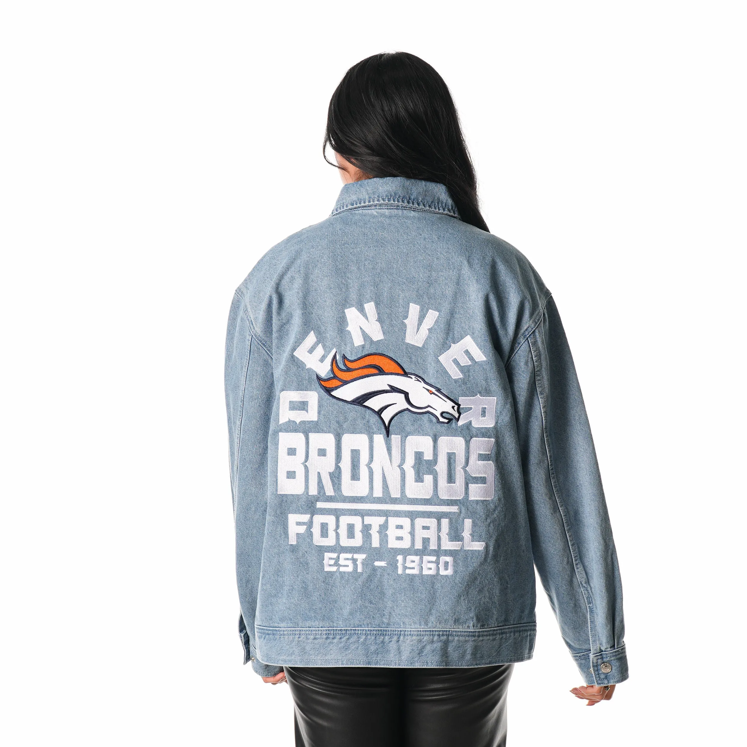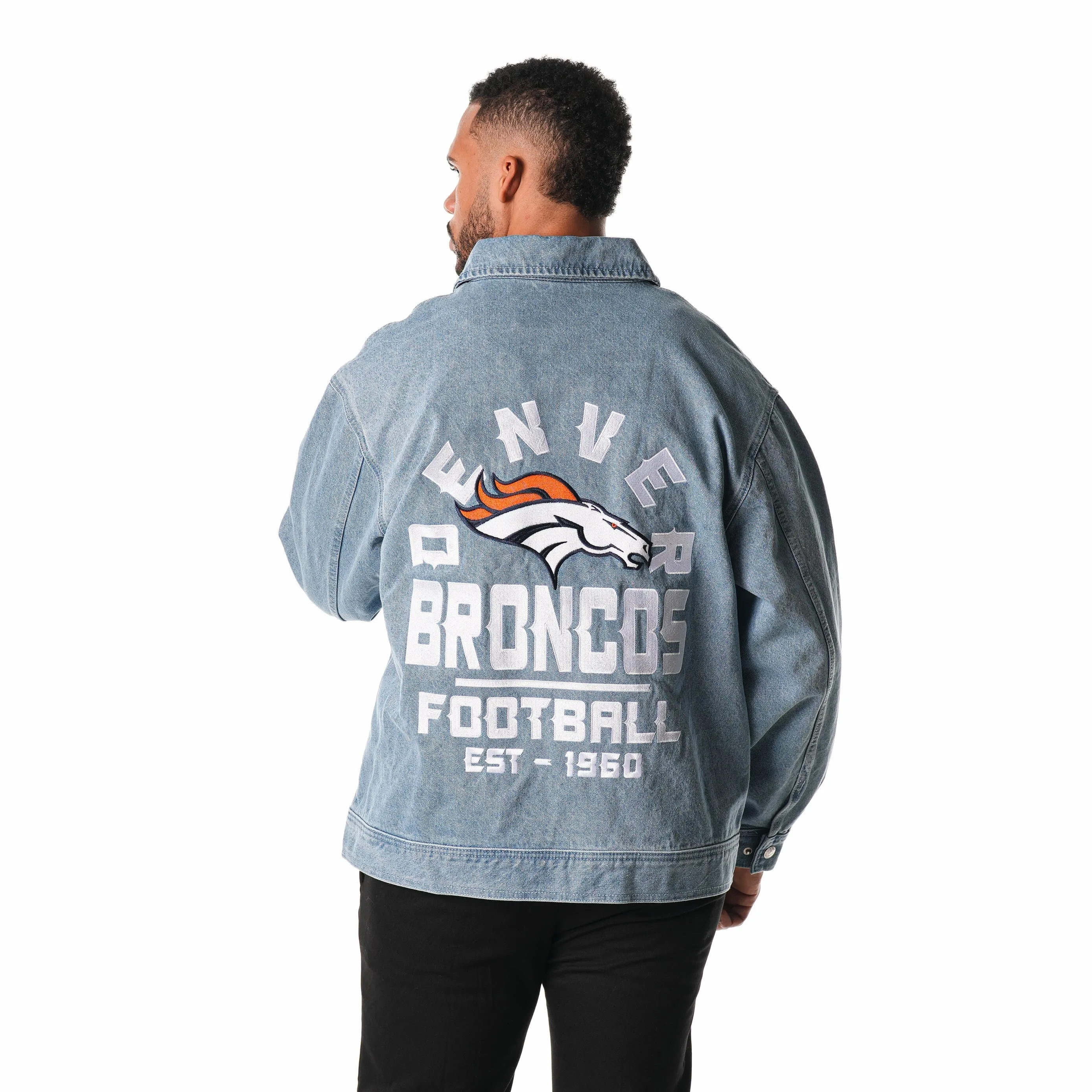 Stay stylish and show off your team spirit with the DENVER BRONCOS DENIM DENIM JACKET - BLUE. Made with durable denim material, this jacket features the iconic Denver Broncos logo for a subtle touch of fandom. Perfect for game days or everyday wear.