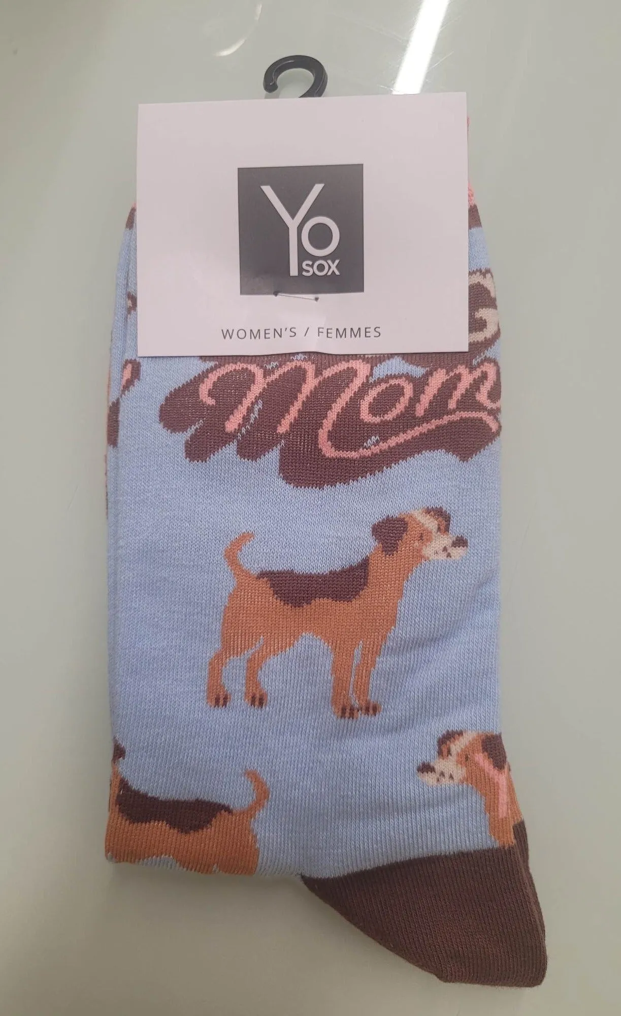 You never come between a mom and her dog. Let everyone know who the favourite is with these good boys! Women's blue cotton crew sock with dog mom pattern. YO Sox is made with tightly wound double spun cotton means your socks will stay the same size without stretching.