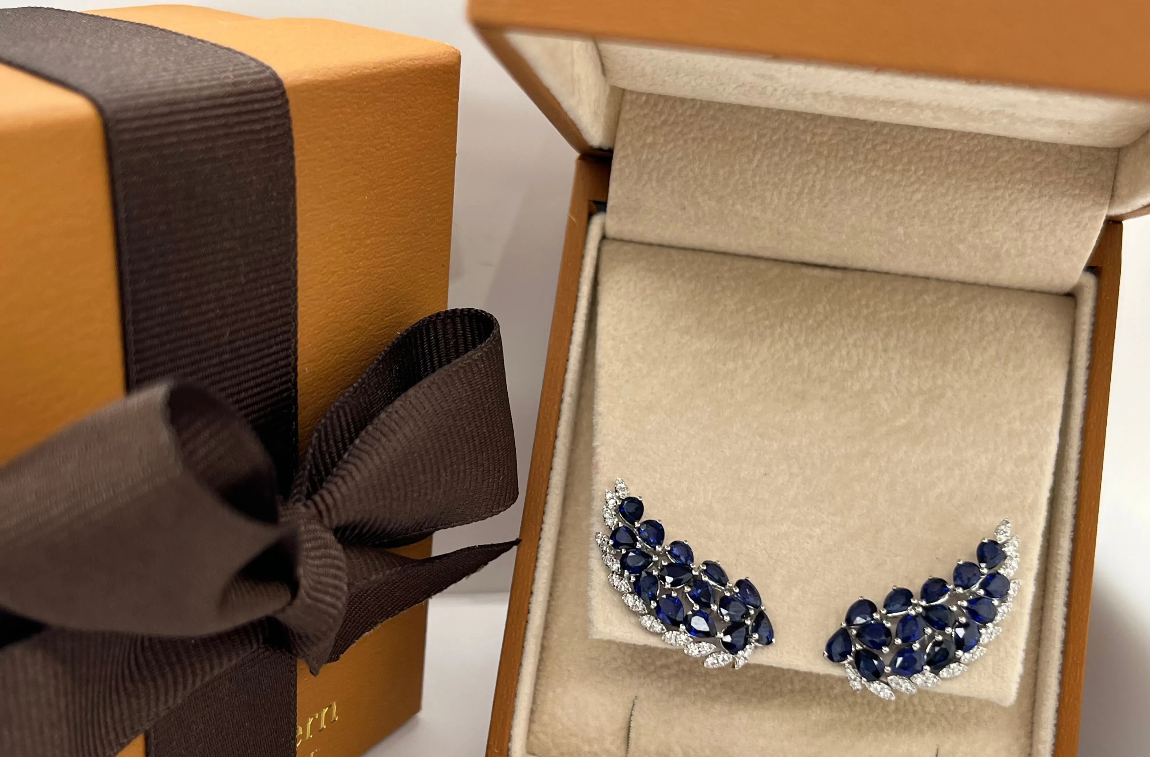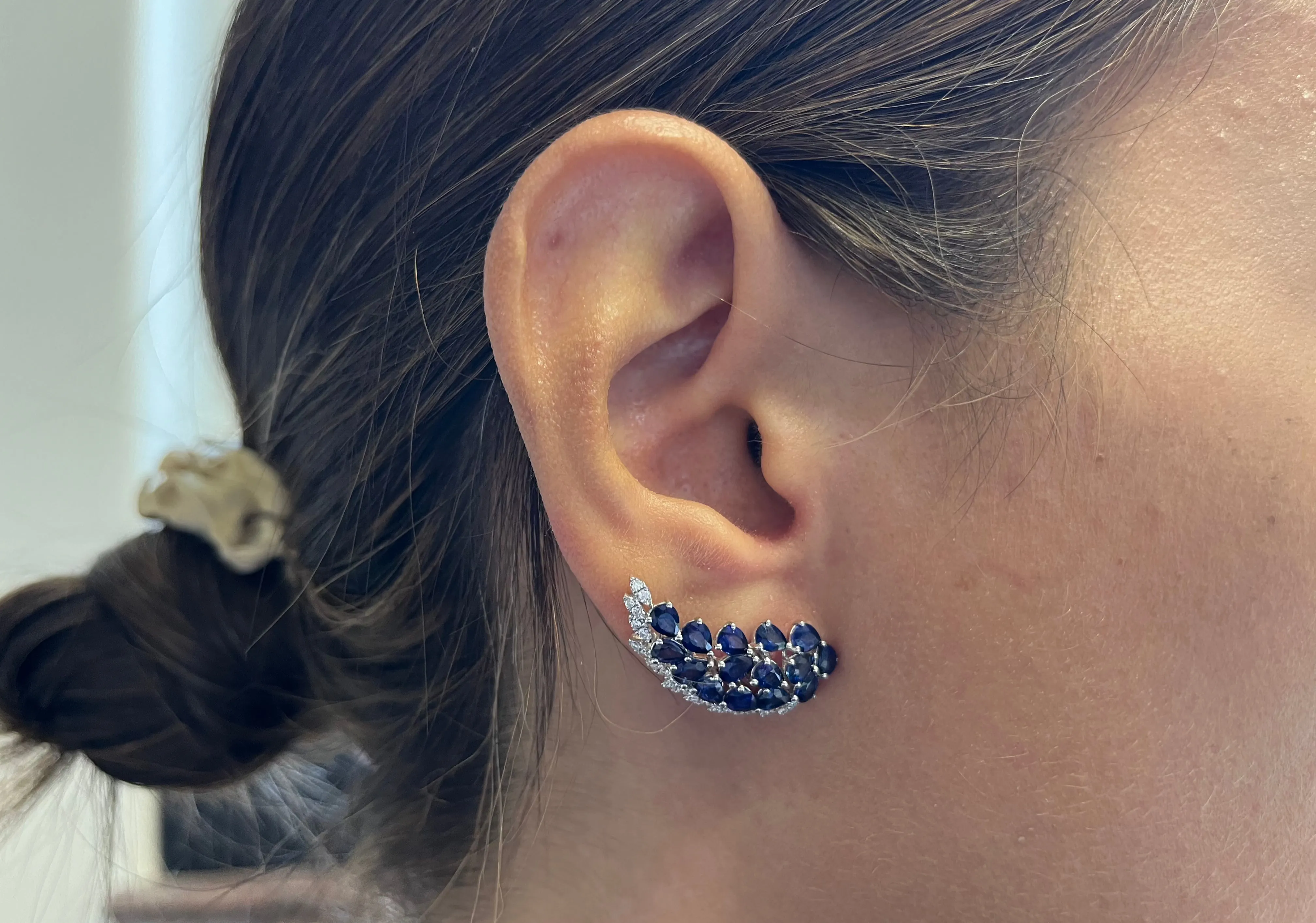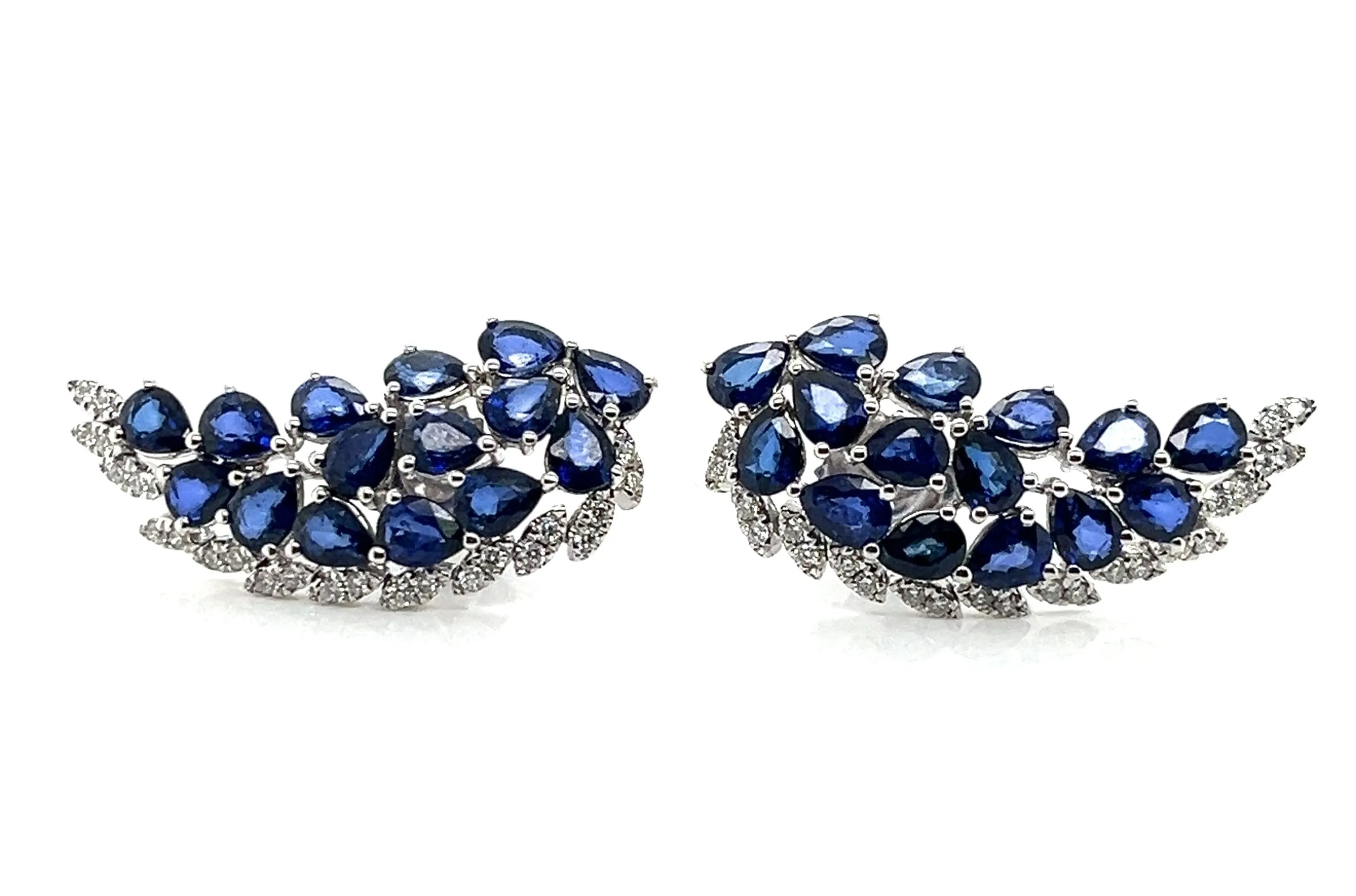 Radiating sophistication, these 14kt white gold earrings boast exquisite wing designs adorned with sapphires 3.81 carats and dazzling diamonds totaling 0.28 carats