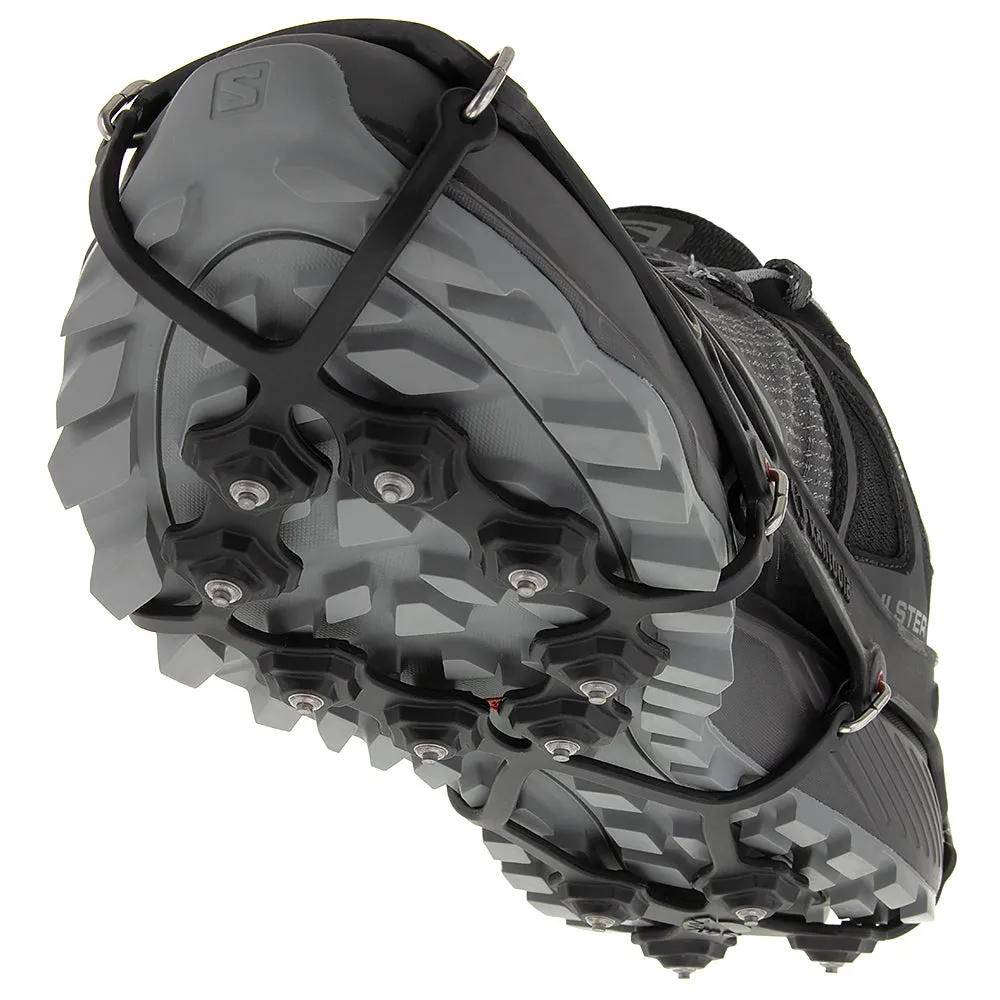 Twelve integrated spikes per foot deliver three levels of traction. Tungsten carbide tips bite into ice and packed snow, aluminum steps grip uneven surfaces, and TPU lugs dig into loose terrain.