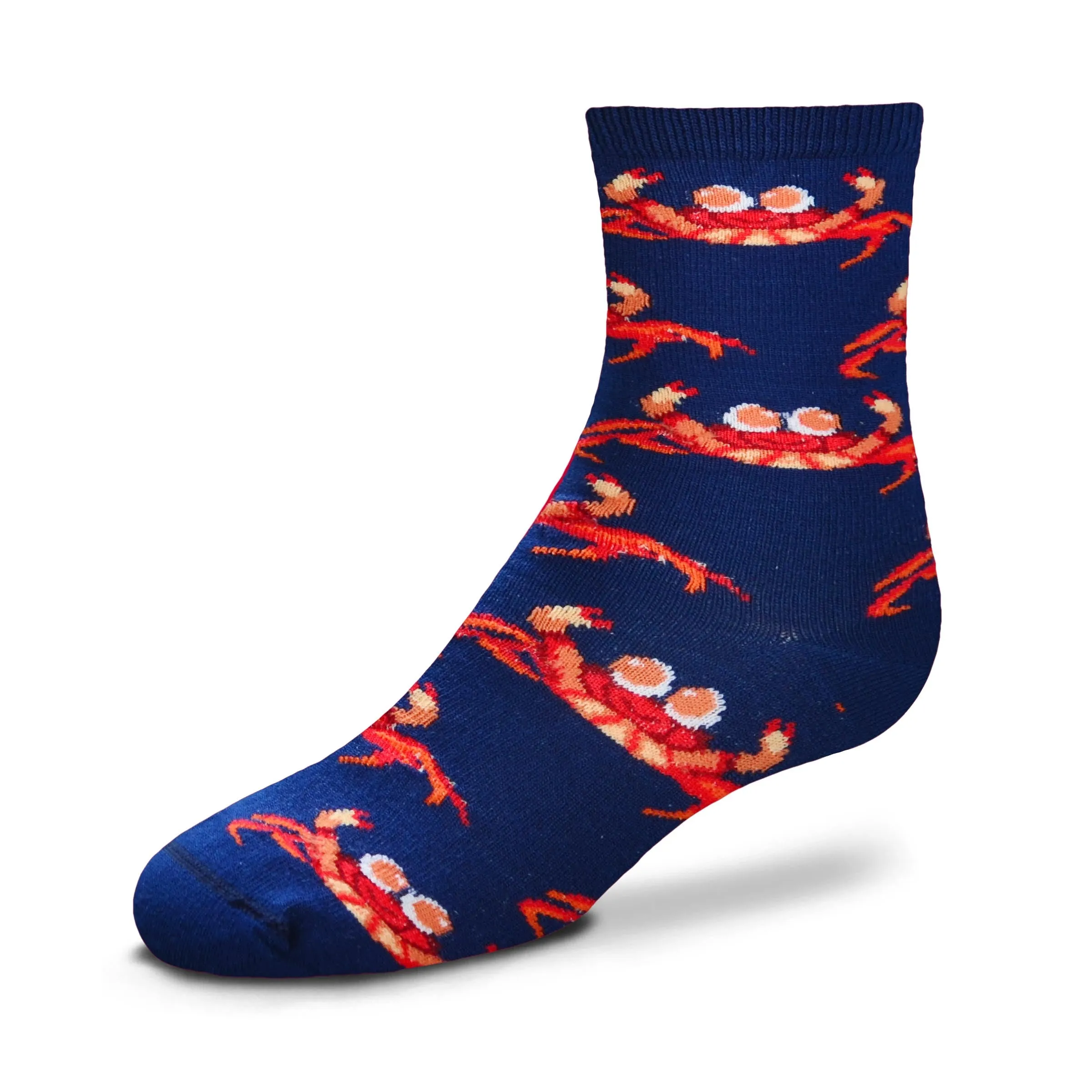 For Bare Feet Crab Jumbo Eyes for Children Sock begins with a Navy background. It has Happy Jumbo Eyed Crabs in rows all over the Socks. The Jumbo Eyes are Coral and White and His Smile is Scarlet. The Body of the Crab is Buff and Coral with lines of Coquelicot and Scarlet. His walking legs are all Coquelicot and Scarlet. The Claws are Coral and Buff with the Pincers Scarlet. They take after their Mom in the . This Sock for Children is a Thin Style and comes in Toddler, Child, and Youth Sizes.