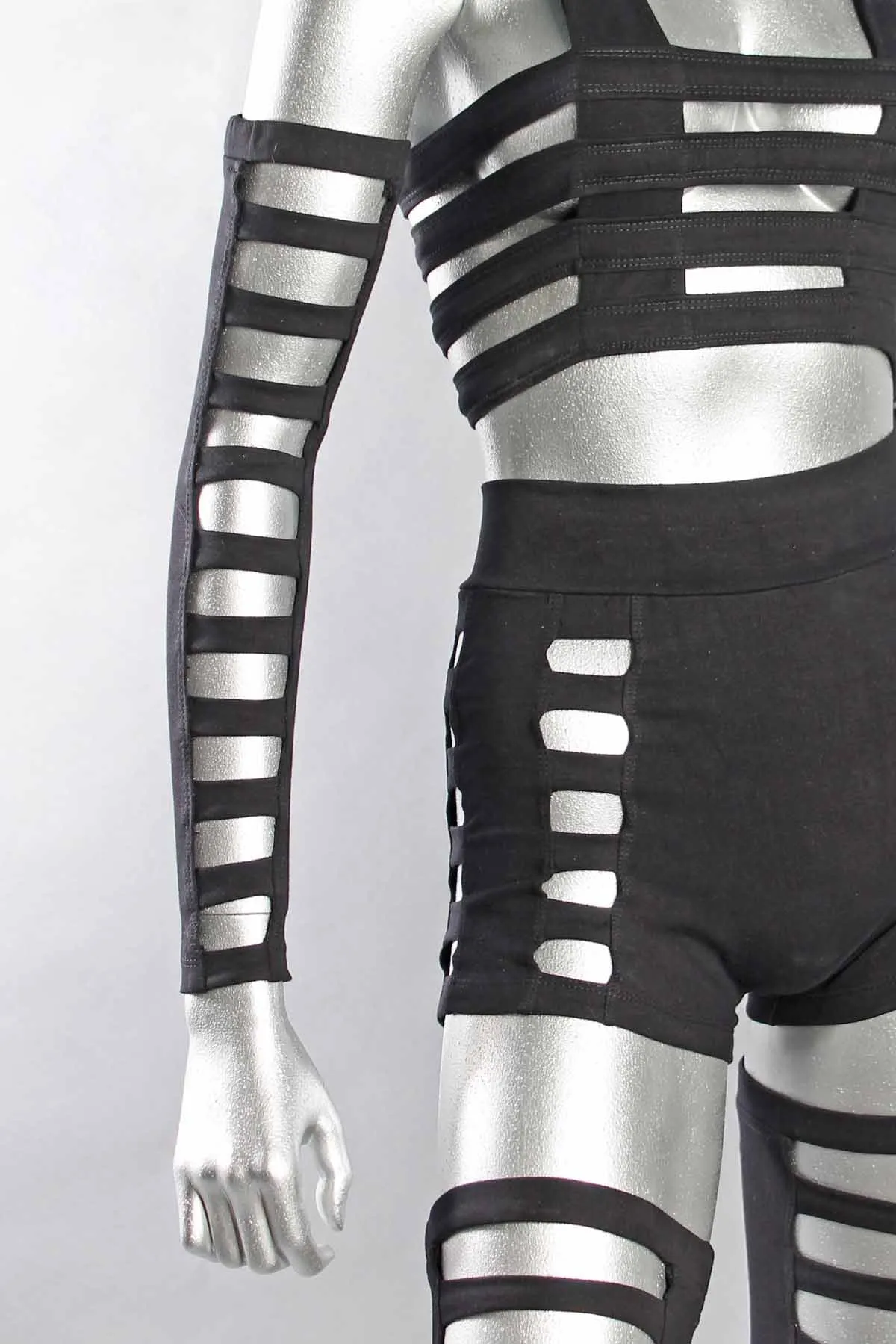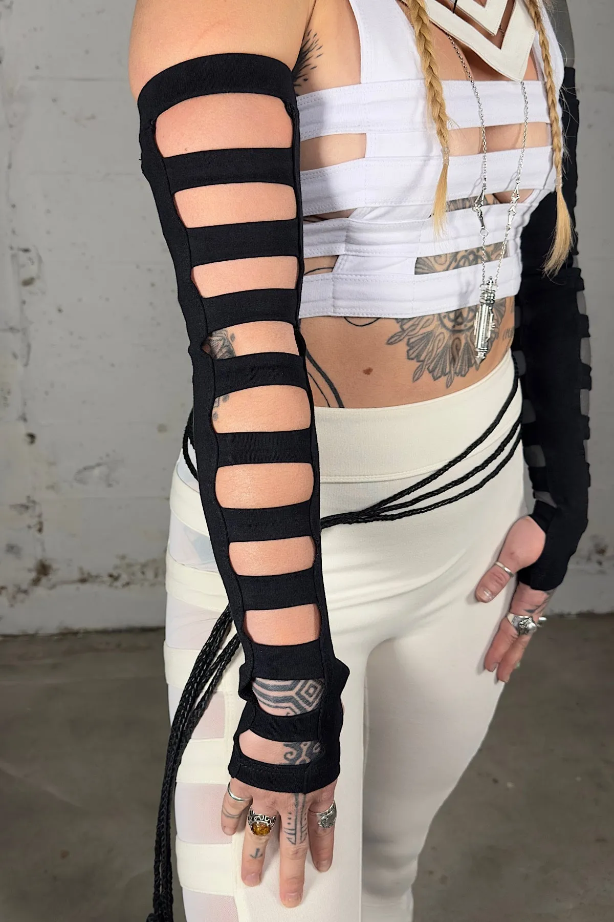 Cage gauntlets, each strap is hand placed and sewn in. Wear your thumb through like gloves or wear them up on the arms like gauntlets.