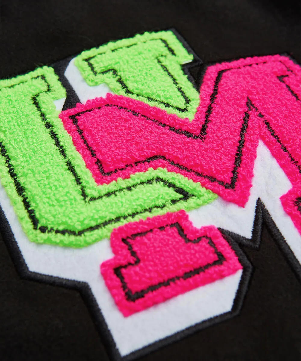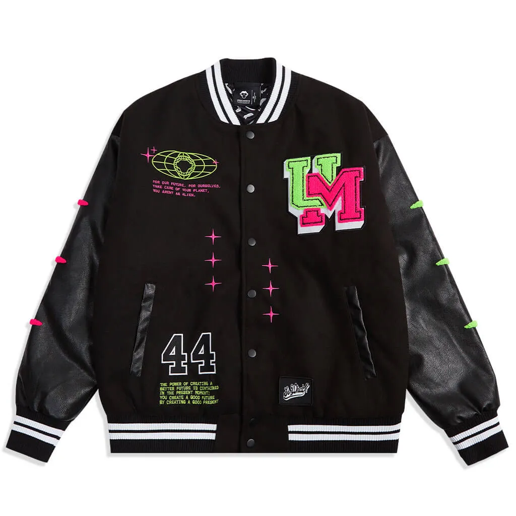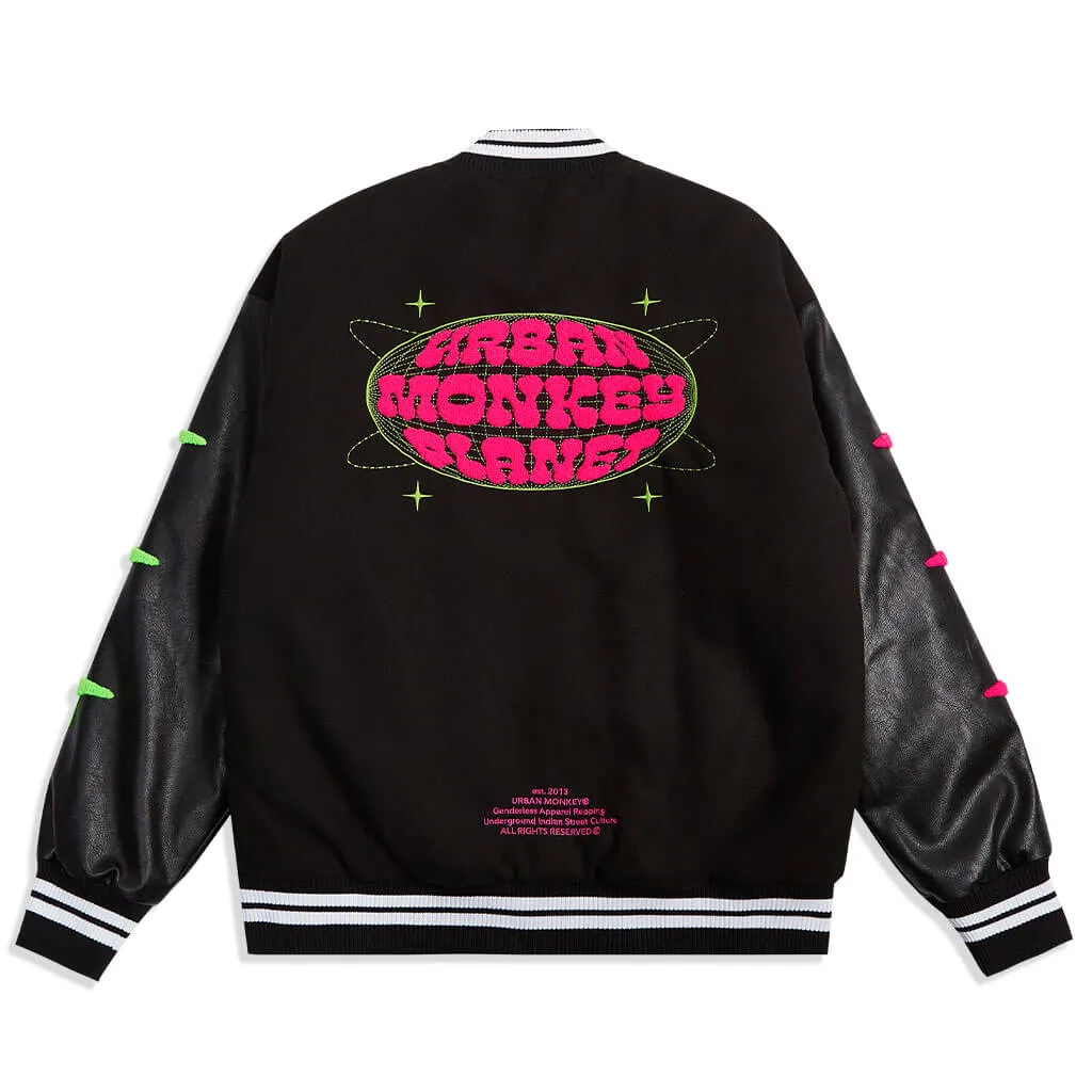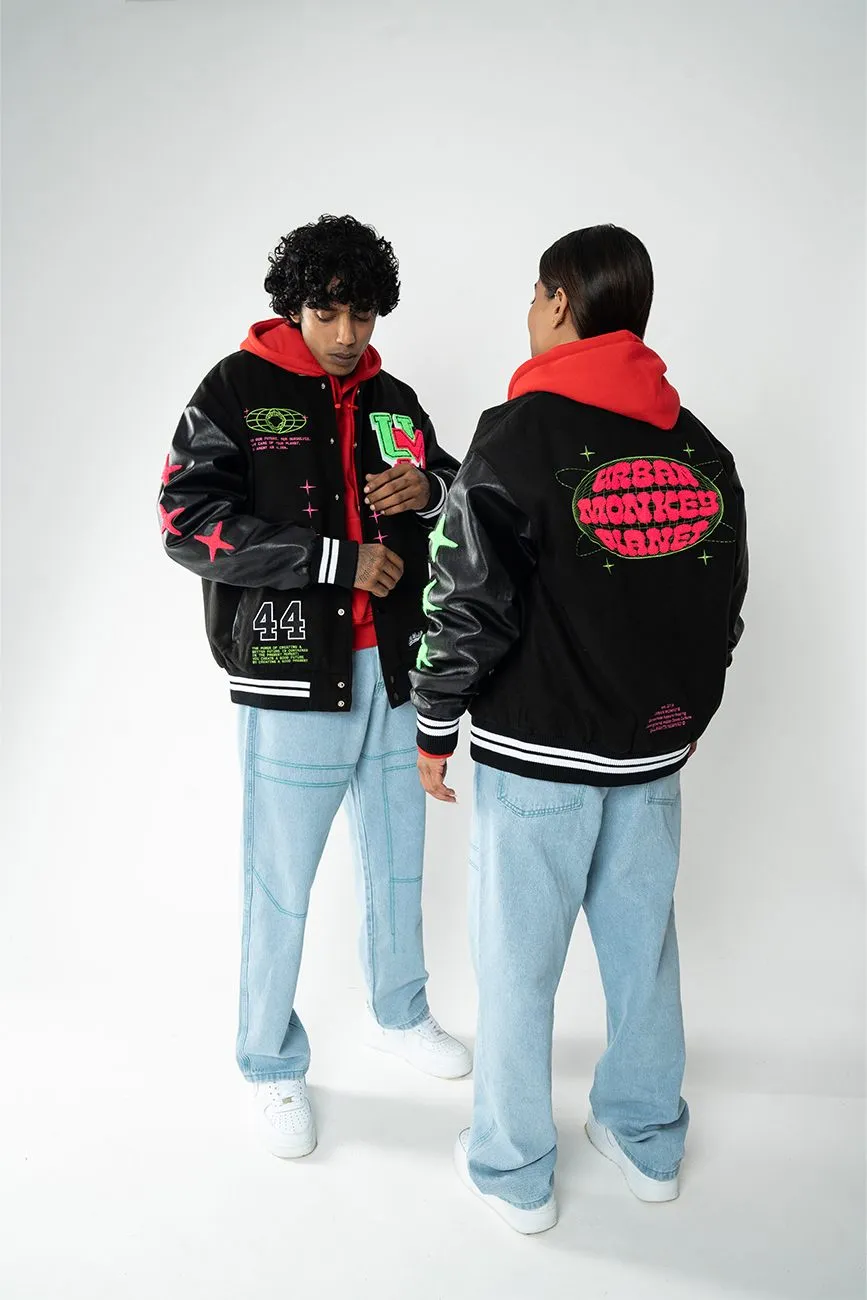 Work hard. Drip hard. Make mistakes. Do things you're afraid to. After all, you're only young once. And nothing says "DRIP" like this black Urban Monkey varsity jacket with neon embroidery details to the front, back and sleeves.