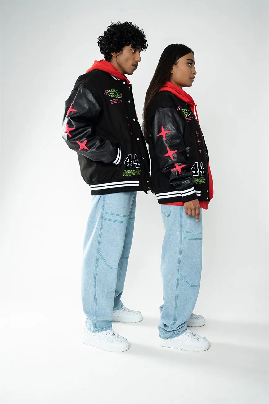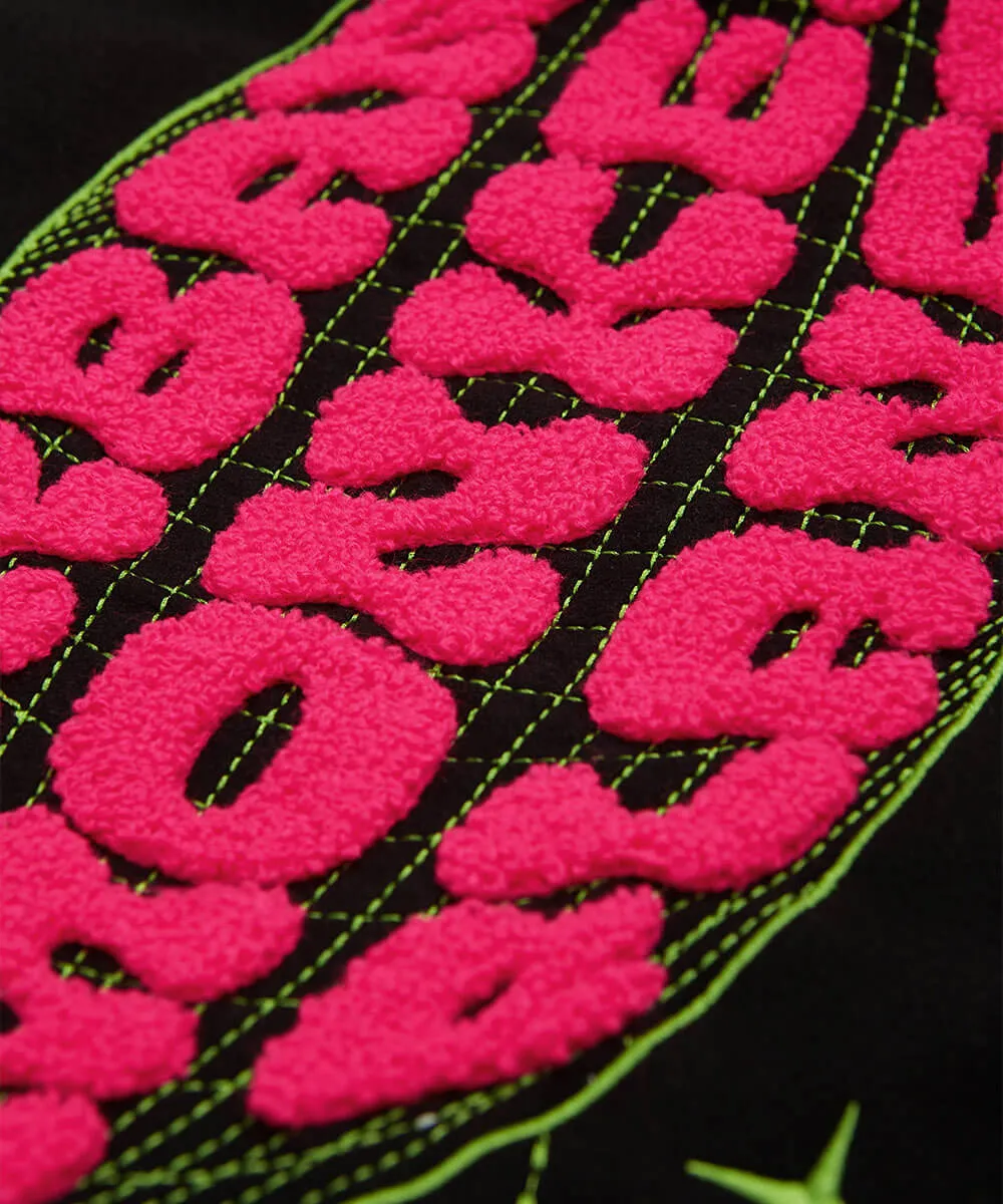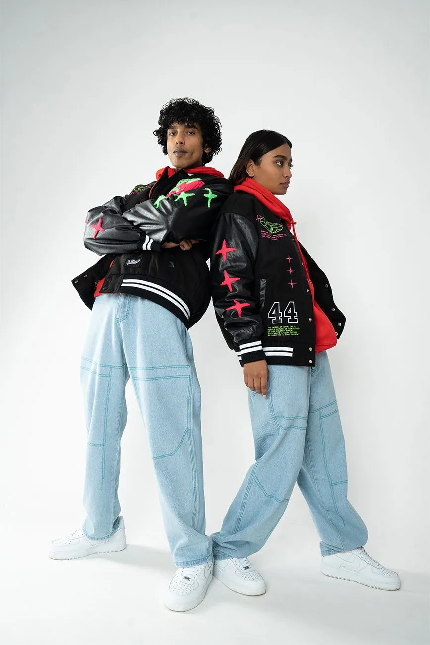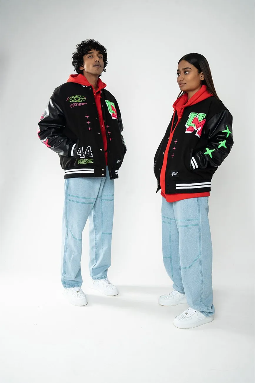 Work hard. Drip hard. Make mistakes. Do things you're afraid to. After all, you're only young once. And nothing says "DRIP" like this black Urban Monkey varsity jacket with neon embroidery details to the front, back and sleeves.