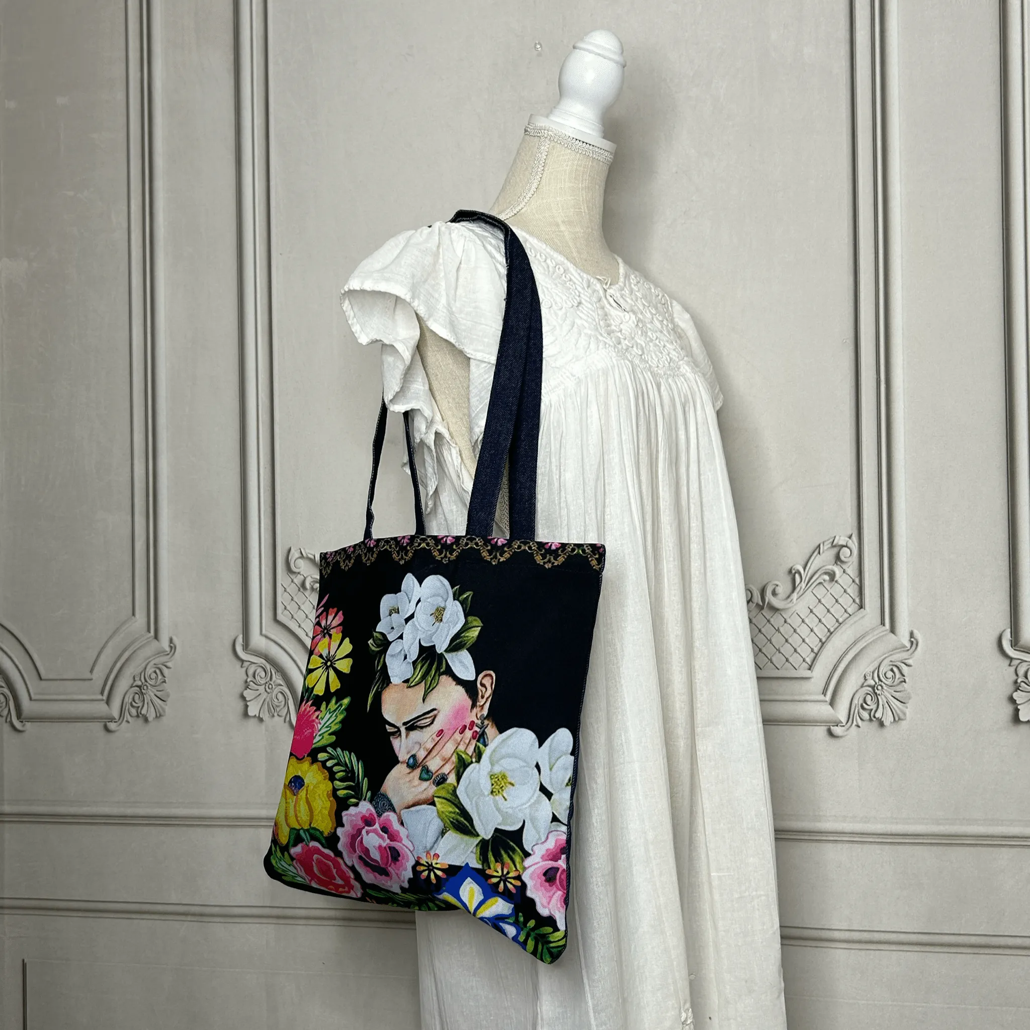 Lightweight Friday Kahlo Cartoon tote bag. There is a sublimated print on the front, denim back, and straps with a zippered opening—durable thick canvas fabric.