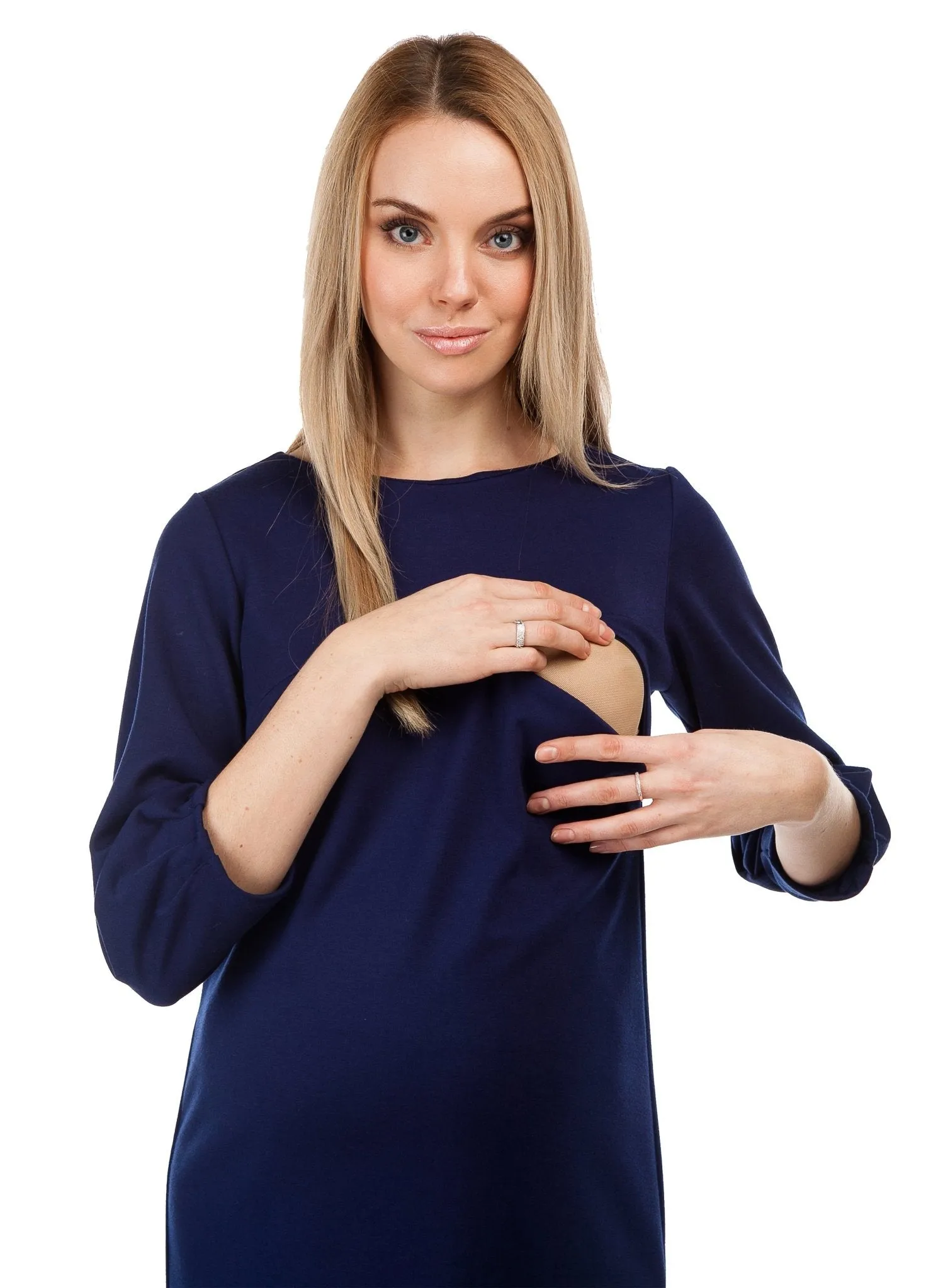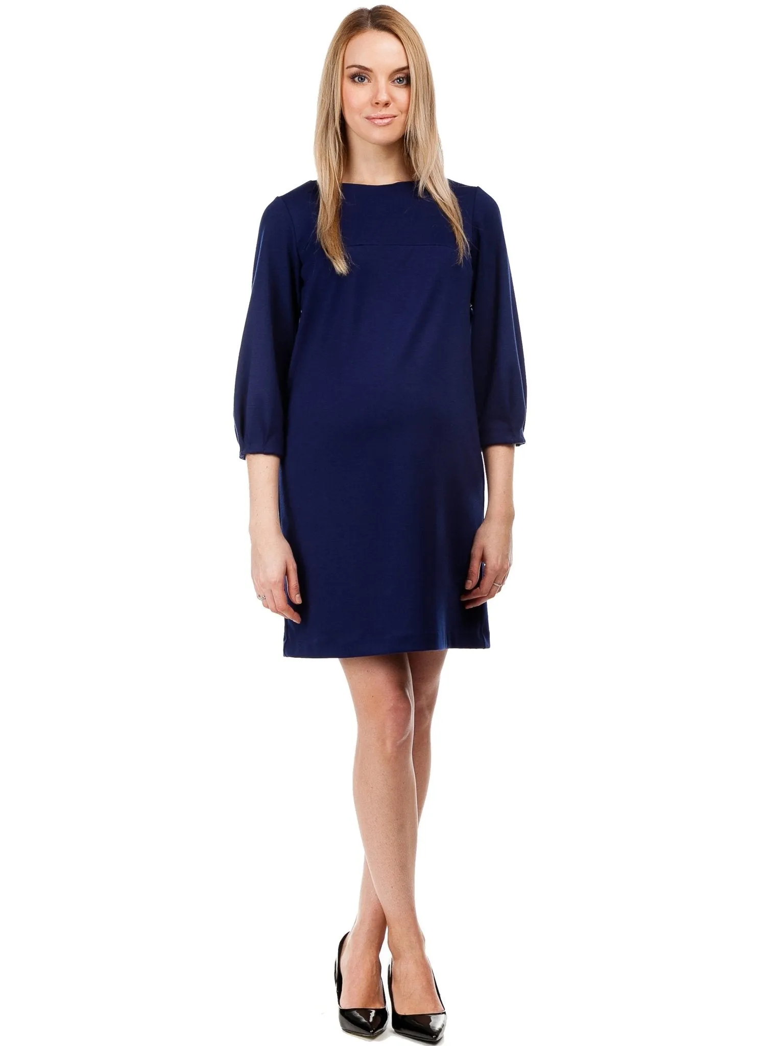 Medieval blue ponte milky dress with a hidden zip to allow easy access for breastfeeding. Knee length, 3/4 sleeve and crew neck.