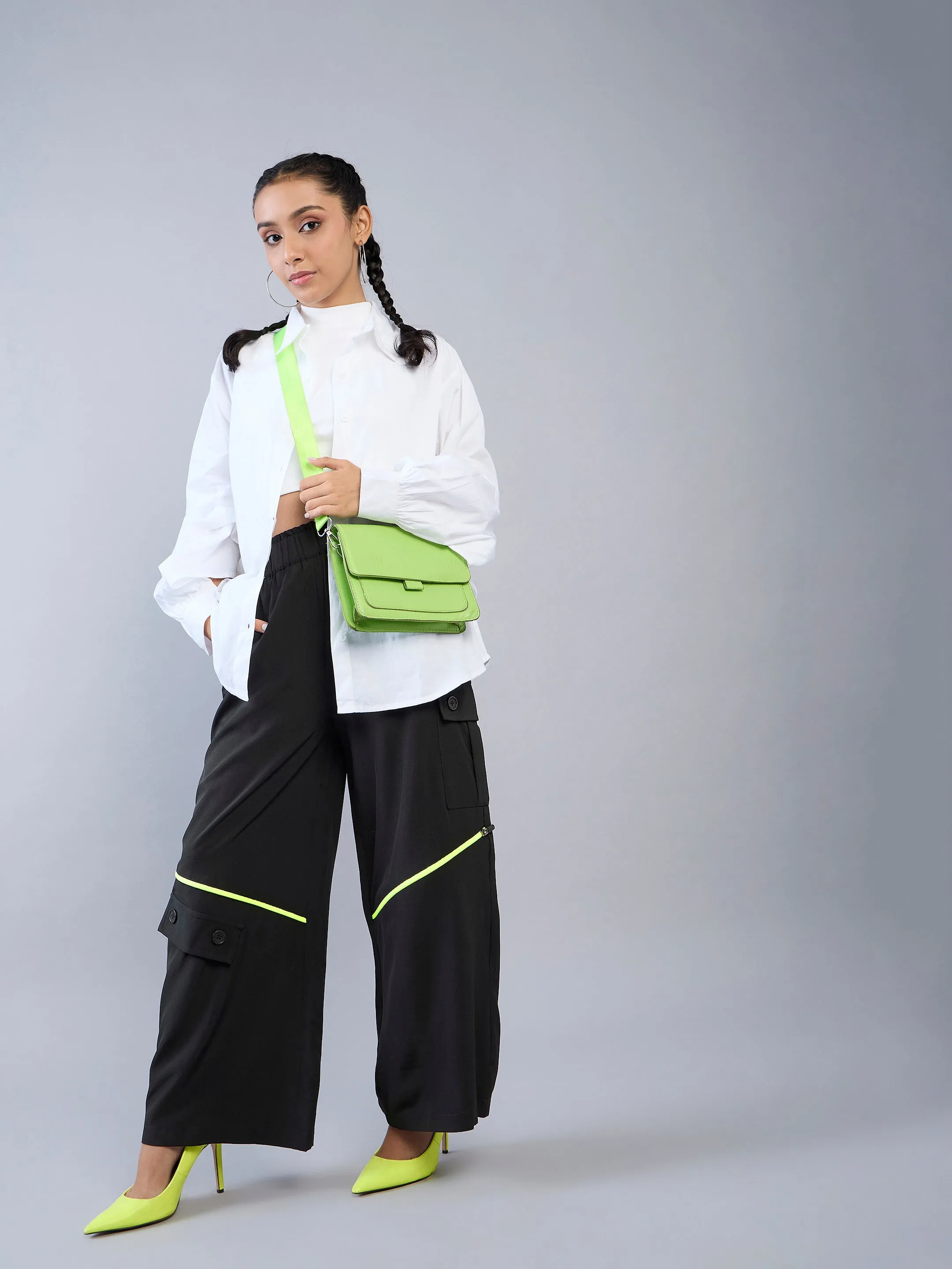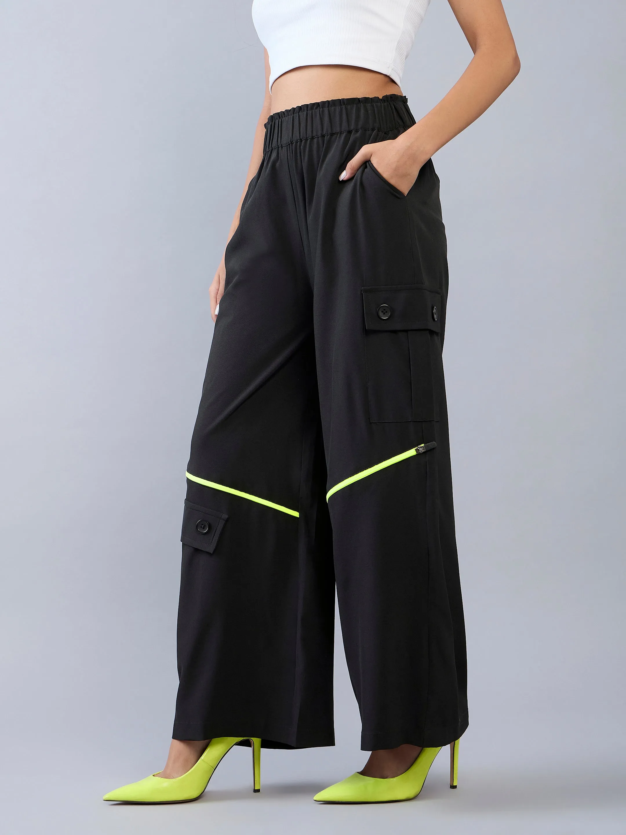 Black Neon Zipper Detail Parachute Cargos, in Parachute Polyester fabric, Unlined, Full Length, Straight Fit , Slip On, Straight Hemline and features Zipper Detail At Side