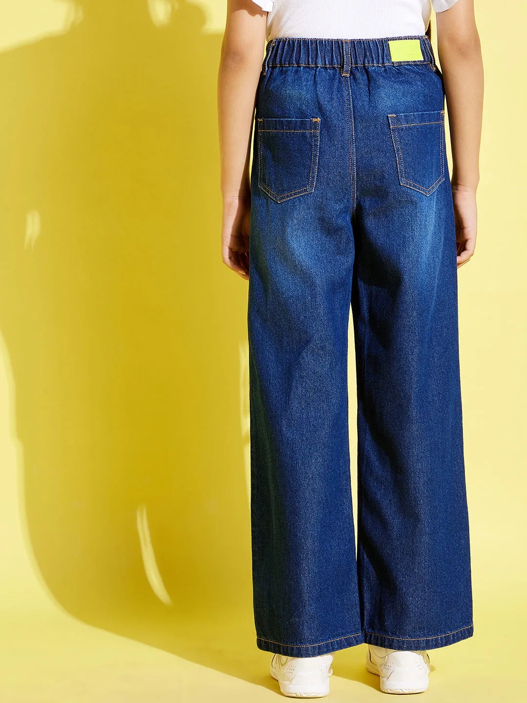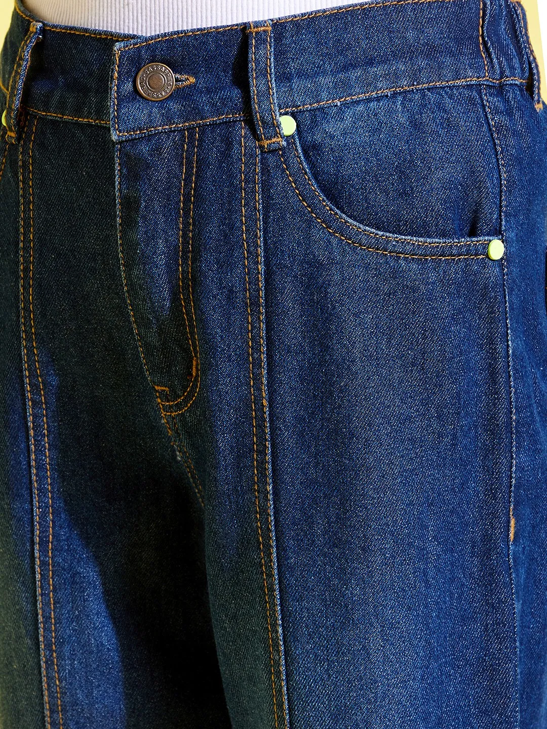 Blue Front Snap Button Straight Jeans, in Denim fabric, Unlined, Ankle Length, Straight Fit, Button Closure, Straight Hemline and features Neon Snap Button Detail At Hem