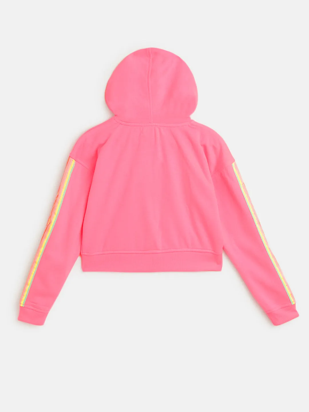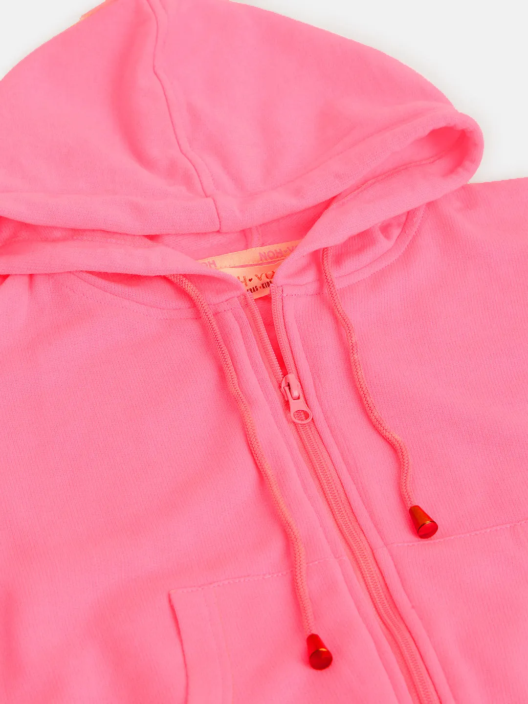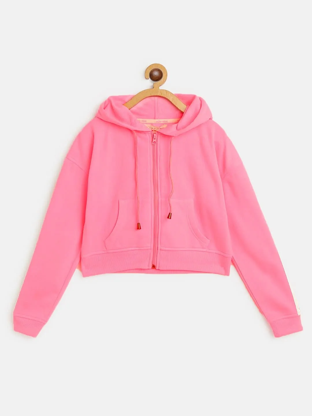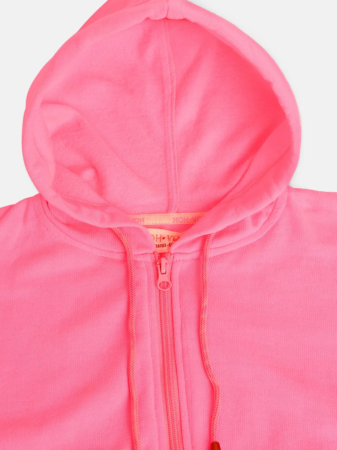 Neon Pink Front Zipper Bomber Jacket, in Fleece fabric, Unlined, Crop Length, Comfort Fit, Zipper Closure, Straight Hemline and features Rainbow Tape Detail At Sleeve