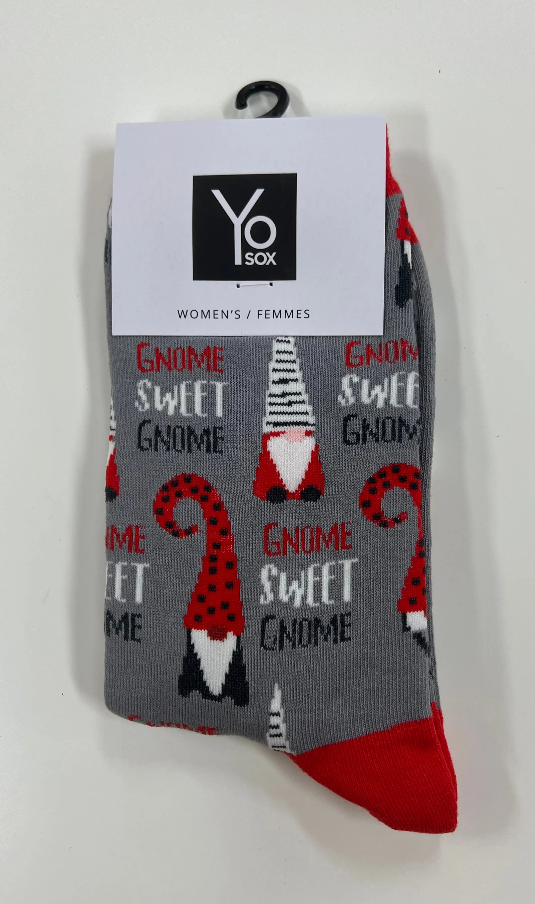 Women's Gnome patterned crew sock including phrase "Gnome Sweet Gnome". YO Sox is made with tightly wound double spun cotton means your socks will stay the same size without stretching.
