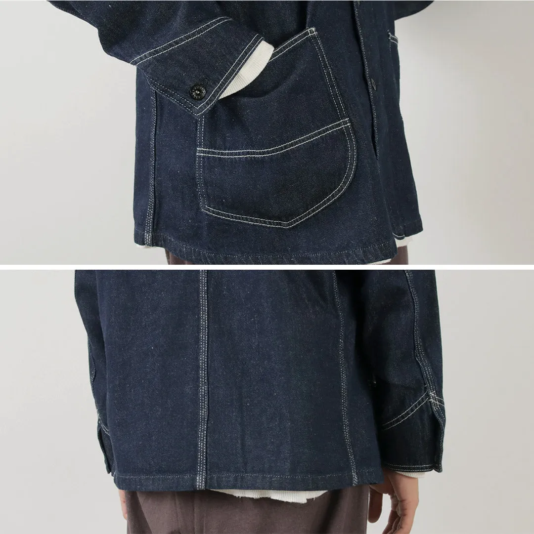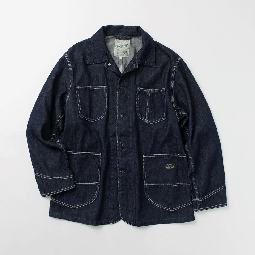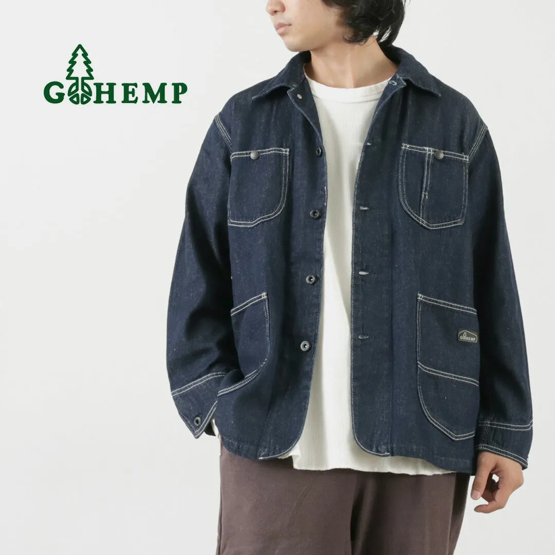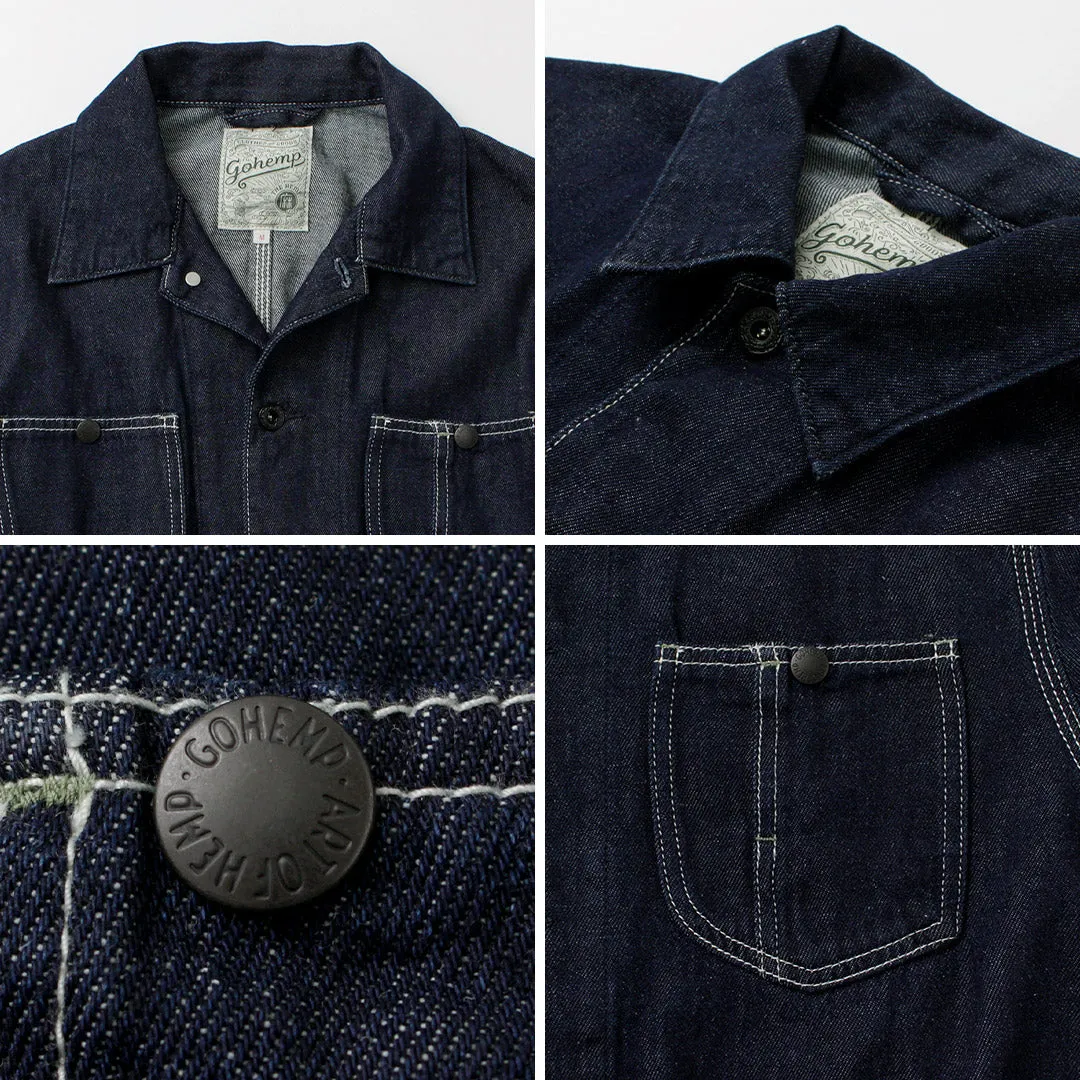 This coverall jacket is made from GOHEMP's classic hemp cotton denim. While maintaining the vintage details and traditional sewing that GOHEMP is known for, the jacket is finished with a trendy tailored pattern and a loose, roomy silhouette. The one-wash denim gives it a soft, comfortable fit and a bright blue look.