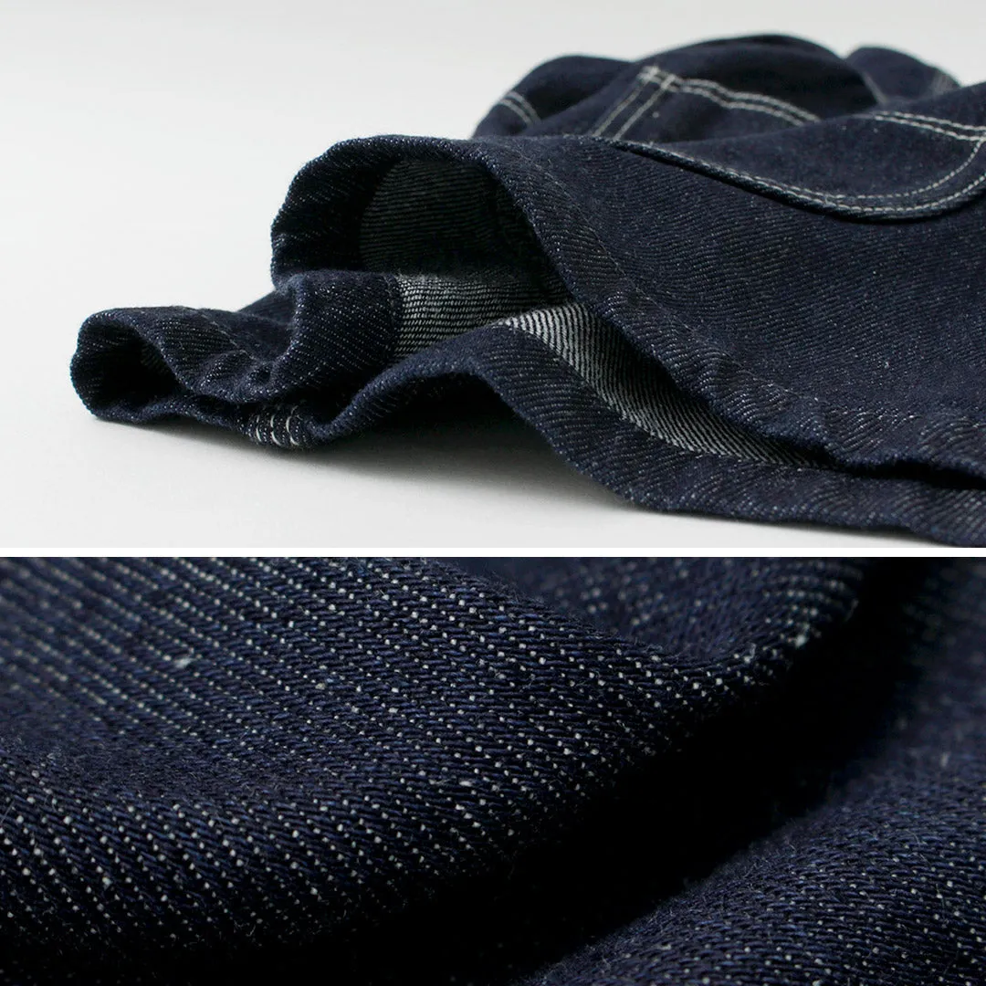 9 oz. one-washed denim fabric made of original hemp cotton material. With a soft and gentle feel against the skin and a moderate fleshiness, it can be worn for a long season.