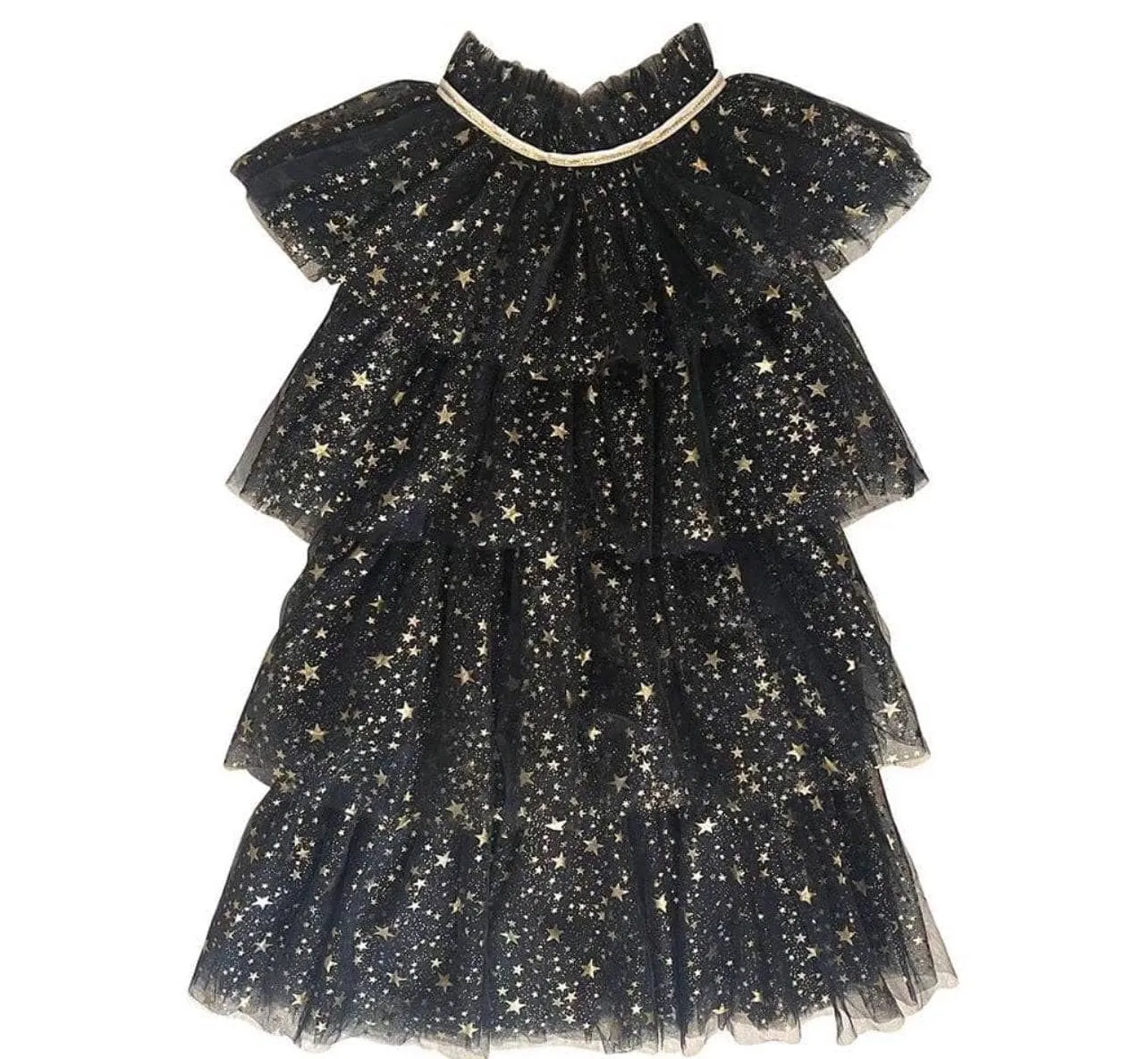 - Enchanting tulle dress adorned with shimmering gold star embellishments.
