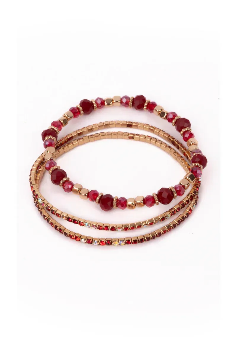 Enhance your fashion sense with our Boutique Ruby Red Bracelet Set, which includes three exquisite red and gold bracelets. The first bracelet in the set is meticulously made with top-notch gold & ruby-red beads. The set is accompanied by two beautiful stretch rhinestone bracelets to complete the stack.