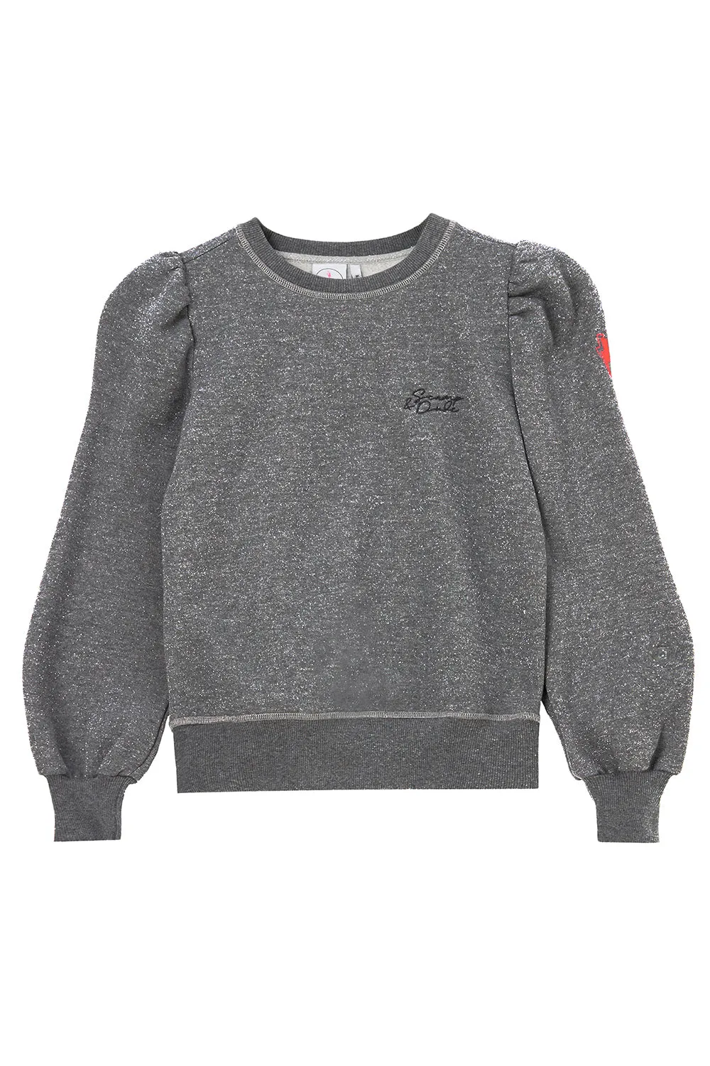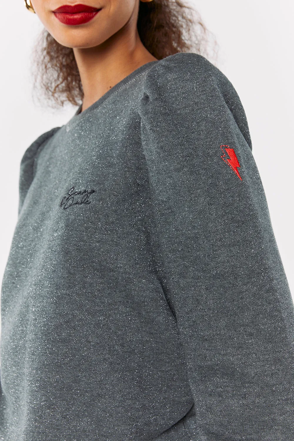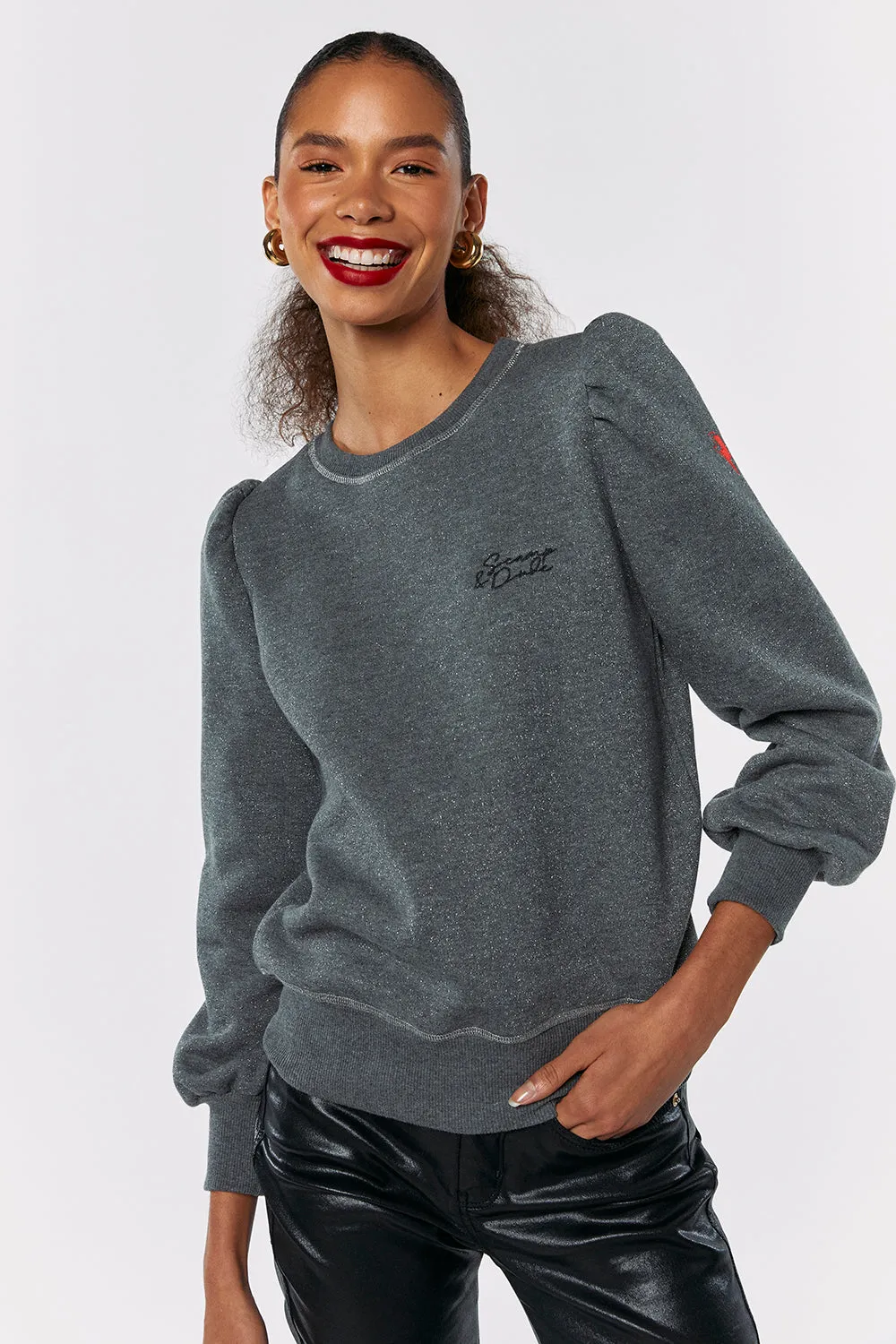 Add sparkle to your winter wardrobe with our cosy grey lurex puff sleeve sweatshirt, featuring a dark grey Scamp & Dude handwritten logo embroidered on the front. It's a versatile favourite, perfect for day to night dressing.