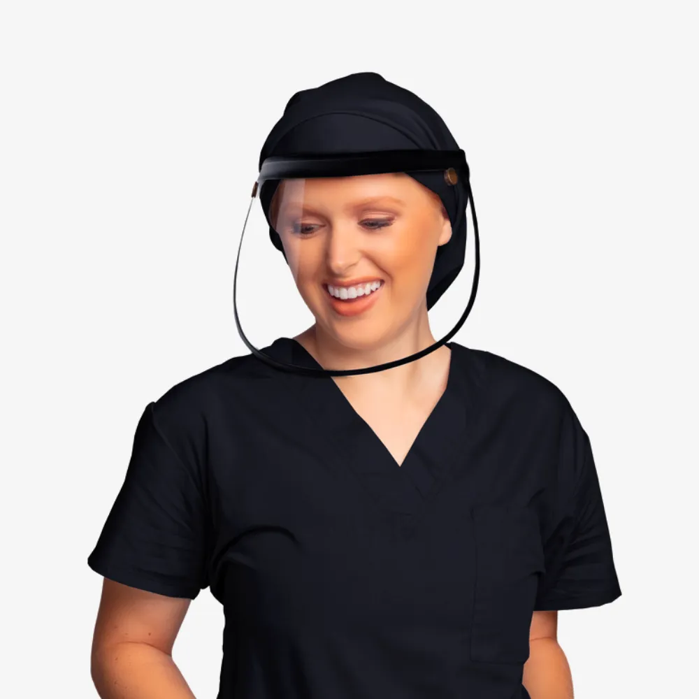 Introducing the Hairbrella Pro, a 100% waterproof solution for hair and face protection. Hairbrella Pro combines all of our signature features with the additional benefit of a portable, detachable, and adjustable face shield. The perfect companion for work and travel, Hairbrella Pro is our satin-lined solution to bulky face shields. Safety and style in one!
