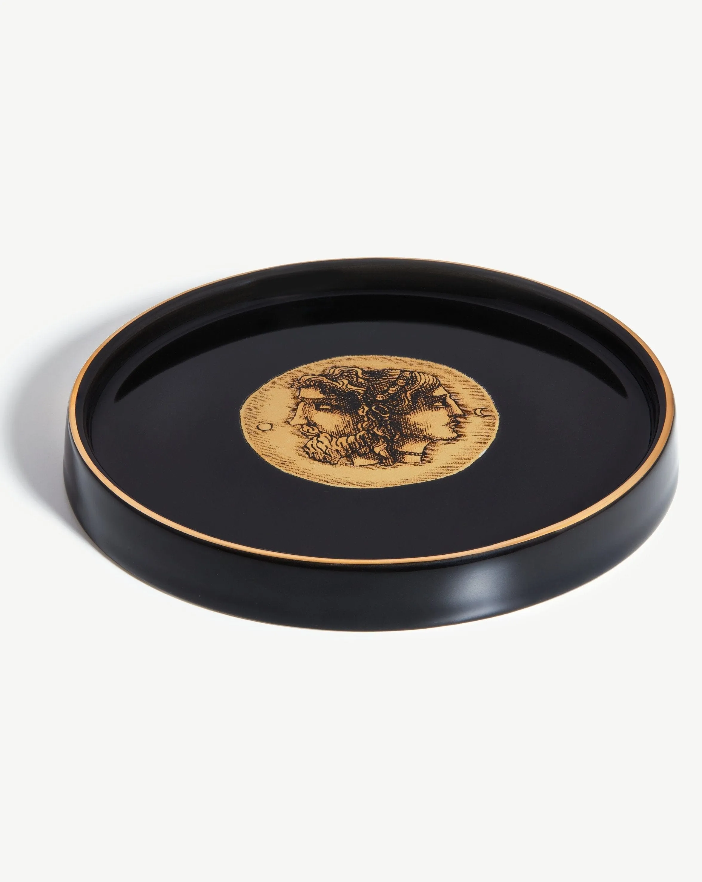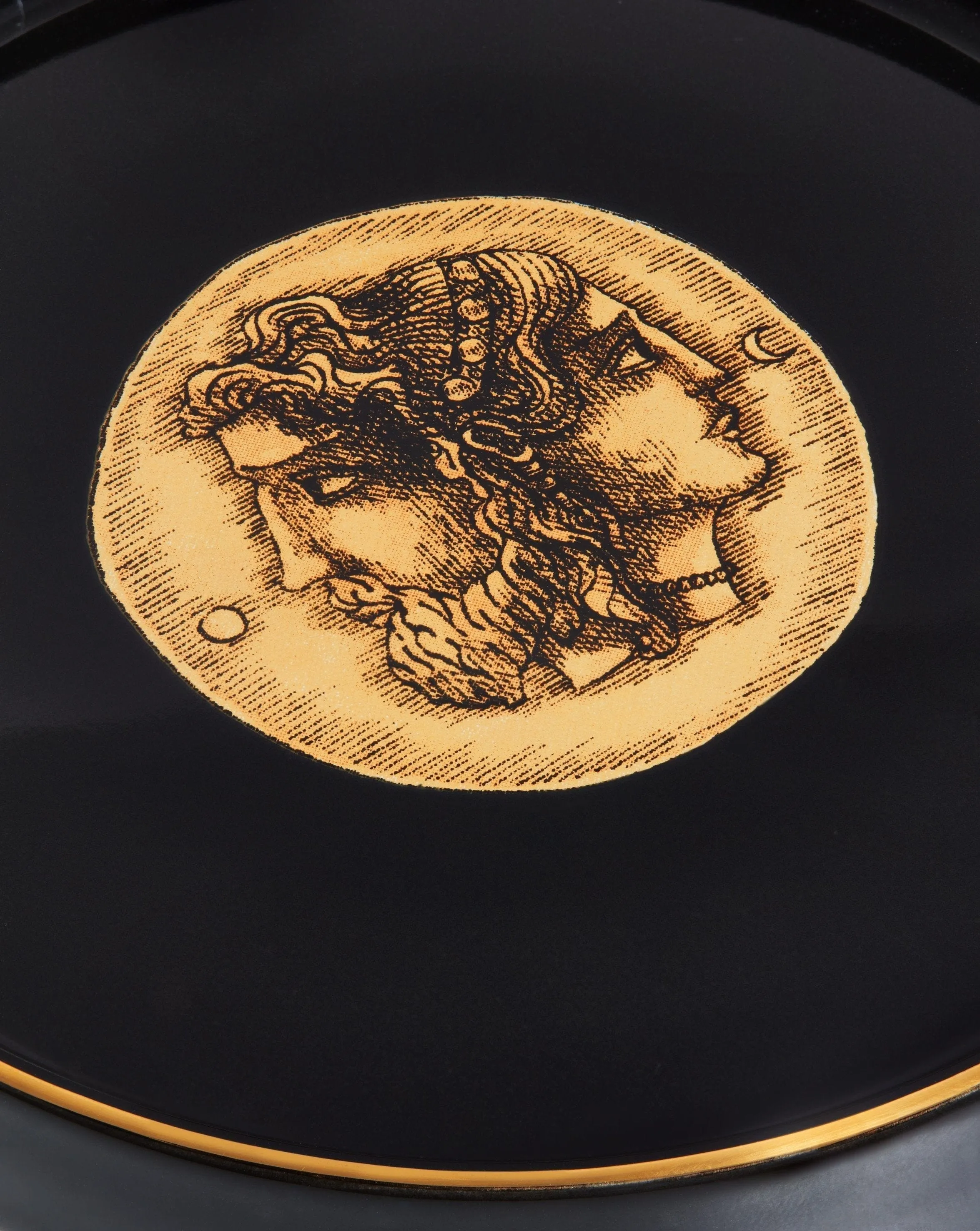 A decorative black and gold round ceramic trinket tray with a hand painted gold finish; this tray has a bespoke screen print design of a male and female face to represent duality.