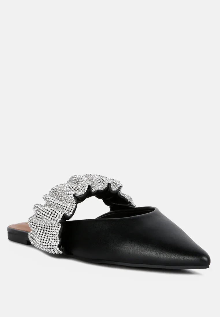 Pointed-toe everyday flats with a diamante embellished textile strap that holds to feet well. The pointed toe is relieved from heeled pumps when you want to walk all day stylishly!