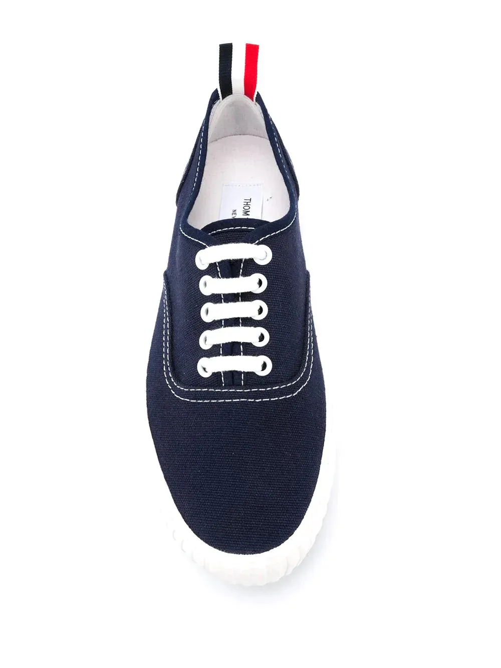 Step into timeless style with Thom Browne's Heritage Sneaker In Canvas. Crafted in navy low-top cotton canvas, these sneakers exude understated elegance. The signature tricolor grosgrain pull-loop at the heel collar adds a touch of distinction, while the white lace-up closure and contrast stitching complete the look. The treaded rubber sole in white features an embossed logo at the heel, ensuring both comfort and a refined finish. Embrace the perfect blend of classic design and contemporary appeal with these versatile sneakers.