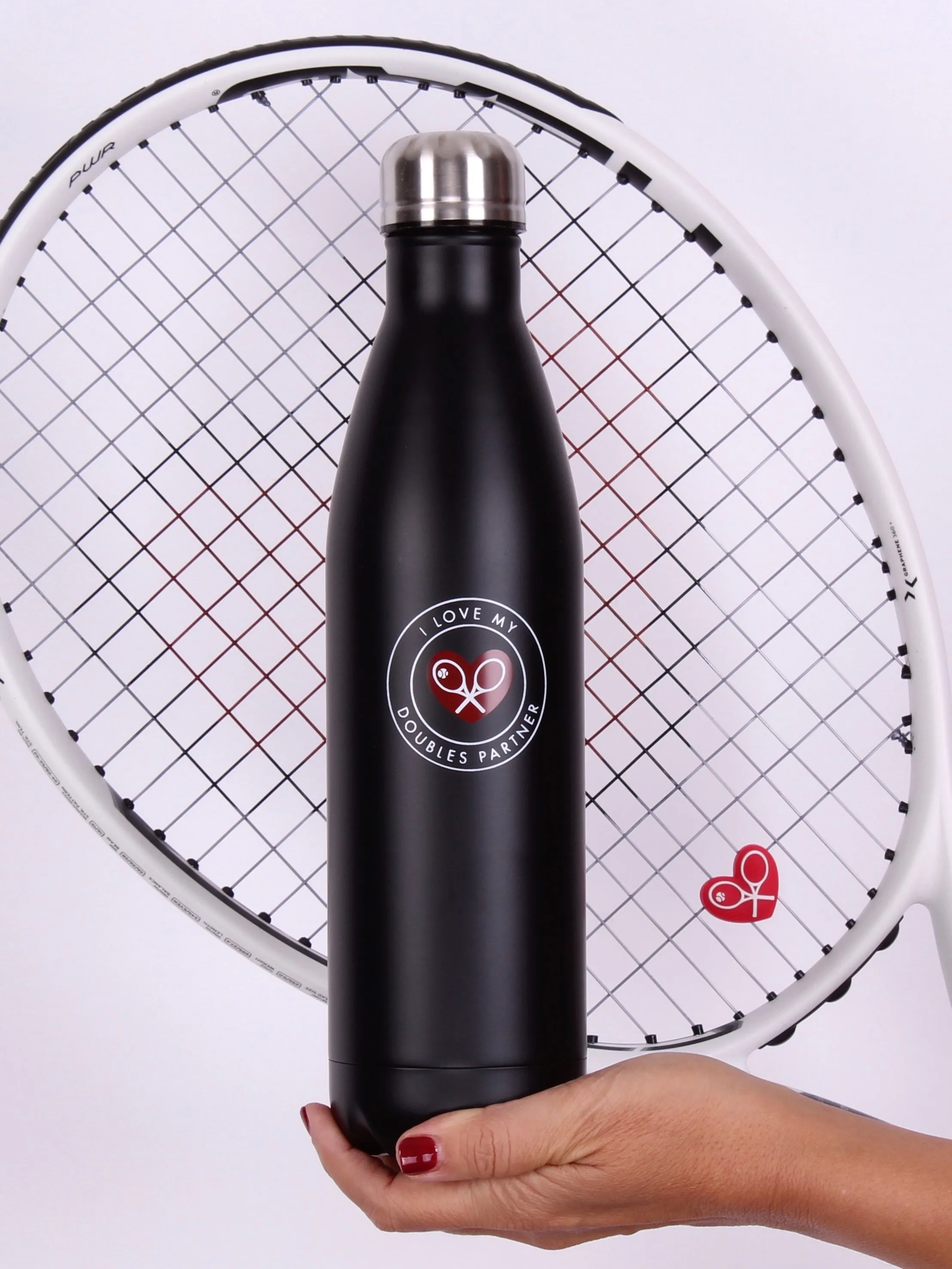 This awesome bottle has the Heart Rackets trademark logo of "I ❤️ MY DOUBLES PARTNER!!!"
