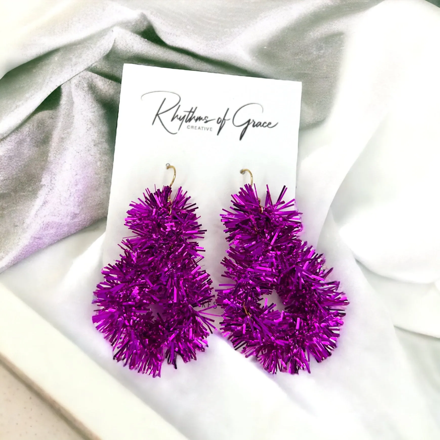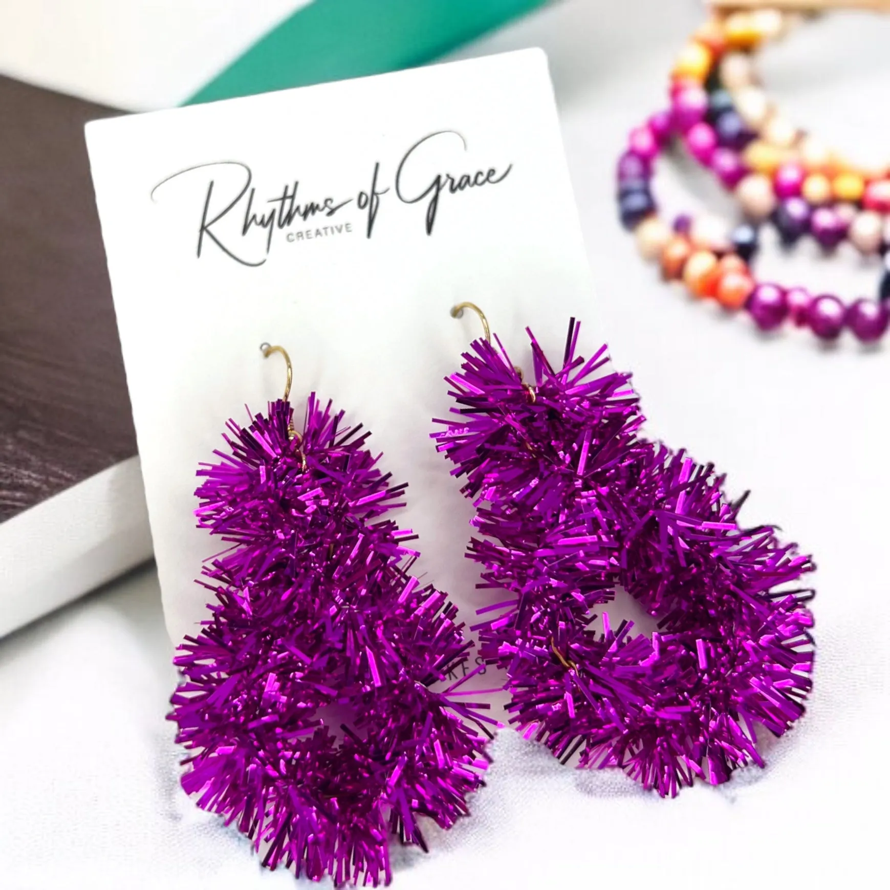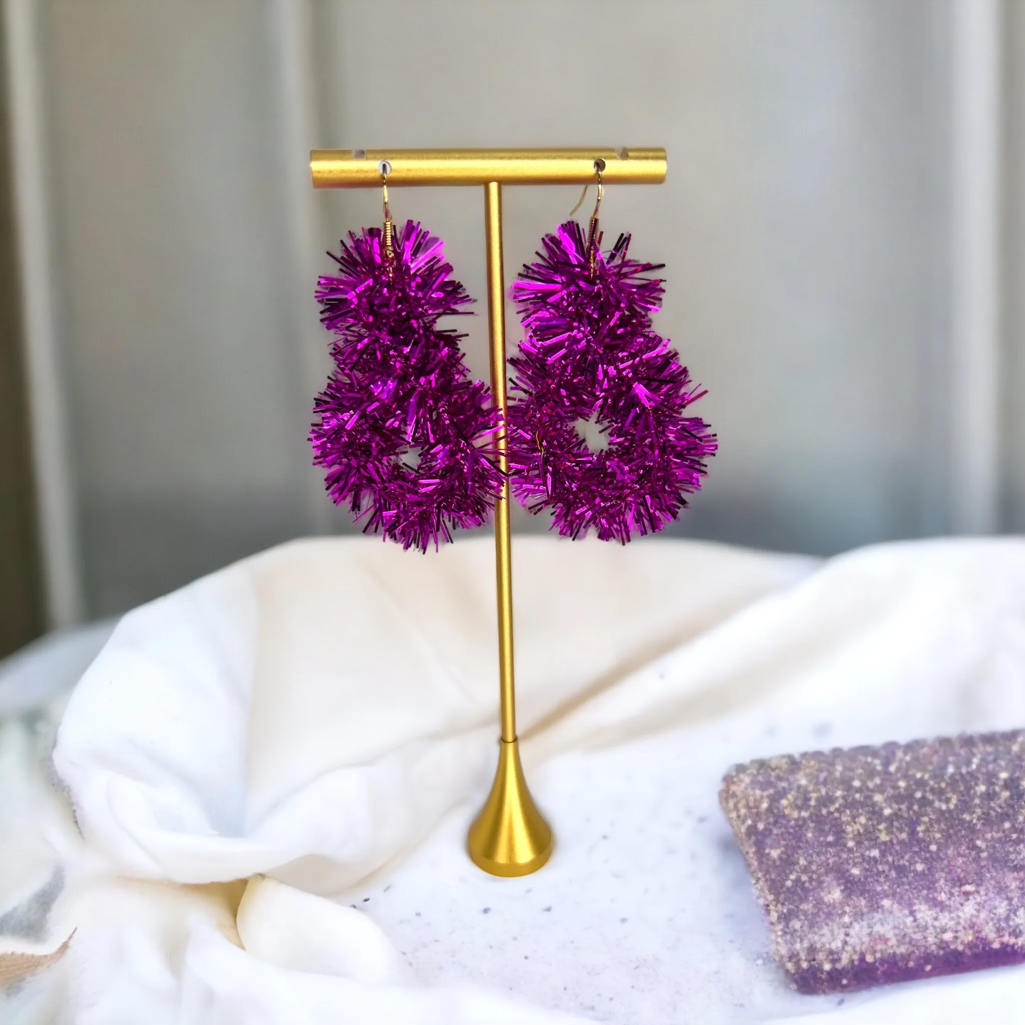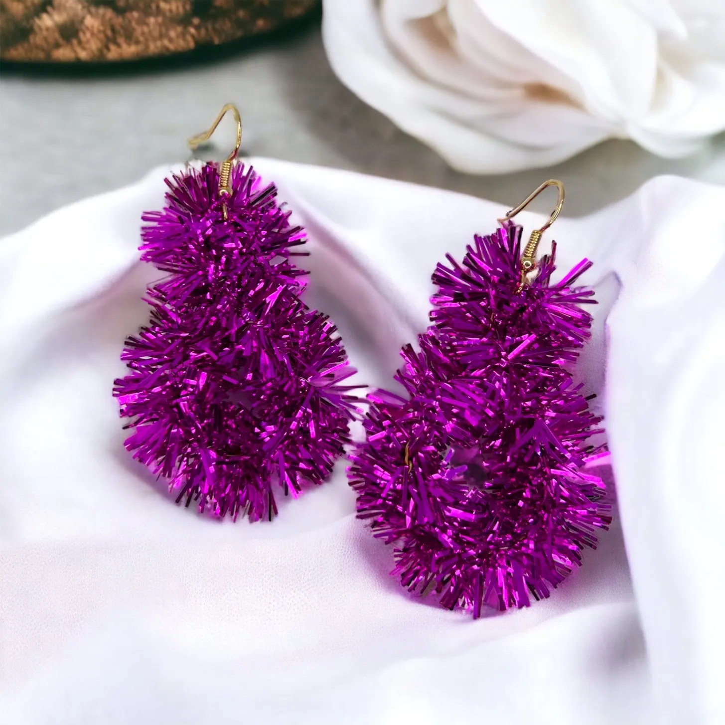 Elevate your glamour quotient with our hot pink tinsel dangle earrings, designed to catch the light and turn heads. These eye-catching accessories feature cascading tinsel strands in a bold and vibrant hot pink hue, creating a dynamic and captivating movement with every step you take. Make a statement and add a touch of playful elegance to your look with these dazzling earrings that are perfect for special occasions and festive moments.