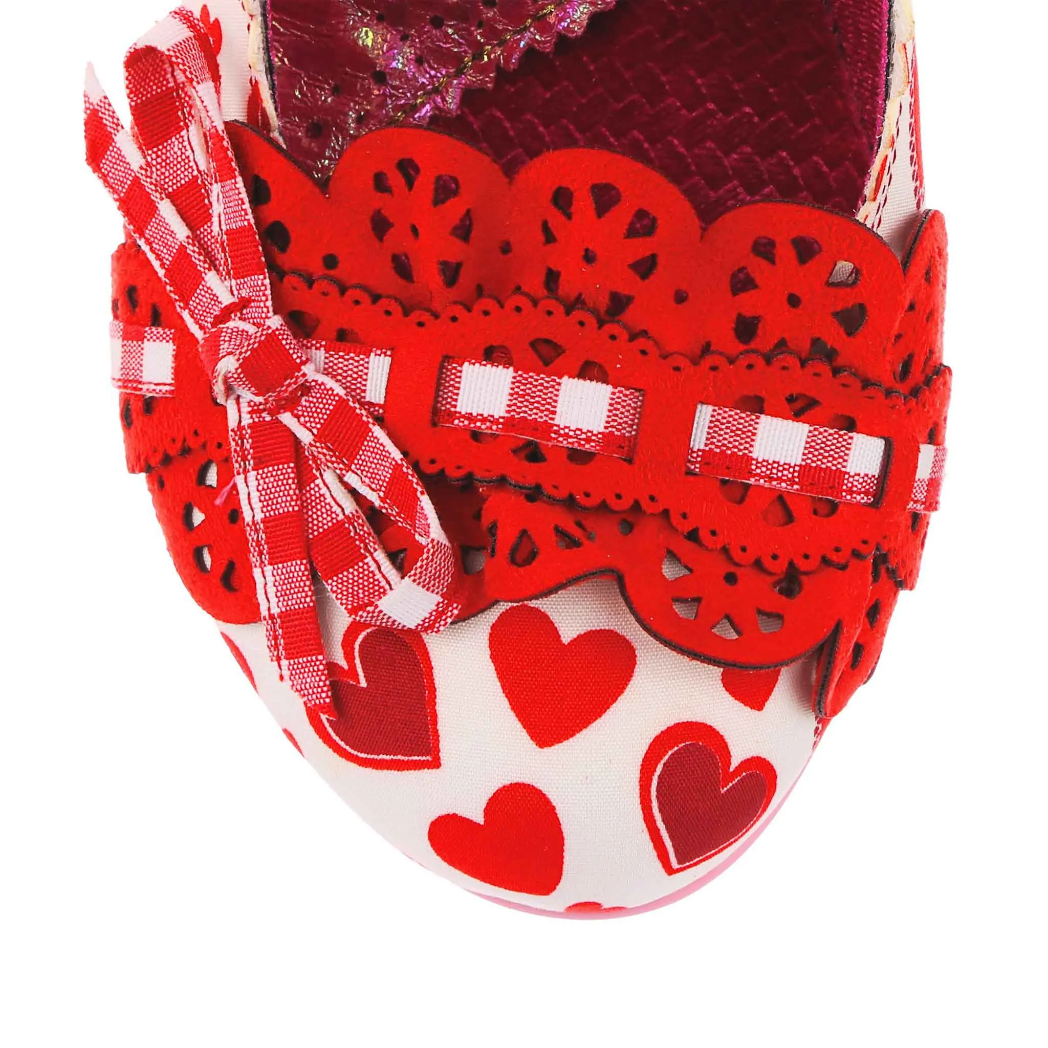 Can you feel the love in the air? These adorable heels are sure to make your heart thump! A fabulous and romantic white and red heart print fabric is paired with matching gingham for a truly dreamy shoe! The heel is encrusted in bright red glitter, which matches the stunning red lacey detail on the toe! Topped off with a delicate gingham bow, and cute scalloped edges - these lovelies are not to be missed!