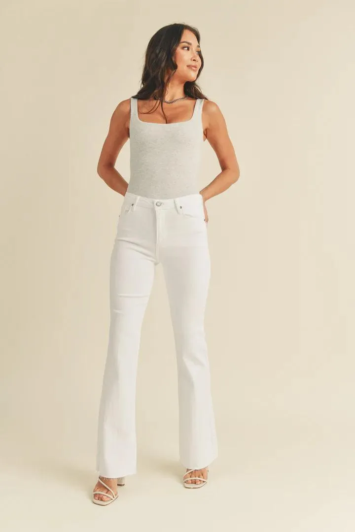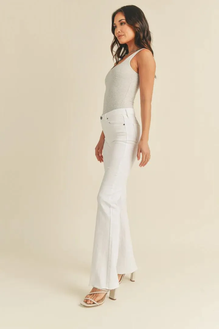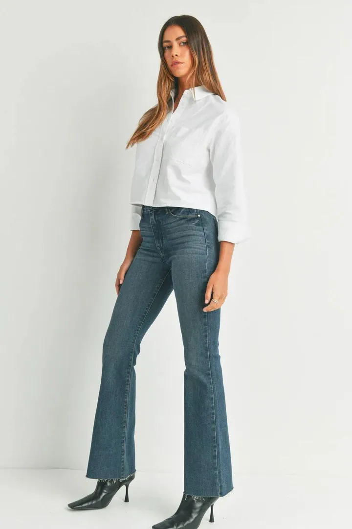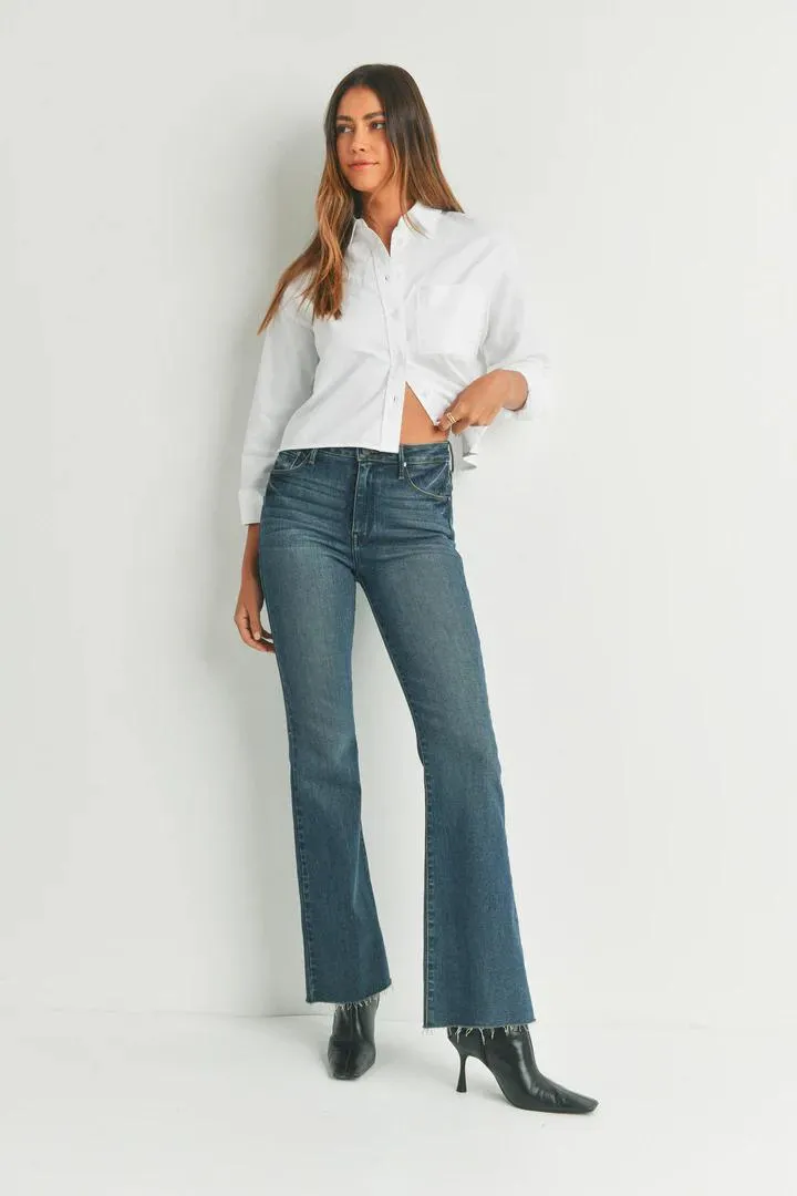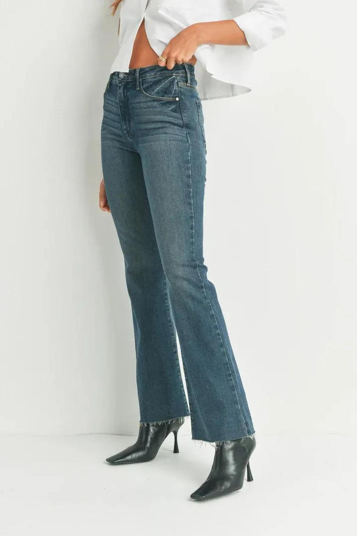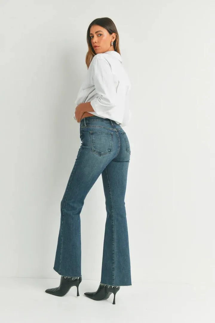 Featuring a high-rise waist and a flare leg, these jeans are both trendy and timeless.