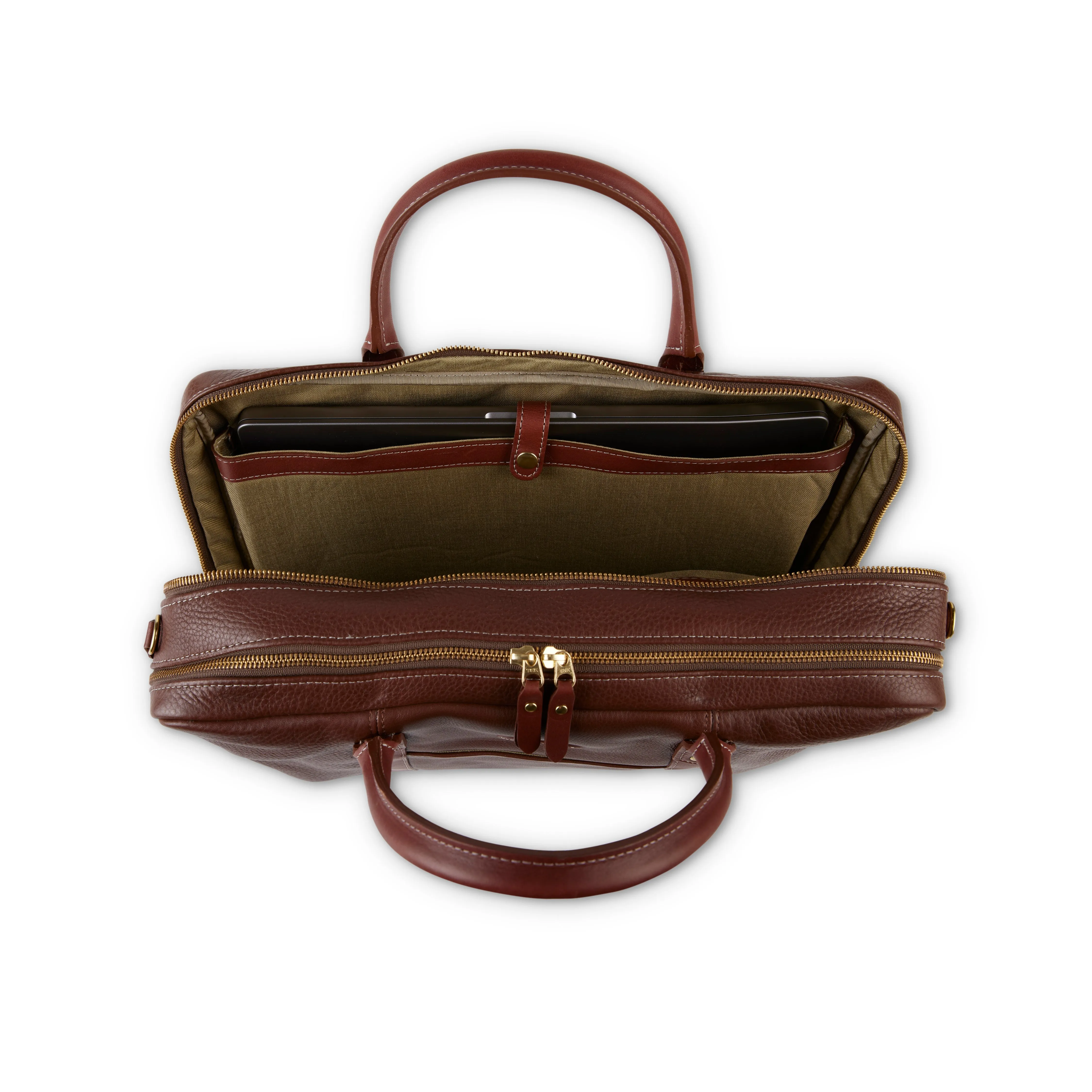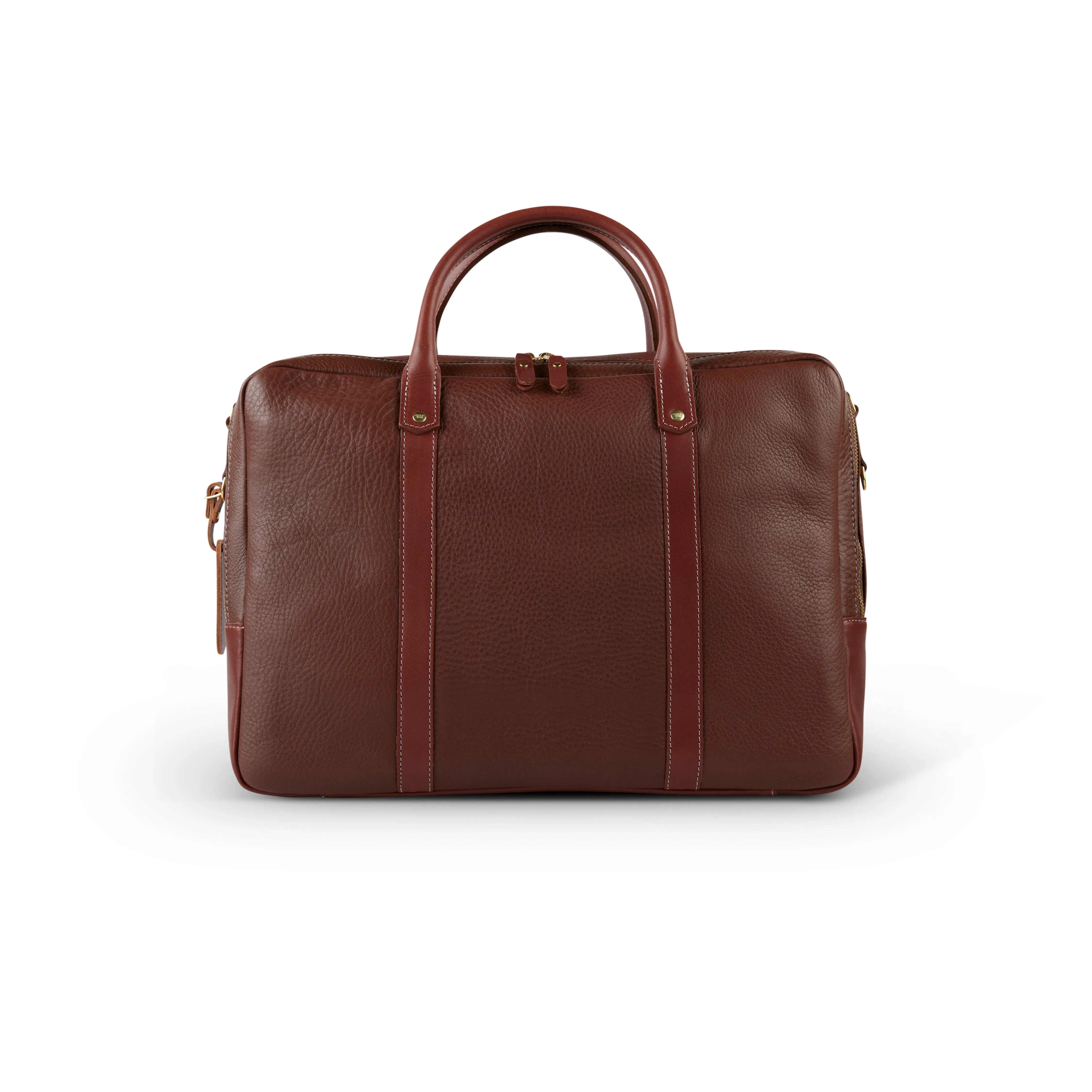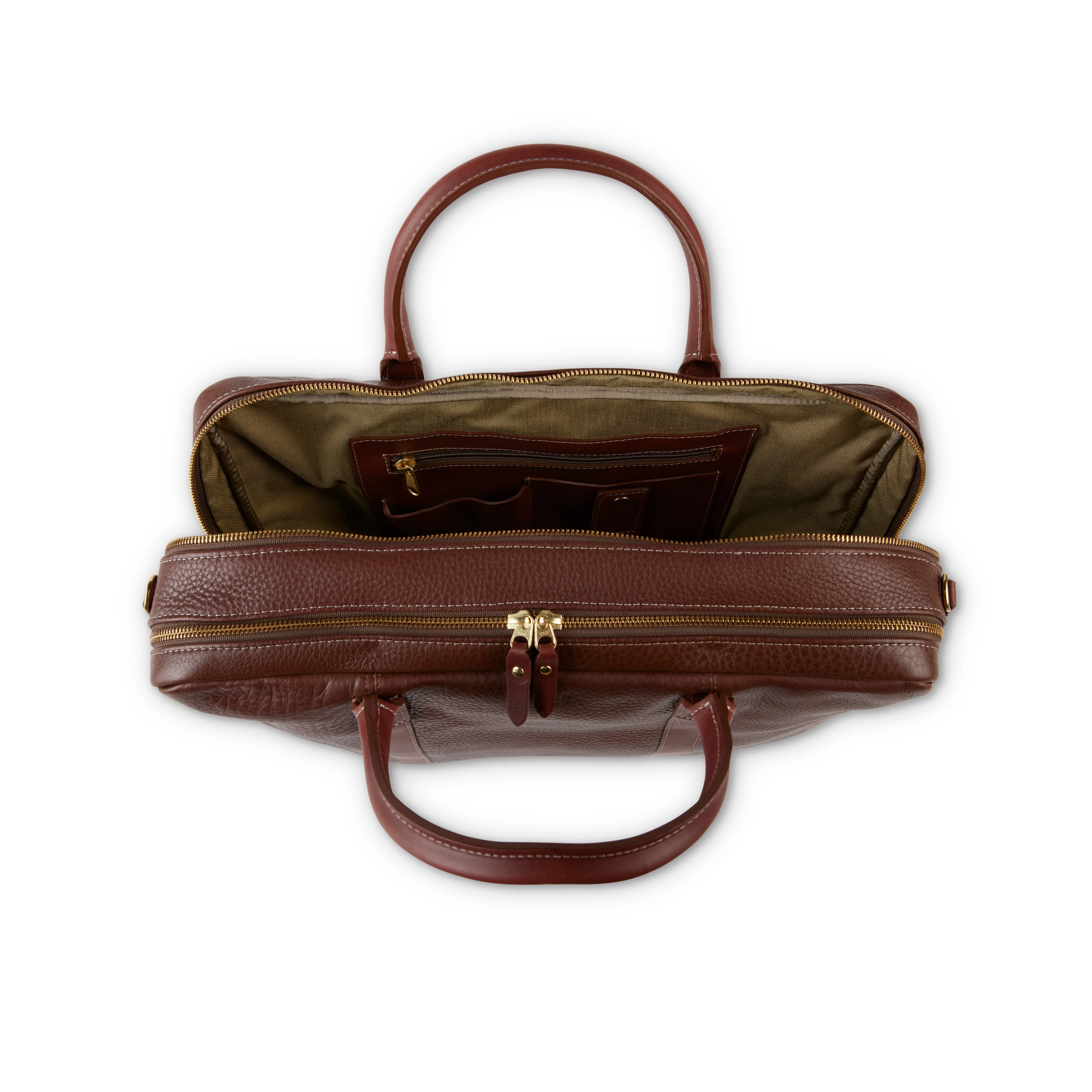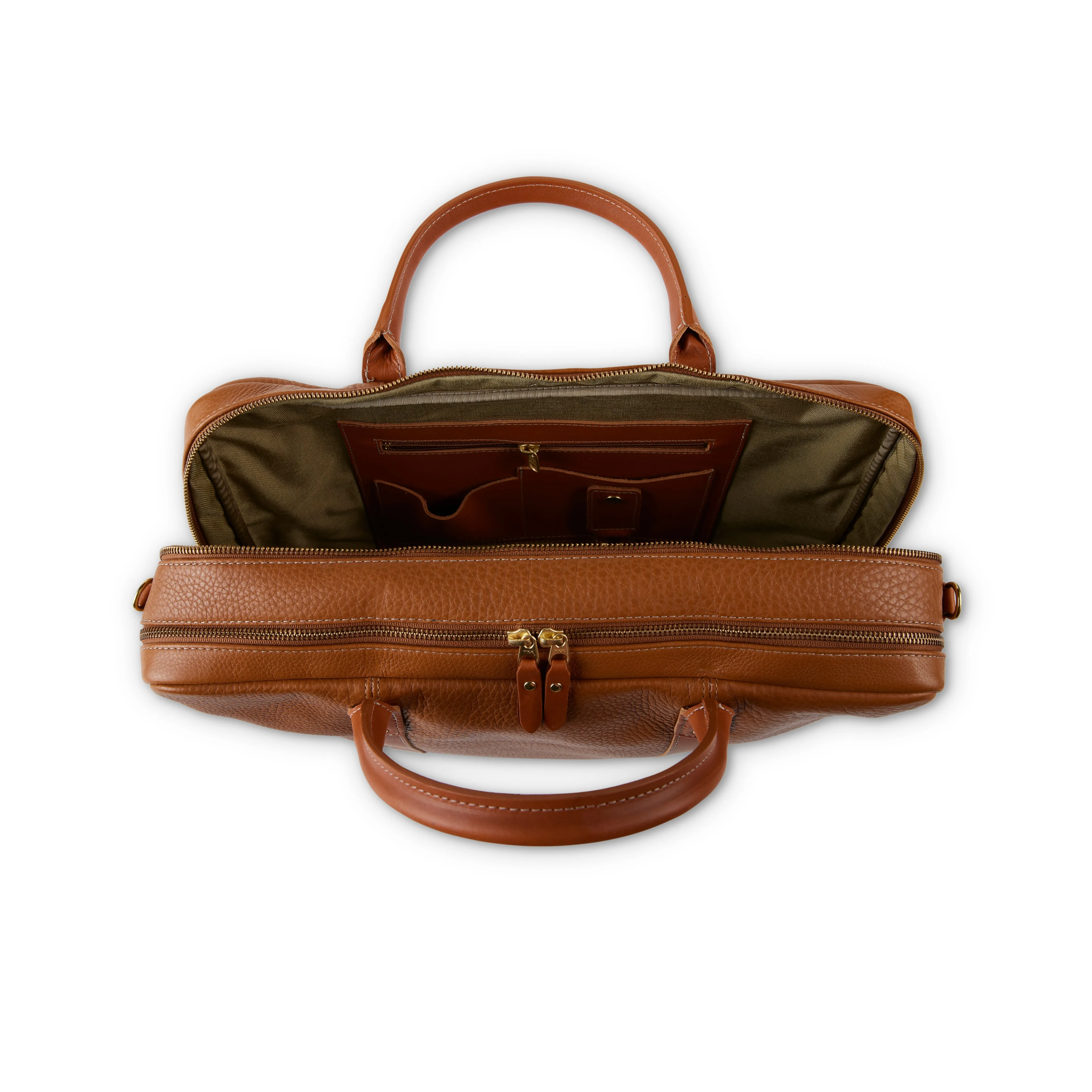 Our Justus Collection would not be complete without our discerning take on the everyday essential briefcase. Crafted from the finest Docil leather, it boasts two large zip compartments with double-way zippers for ultimate convenience. Carefully considered for the businessman or woman’s needs, it also features a padded laptop sleeve in one compartment and leather organization details on the opposite compartment. As well as an outer sleeve pocket for quick access. It is a great gift for the hard worker on the go and includes a removable fob you can personalize.