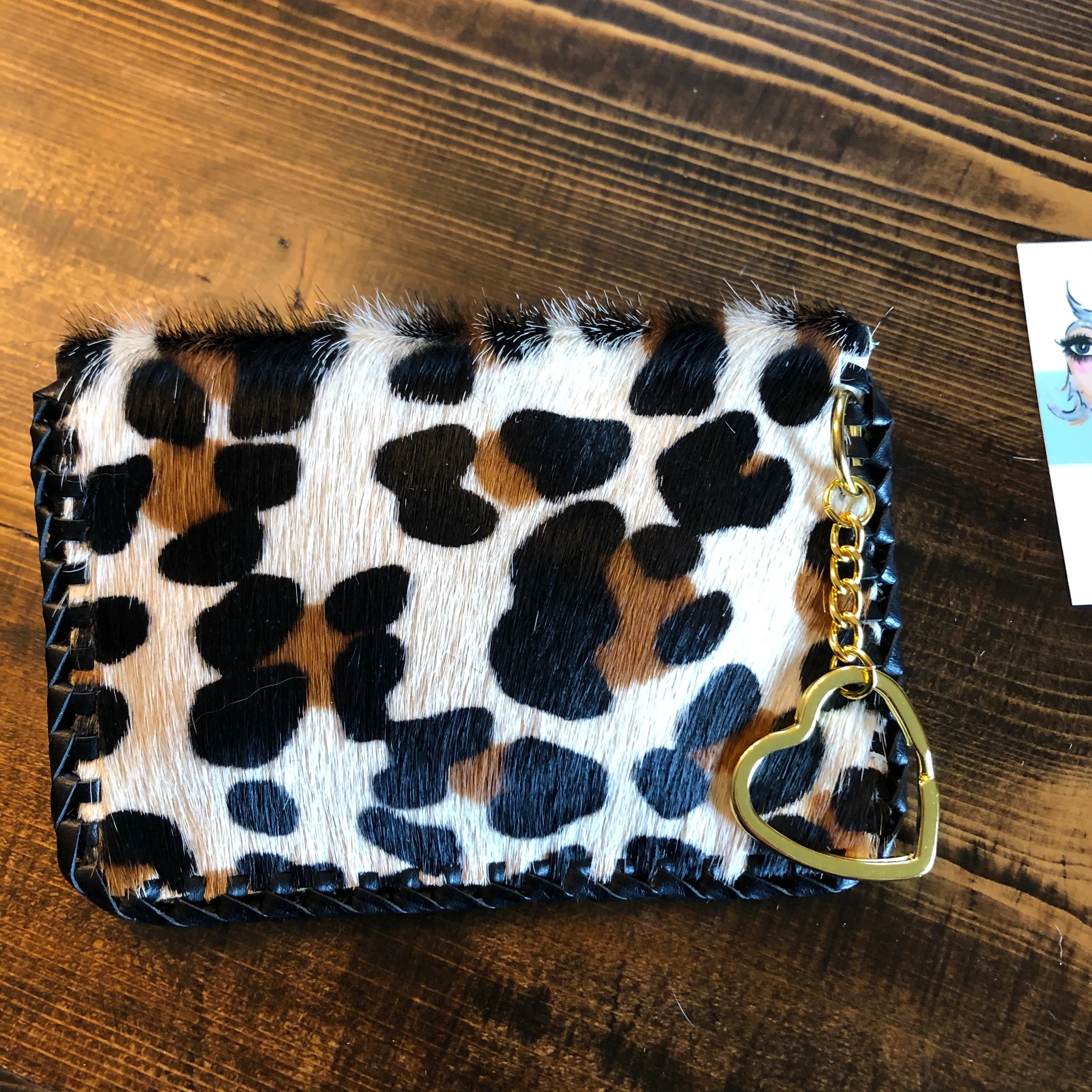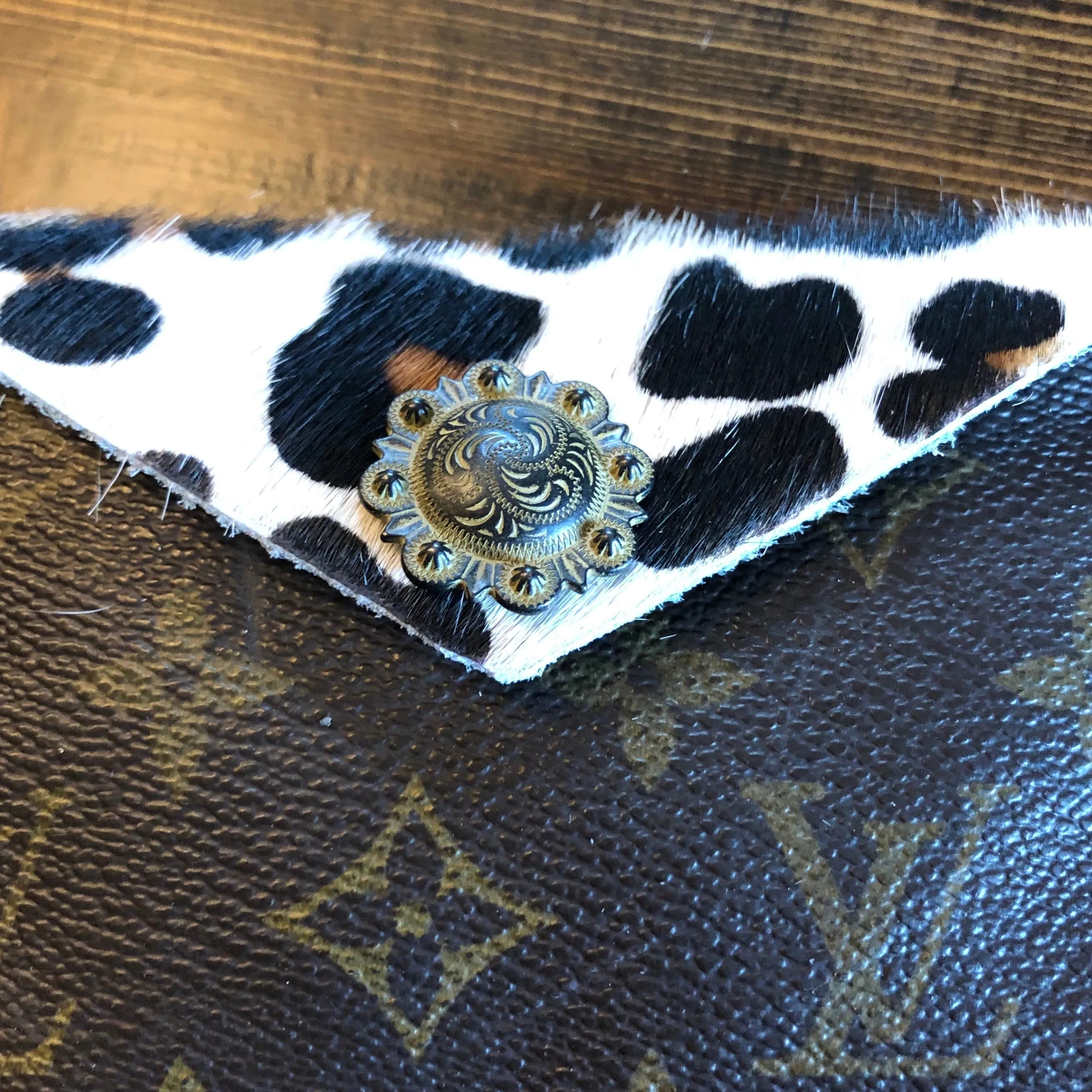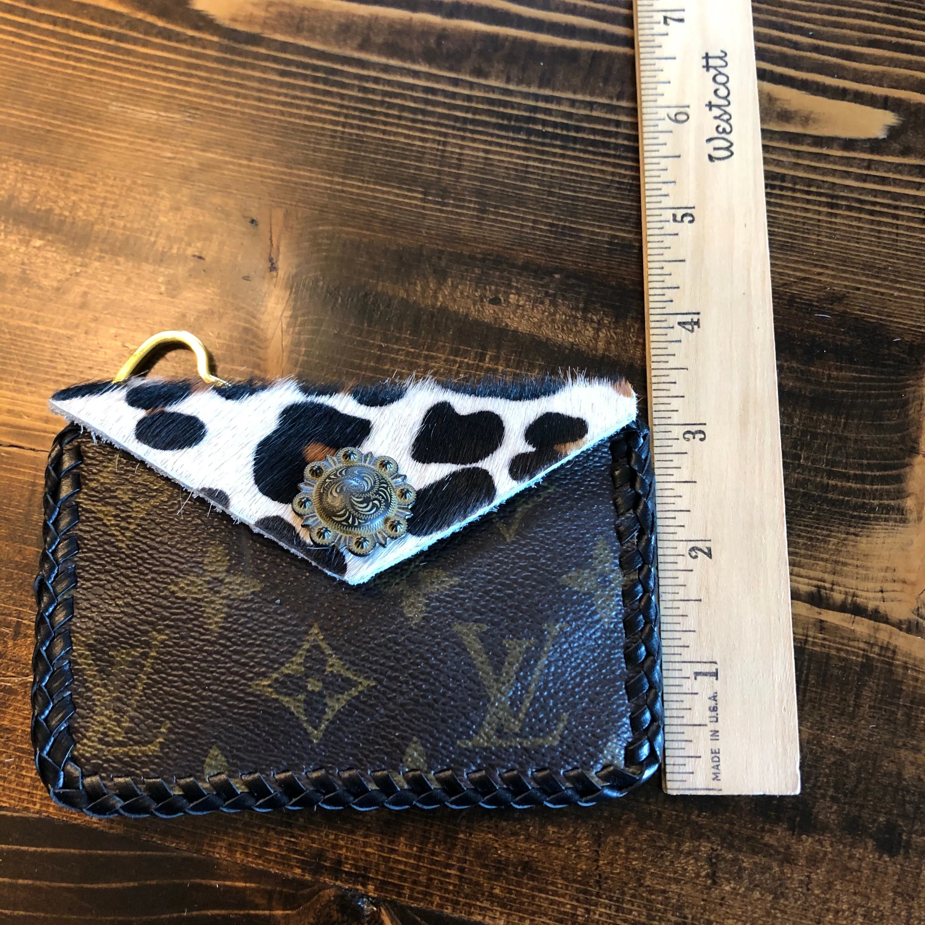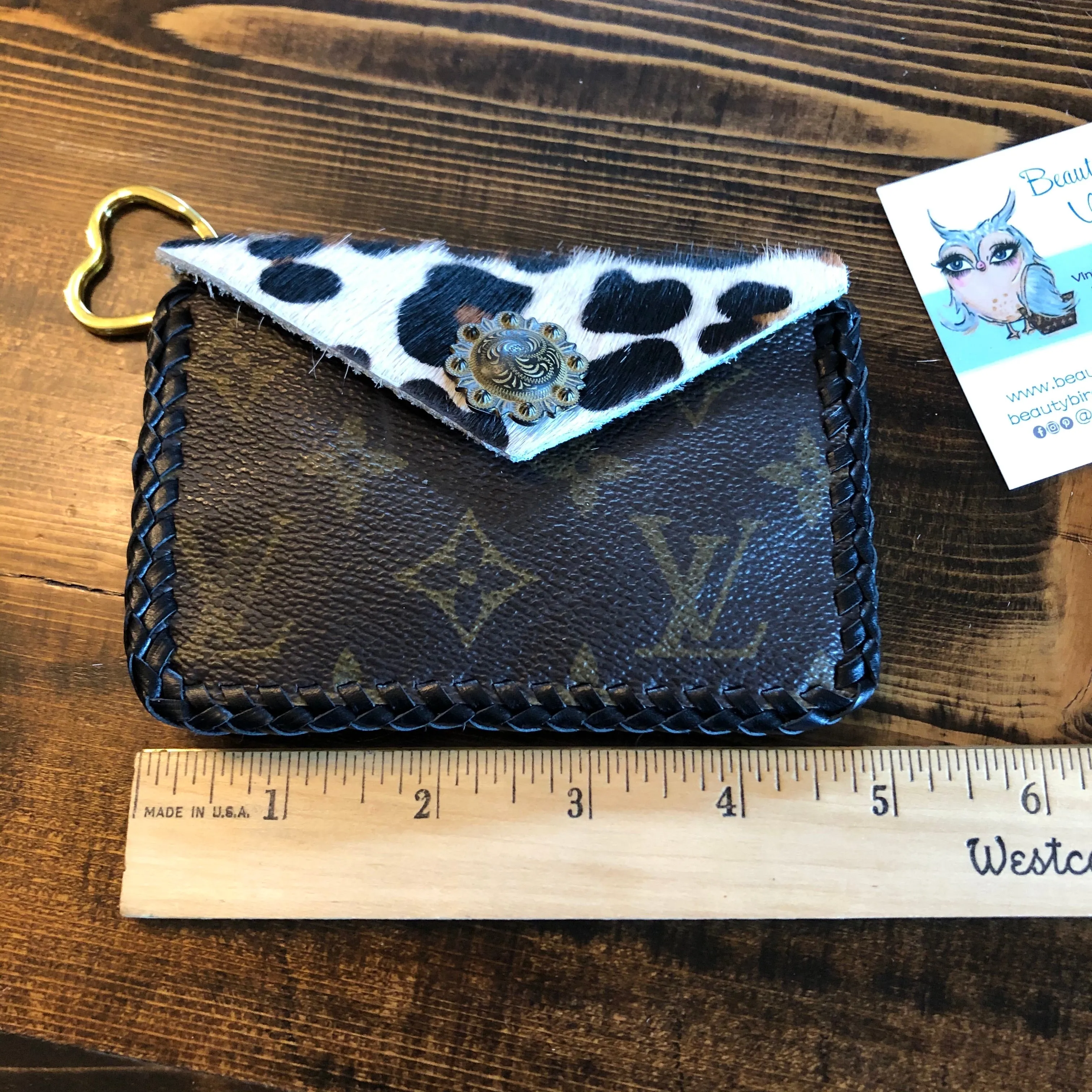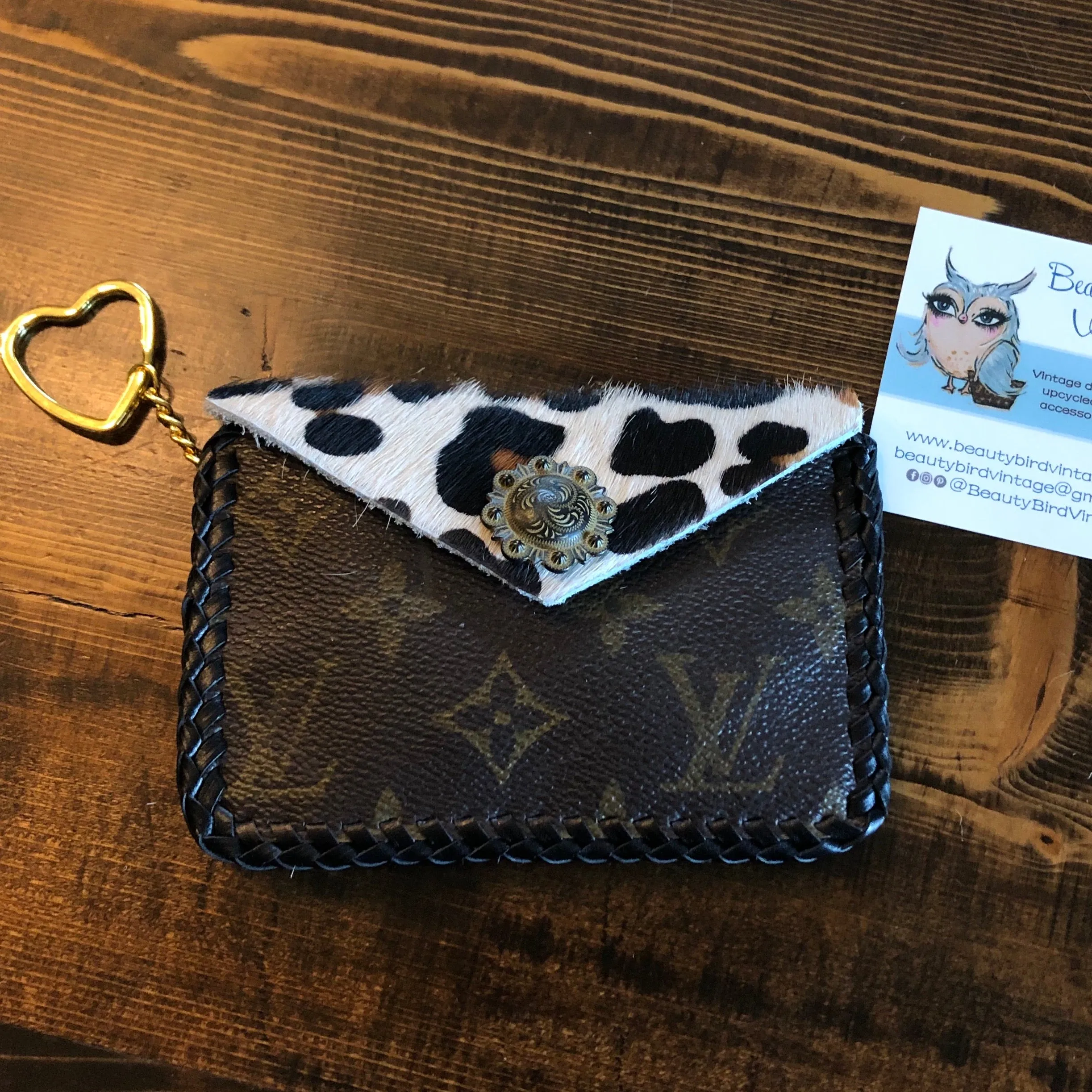 As always, an authentic Louis Vuitton bag was used along with a gorgeous hair-on-hide leopard print leather. The outside edge is black leather which has been laced by hand. There is a gold D-ring securely holding the heart-shaped key ring at the end of a chain. A black/gold vintage snap completes this look.